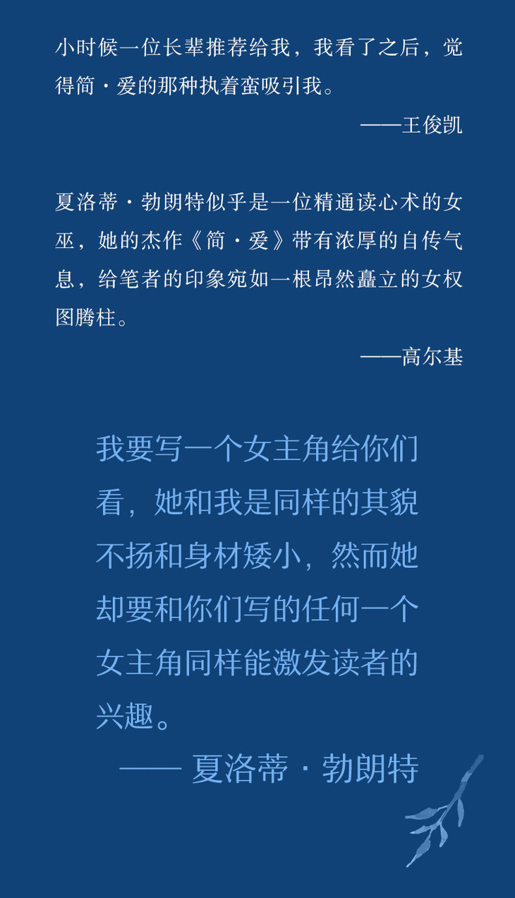 夏洛蒂·勃朗特似乎是一位精通读心术的女巫,她的杰作《简·爱》带有浓厚的自传气息,给笔者的印象宛如一根昂然矗立的女权图腾柱。(高尔基)