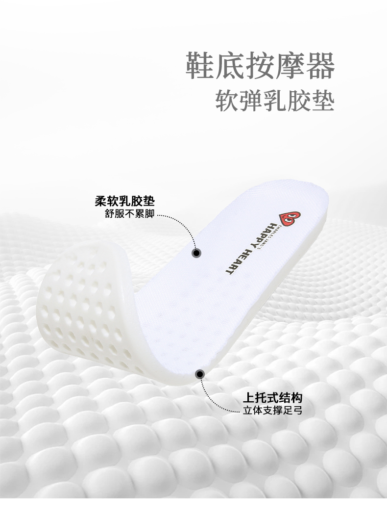 2. 按摩托举:全掌软弹乳胶垫主动贴合足底,特别是足弓处的上托式结构,提供立体支撑,稳稳承托,将舒适“从足弓漫到脚尖”