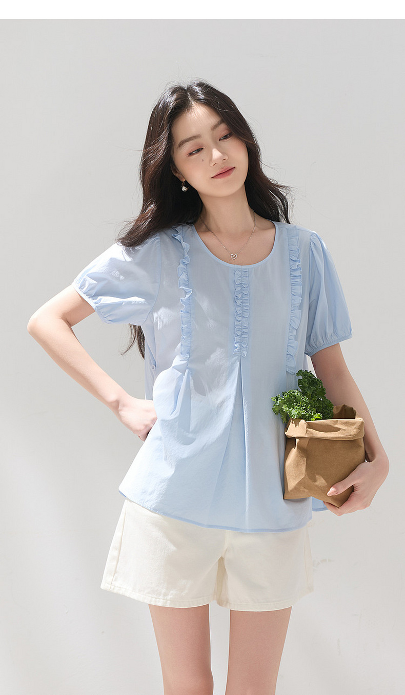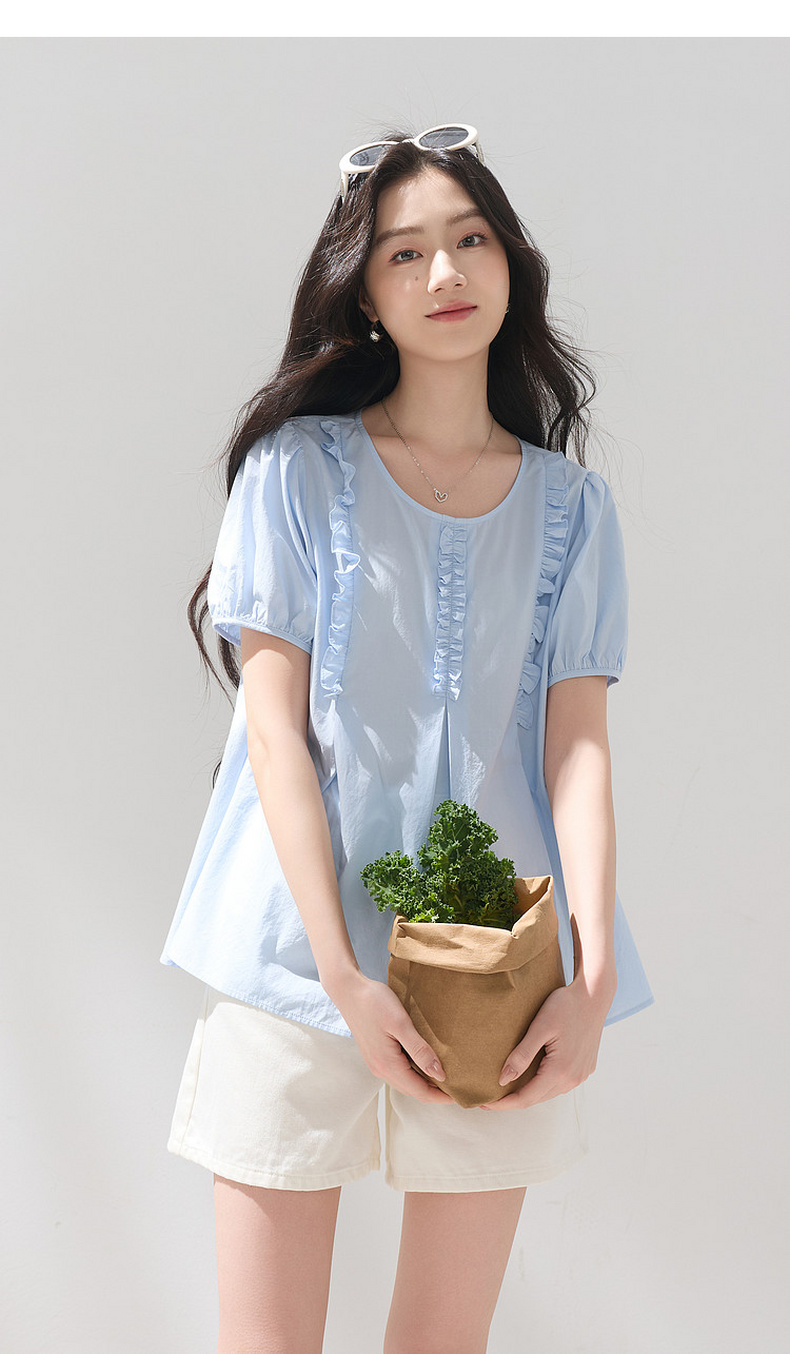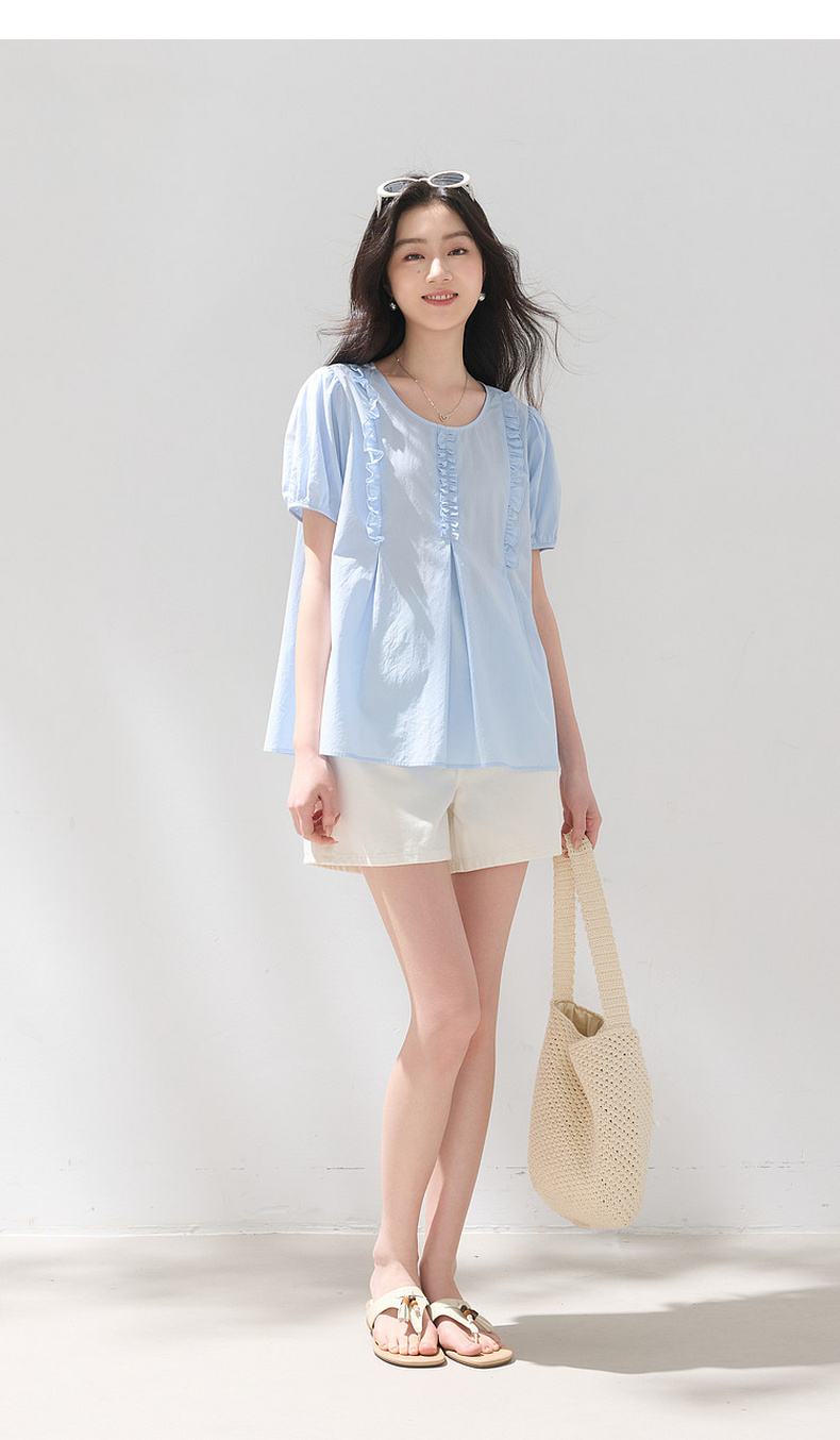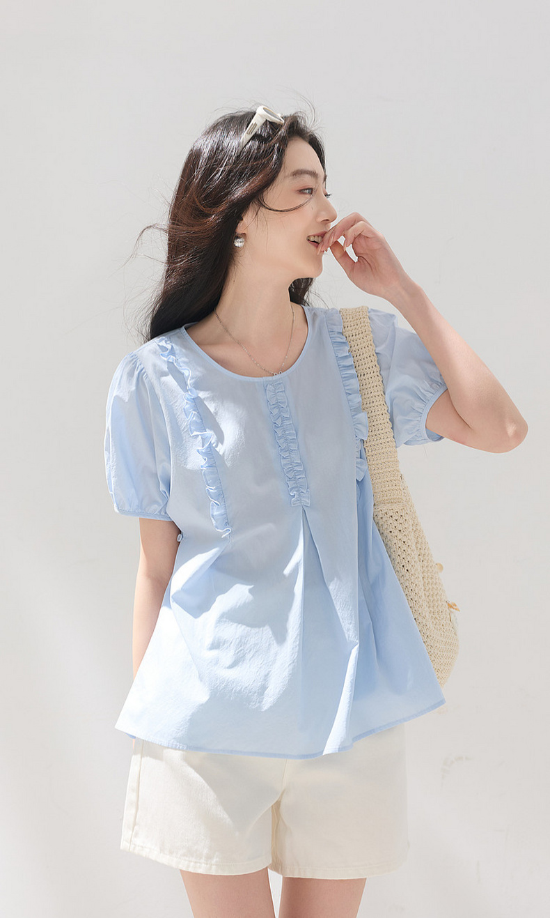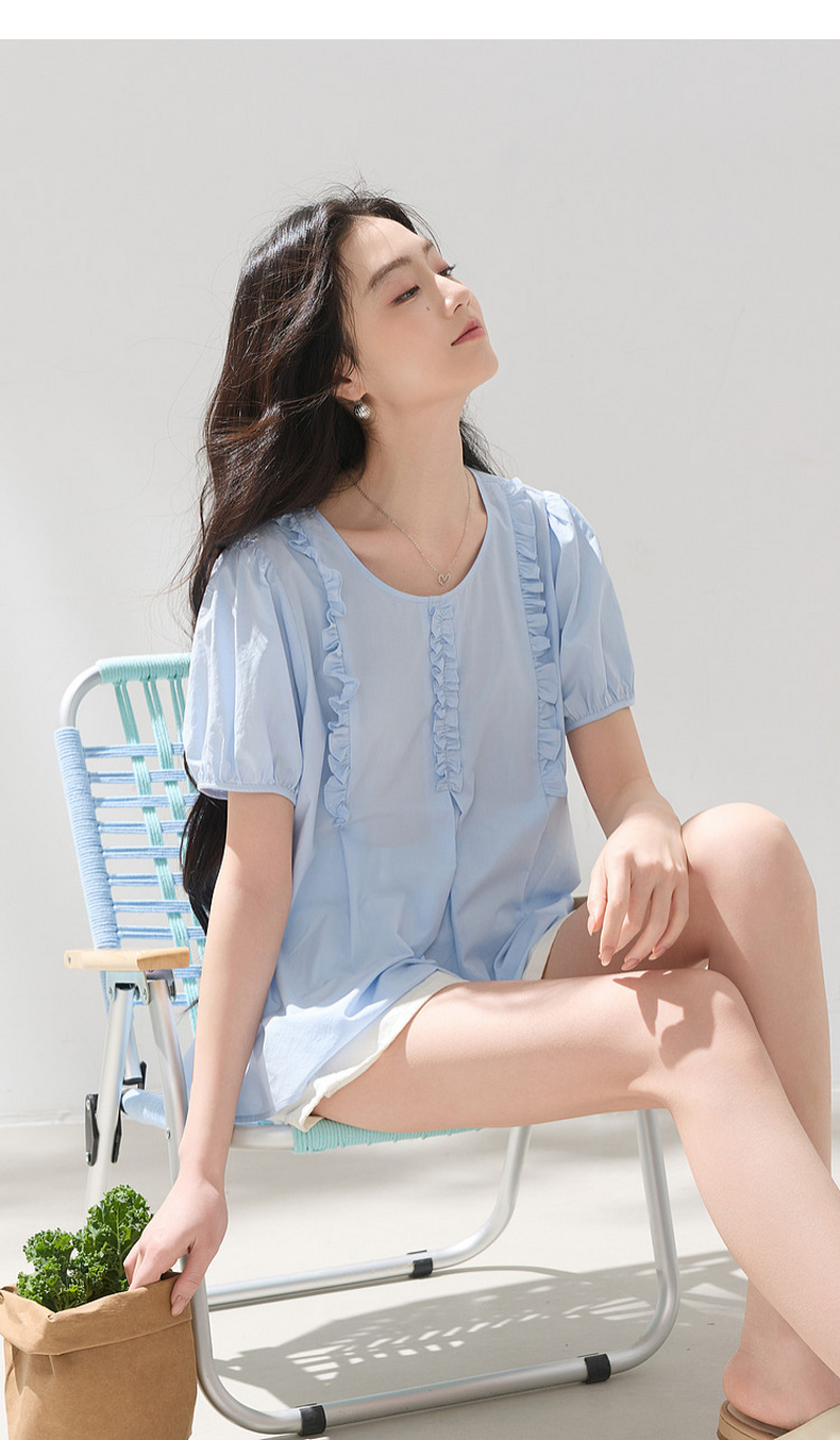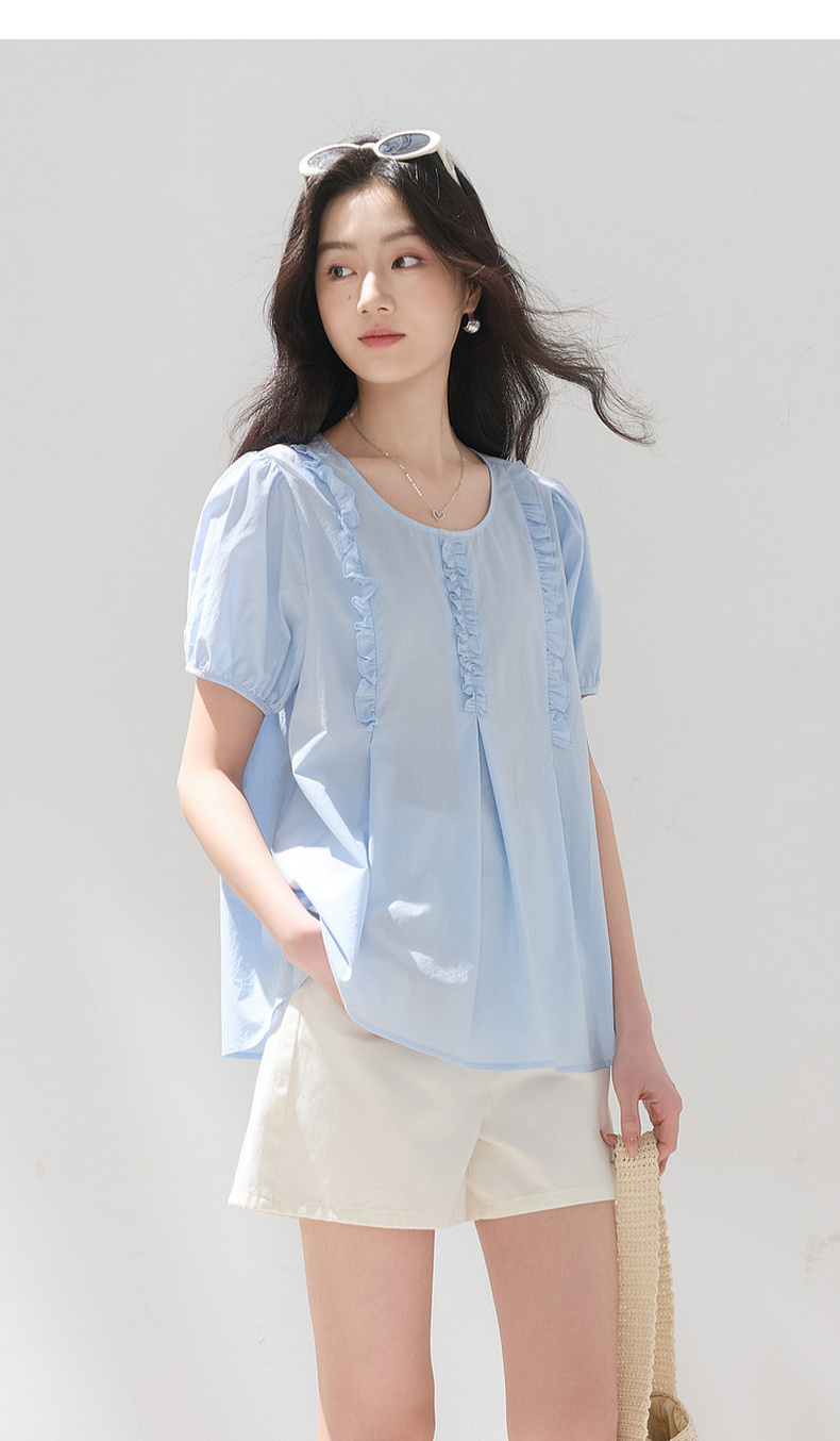 三彩2026夏季新款木耳边圆领泡泡袖小衫宽松娃娃衫清新上衣M