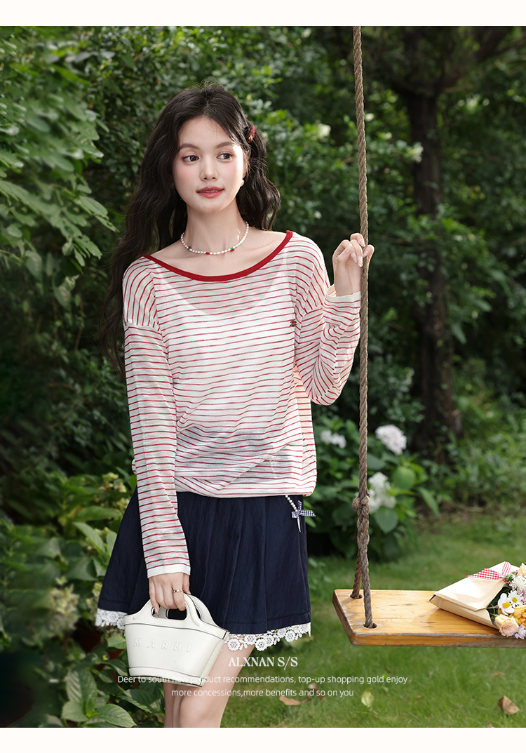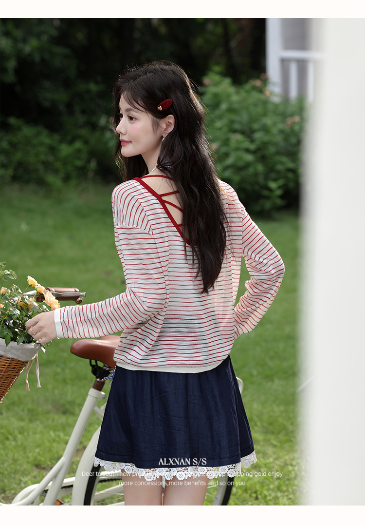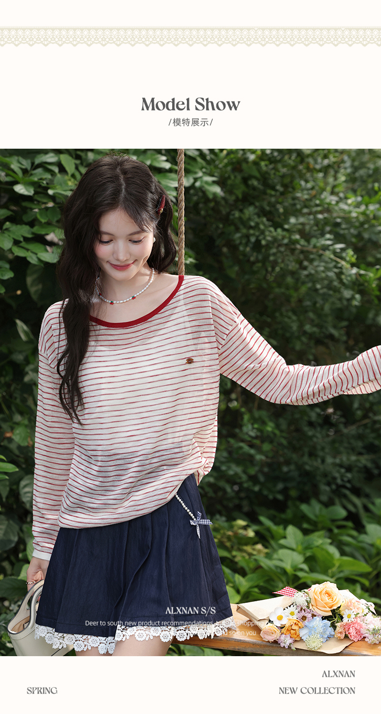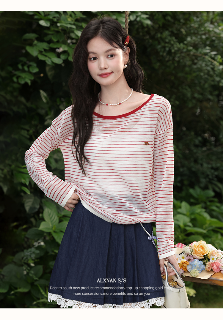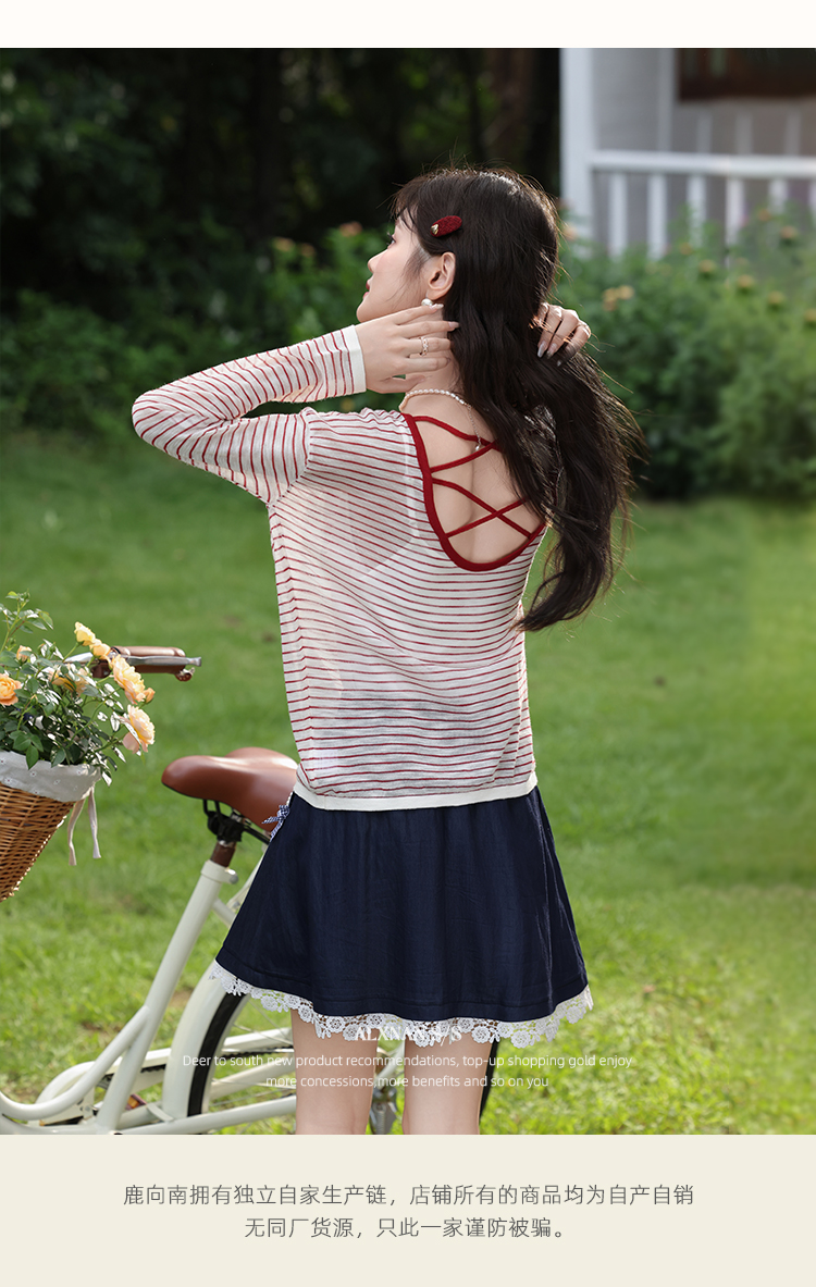 鹿向南「香颂微光」红色条纹防晒罩衫长袖T恤女夏空调衫宽松上衣