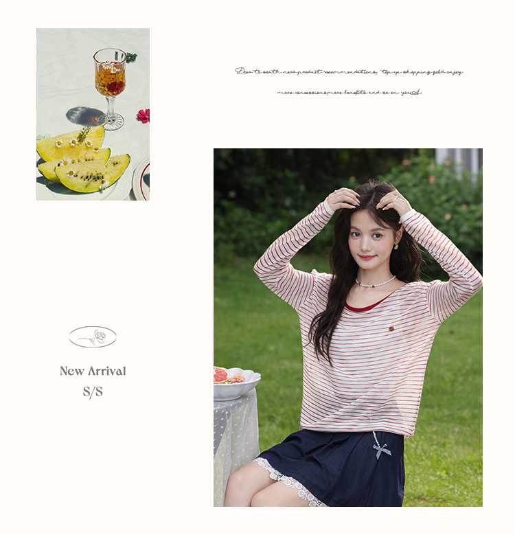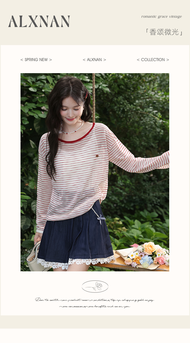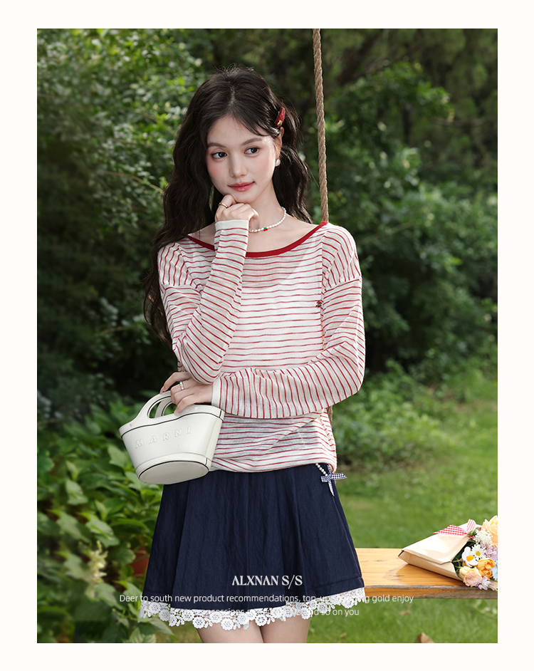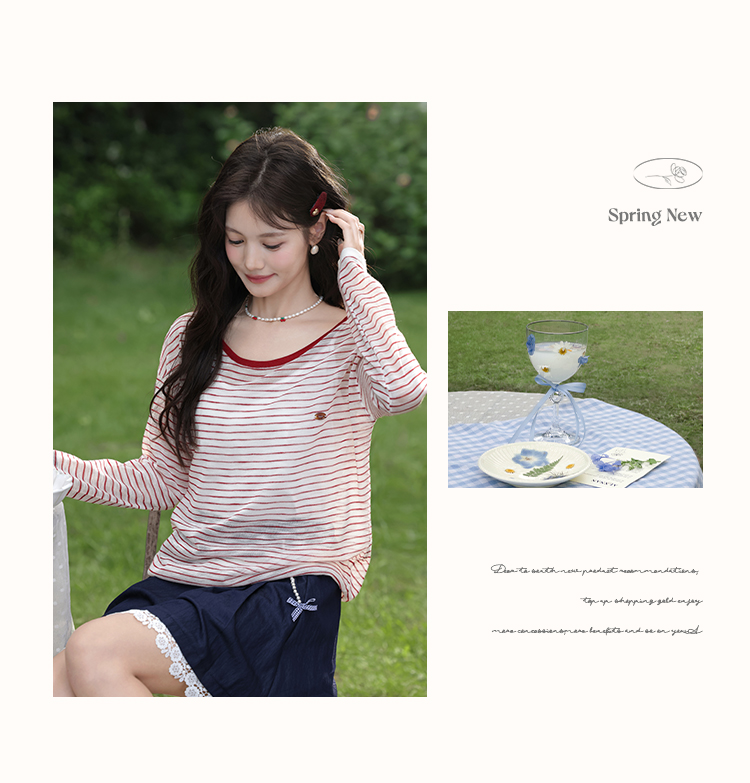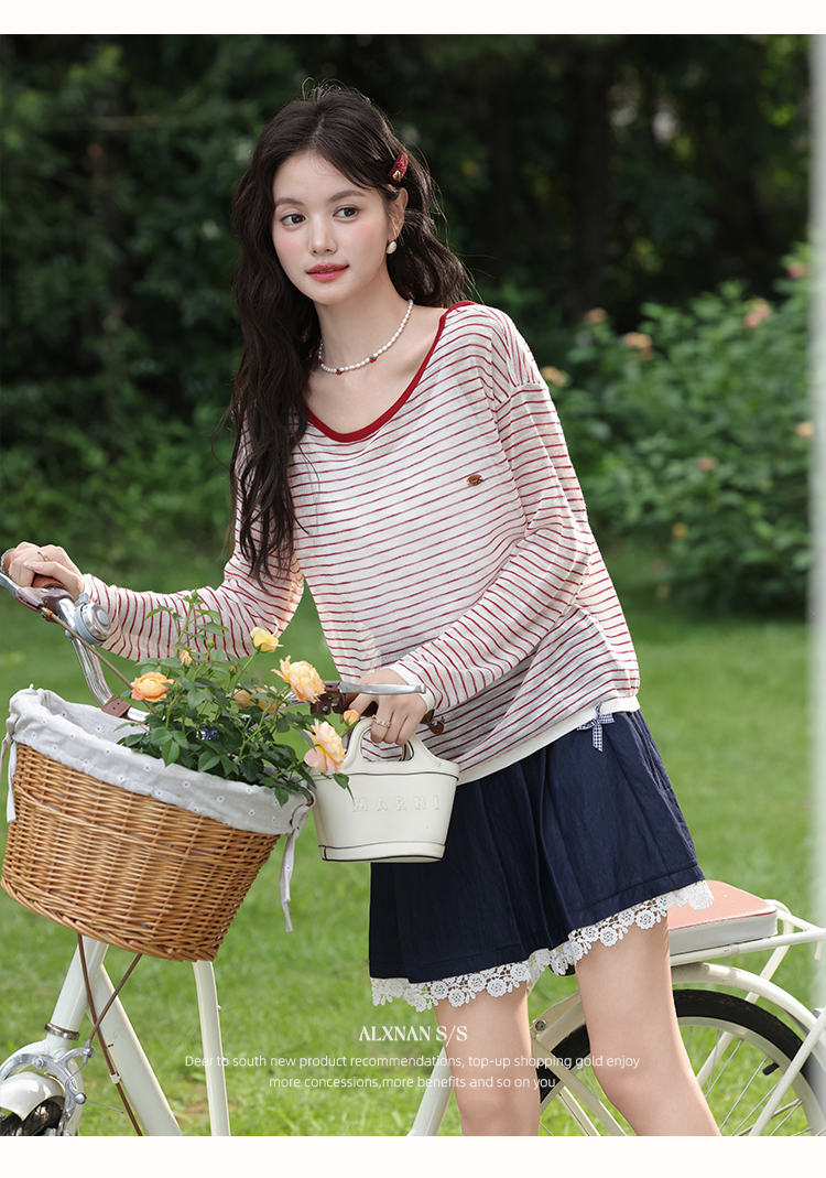 鹿向南「香颂微光」红色条纹防晒罩衫长袖T恤女夏空调衫宽松上衣