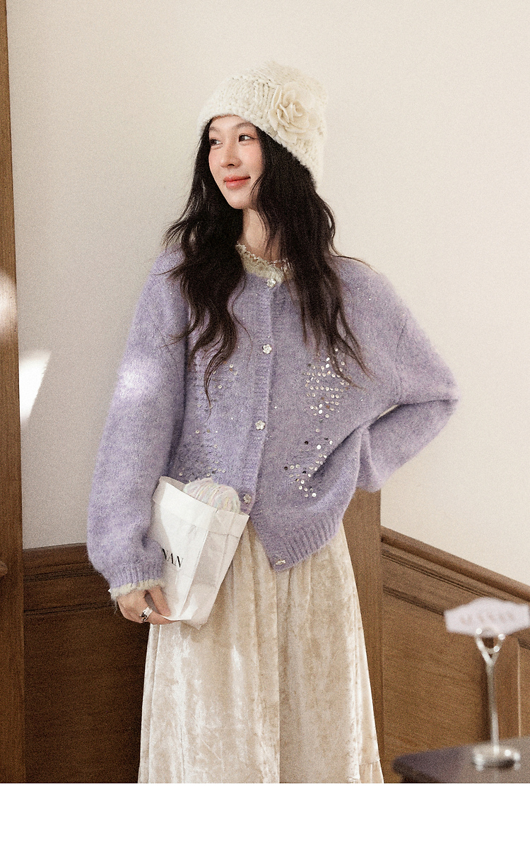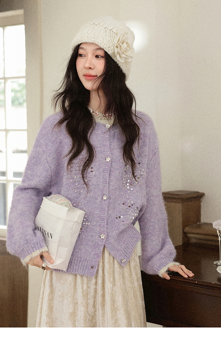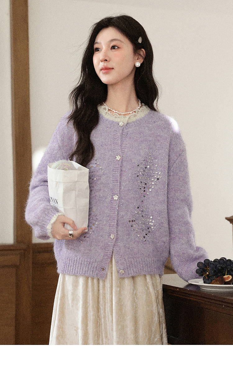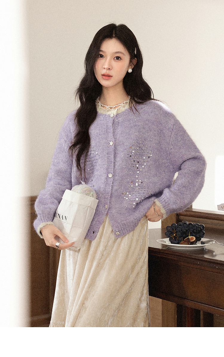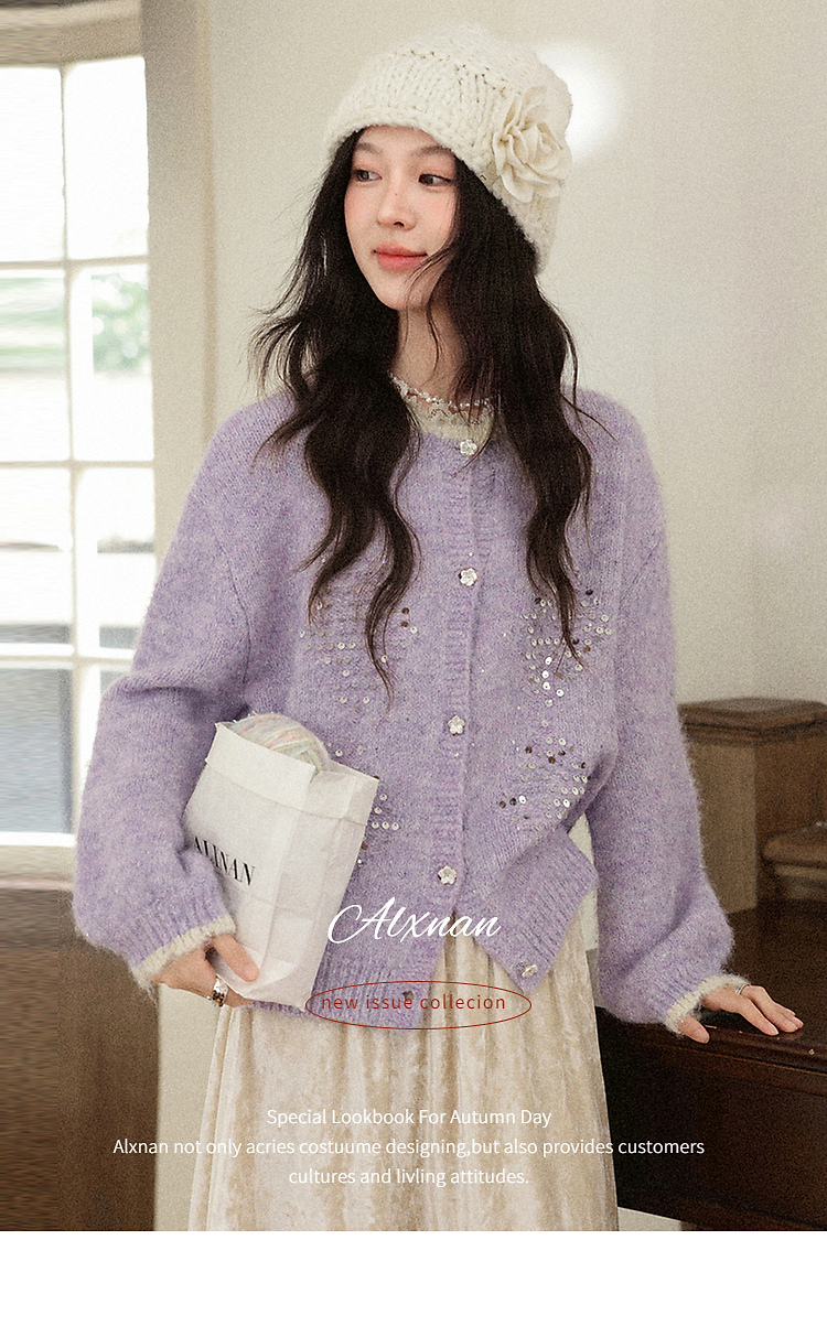 鹿向南「木槿」氛围感亮片紫色针织毛衣显瘦减龄开衫上衣女秋冬季