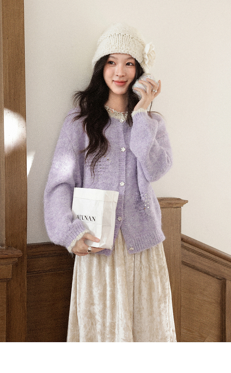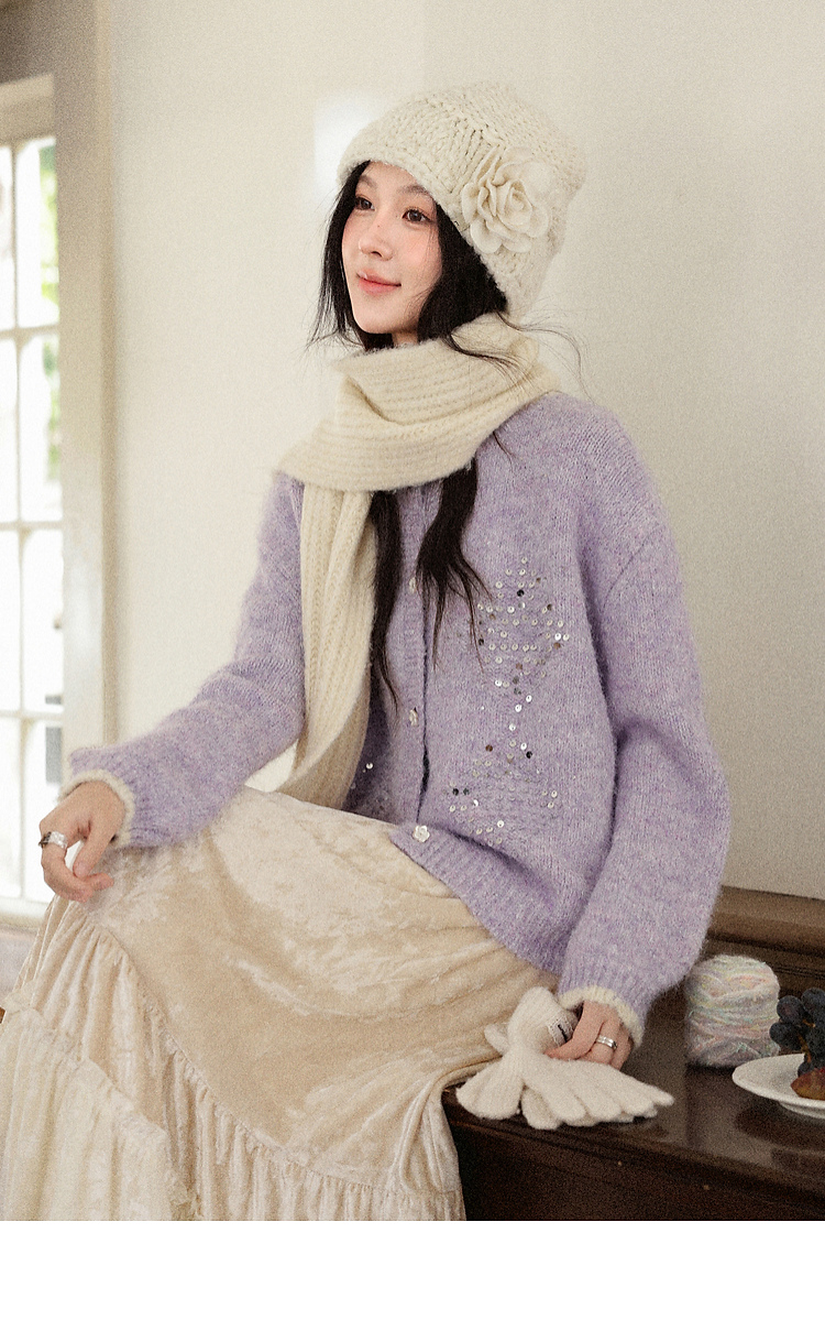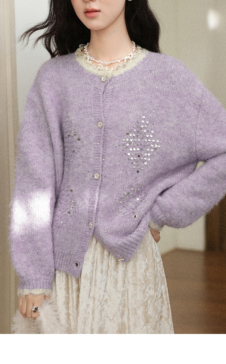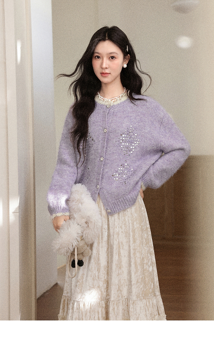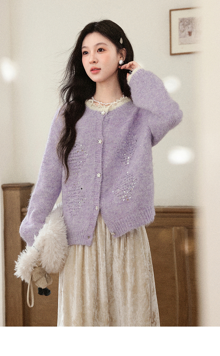 鹿向南「木槿」氛围感亮片紫色针织毛衣显瘦减龄开衫上衣女秋冬季