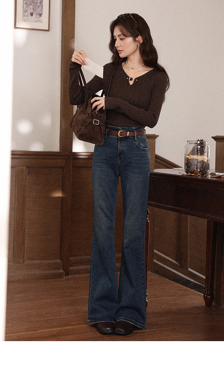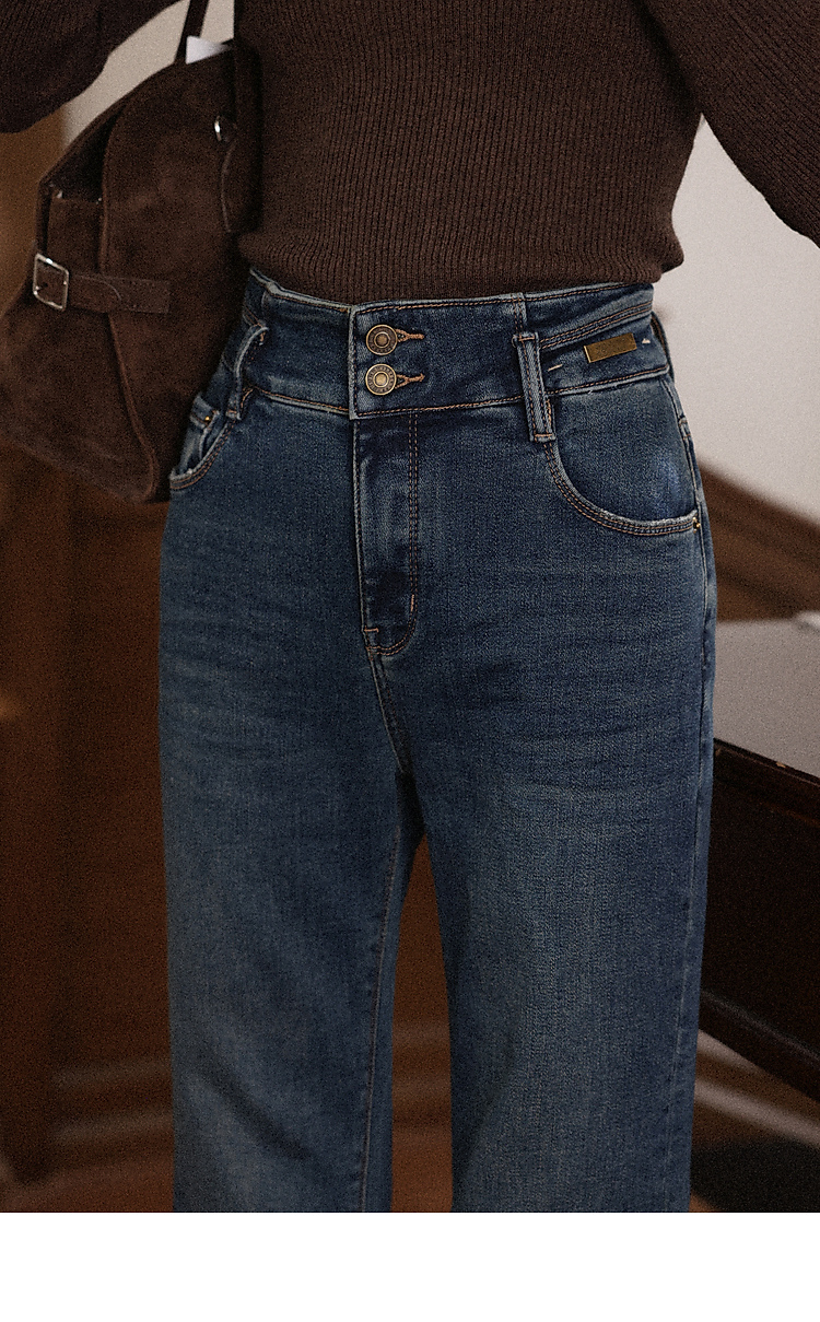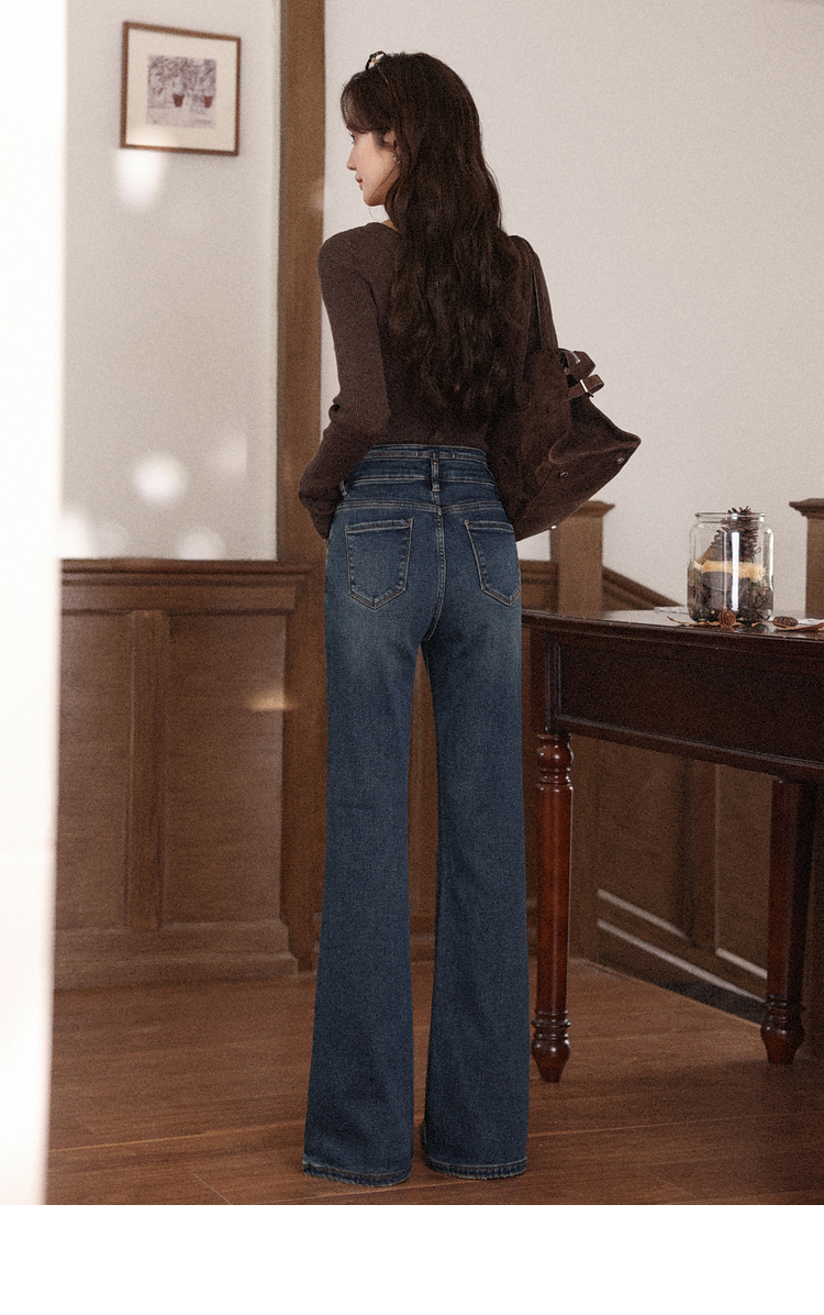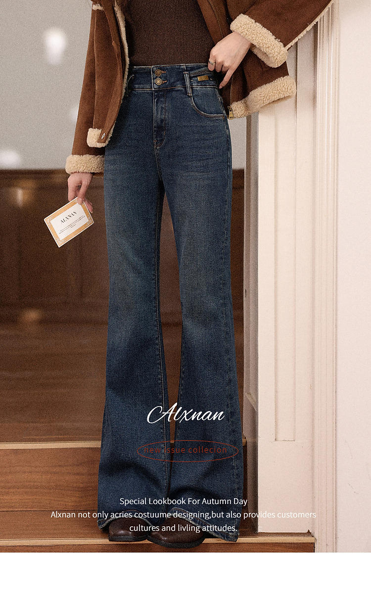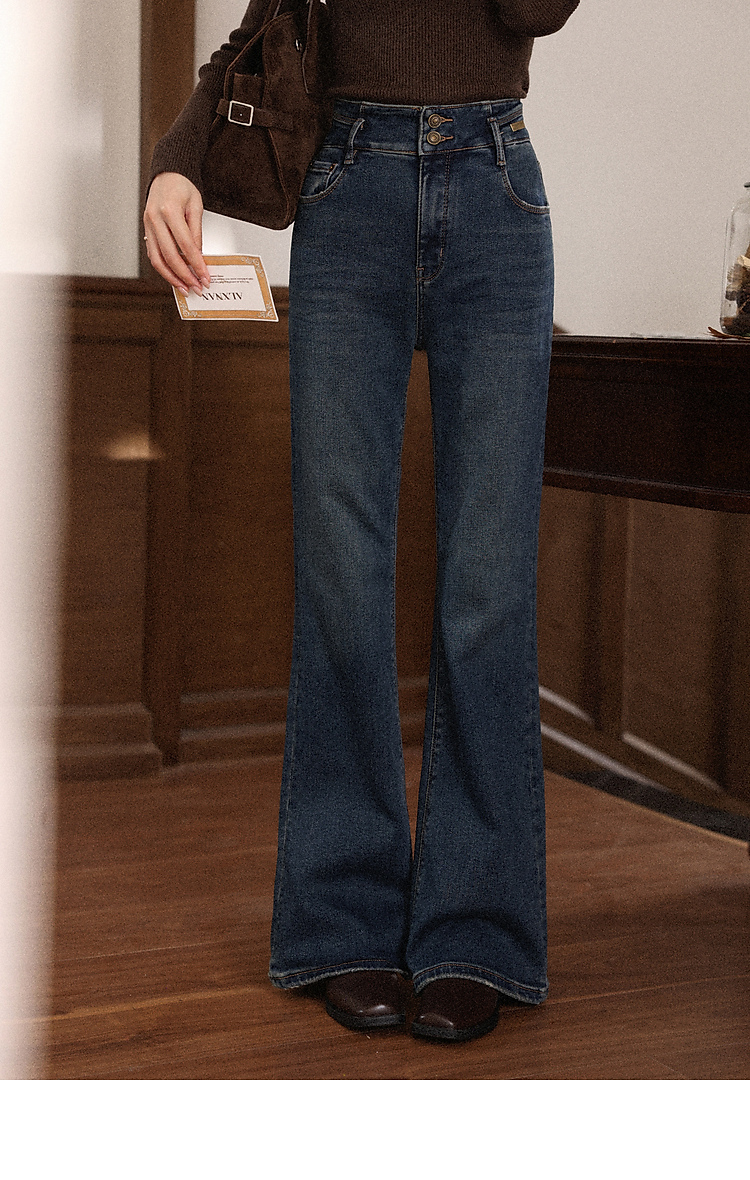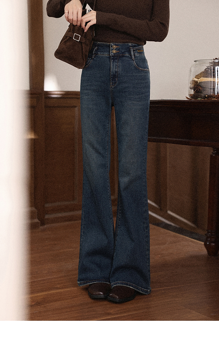 鹿向南「情诗满卷」蓝色高腰微喇牛仔裤女秋冬新款复古阔腿喇叭裤