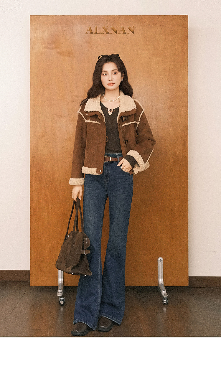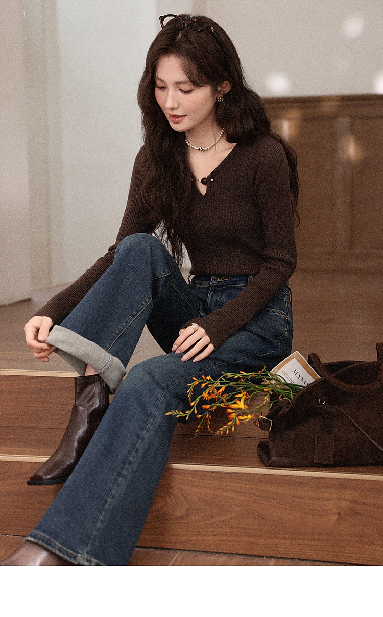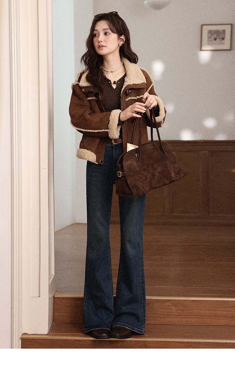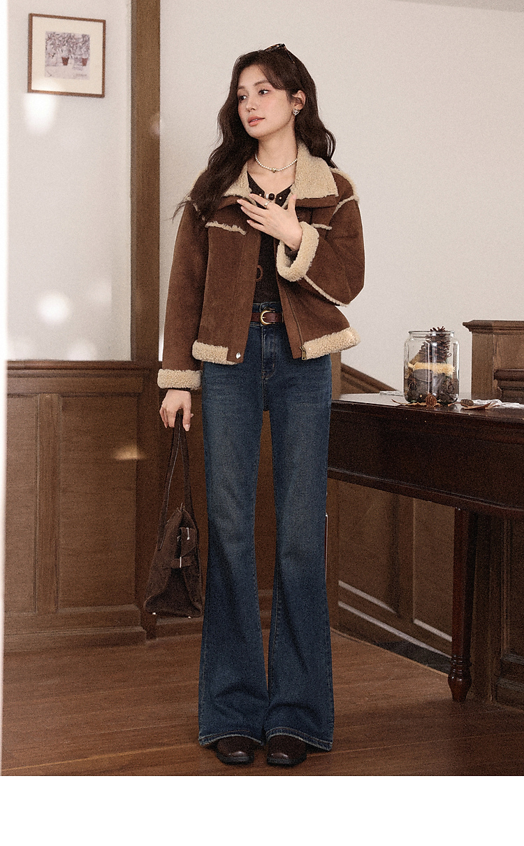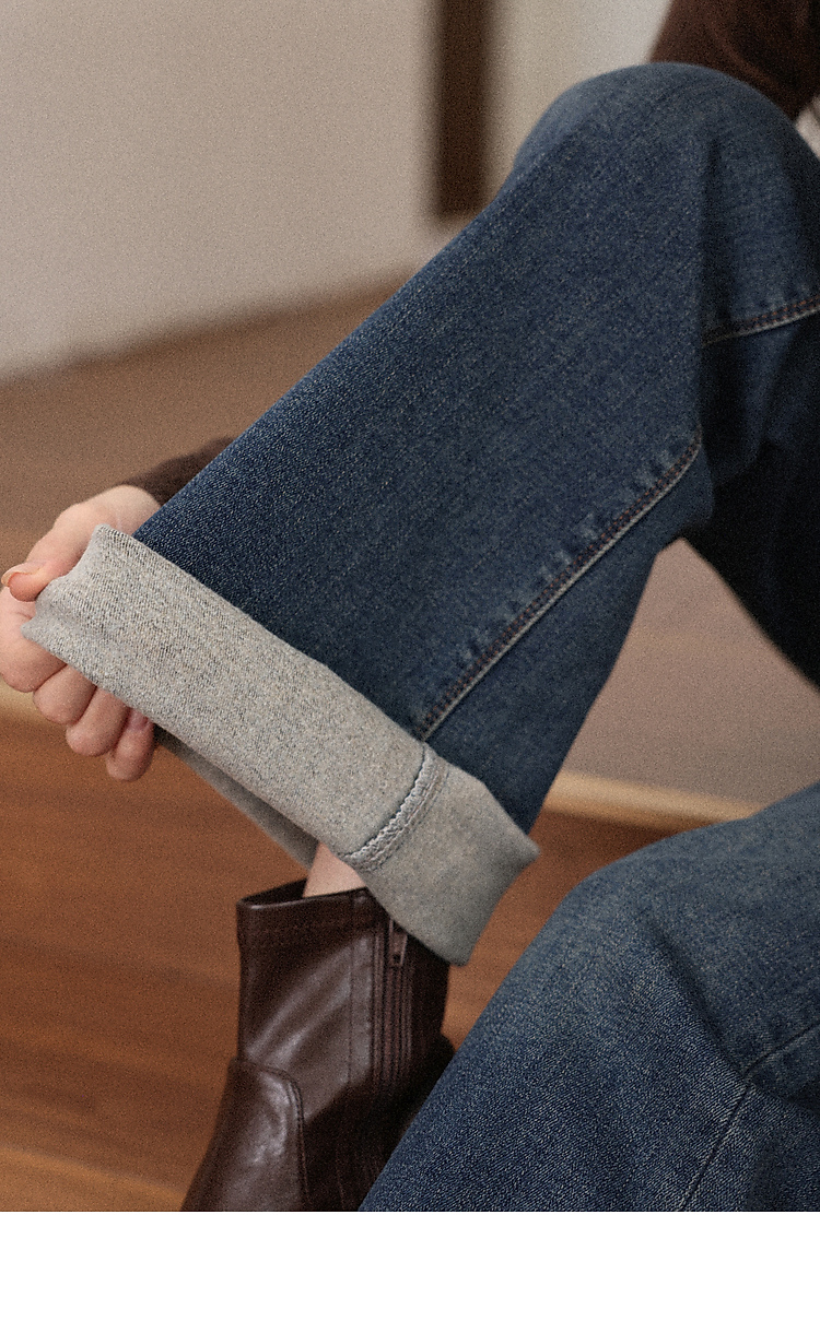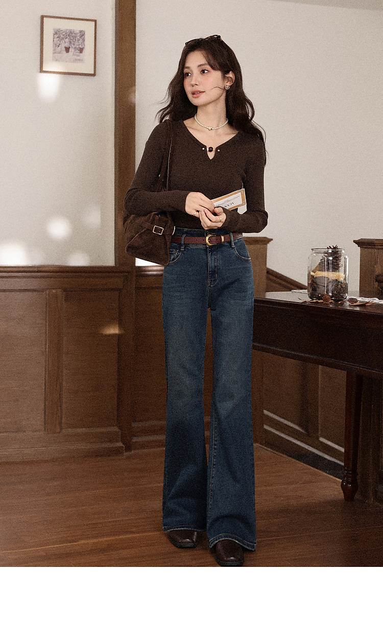 鹿向南「情诗满卷」蓝色高腰微喇牛仔裤女秋冬新款复古阔腿喇叭裤