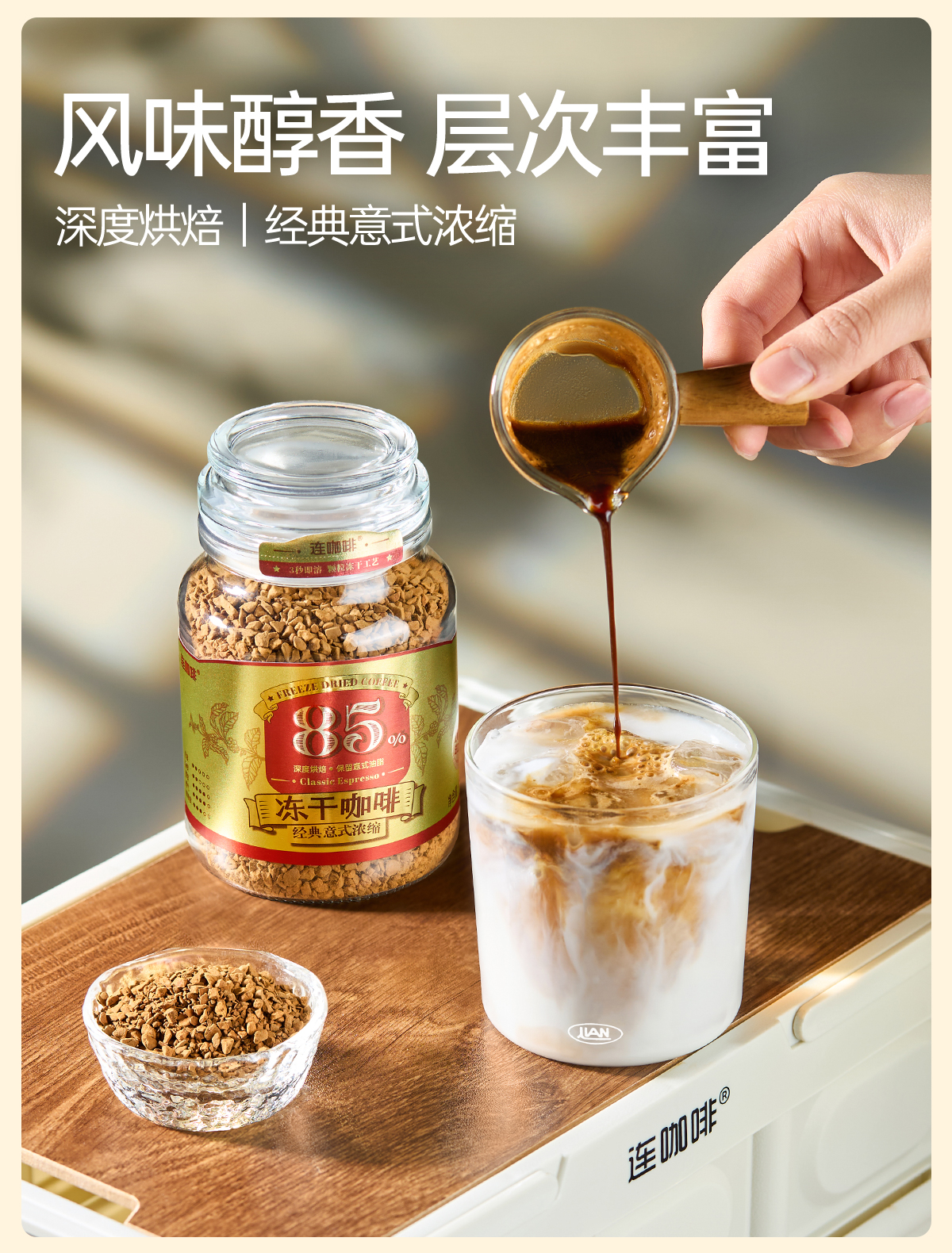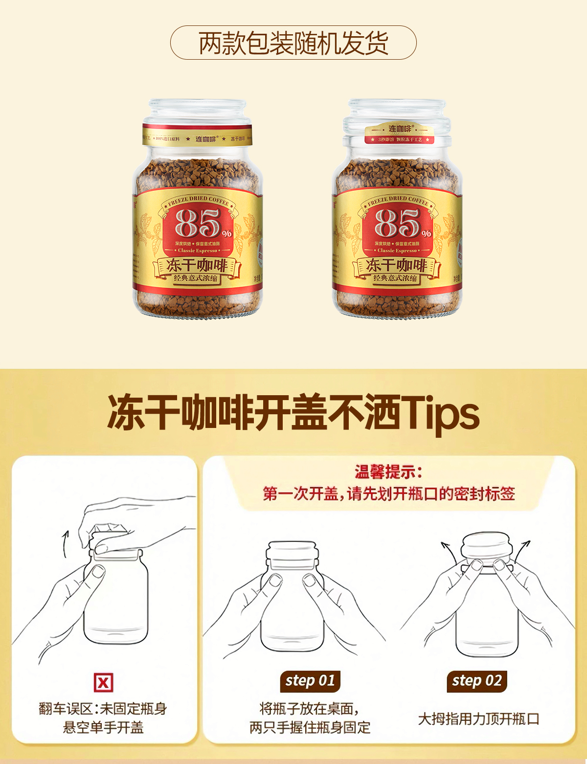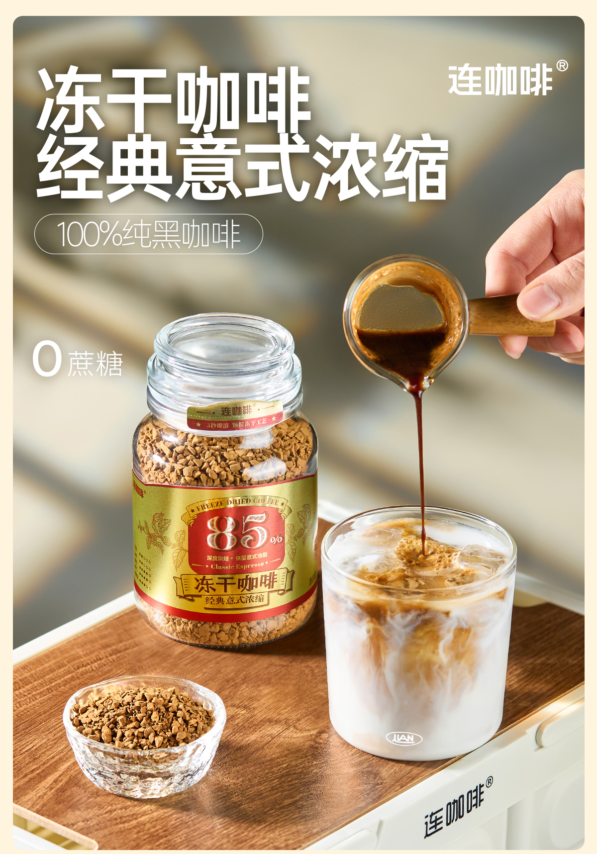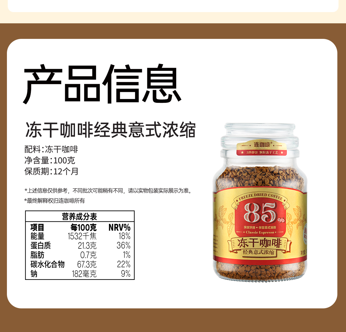 【买即赠:打泡器】连咖啡85%深度烘焙经典意式浓缩冻干咖啡 100g