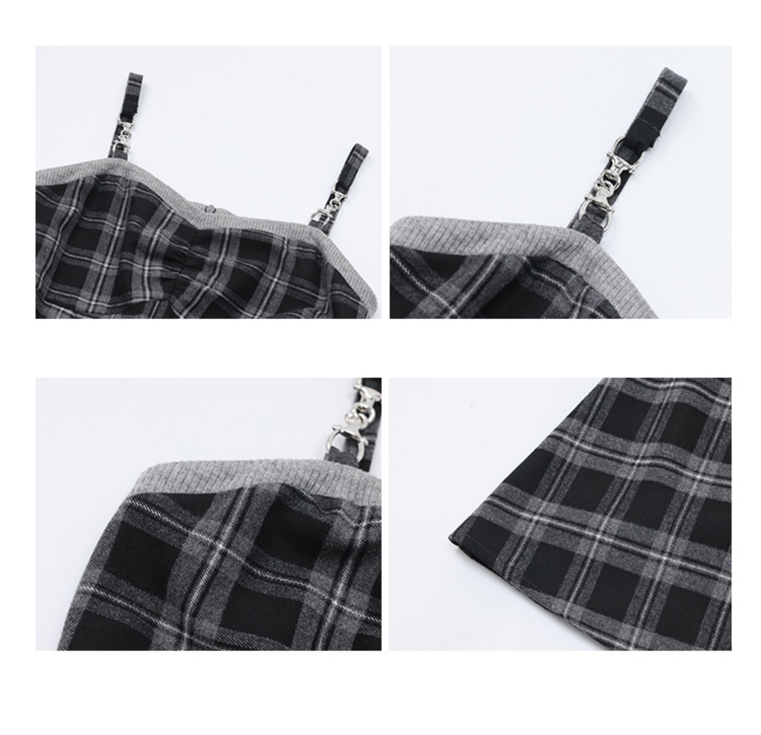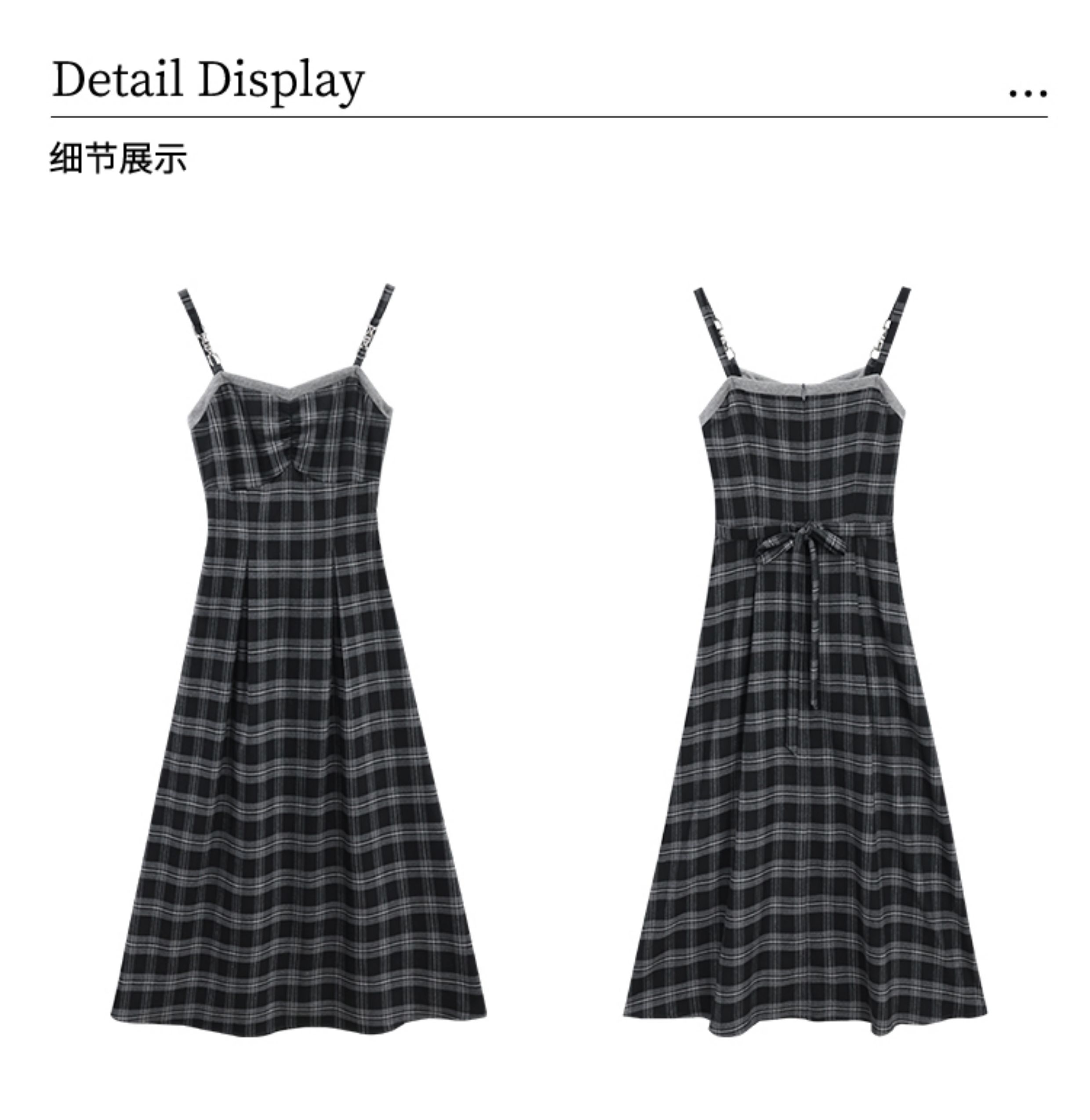 鹿向南「梦幻之恋」灰色格子无袖吊带连衣裙女早秋收腰显瘦长裙子