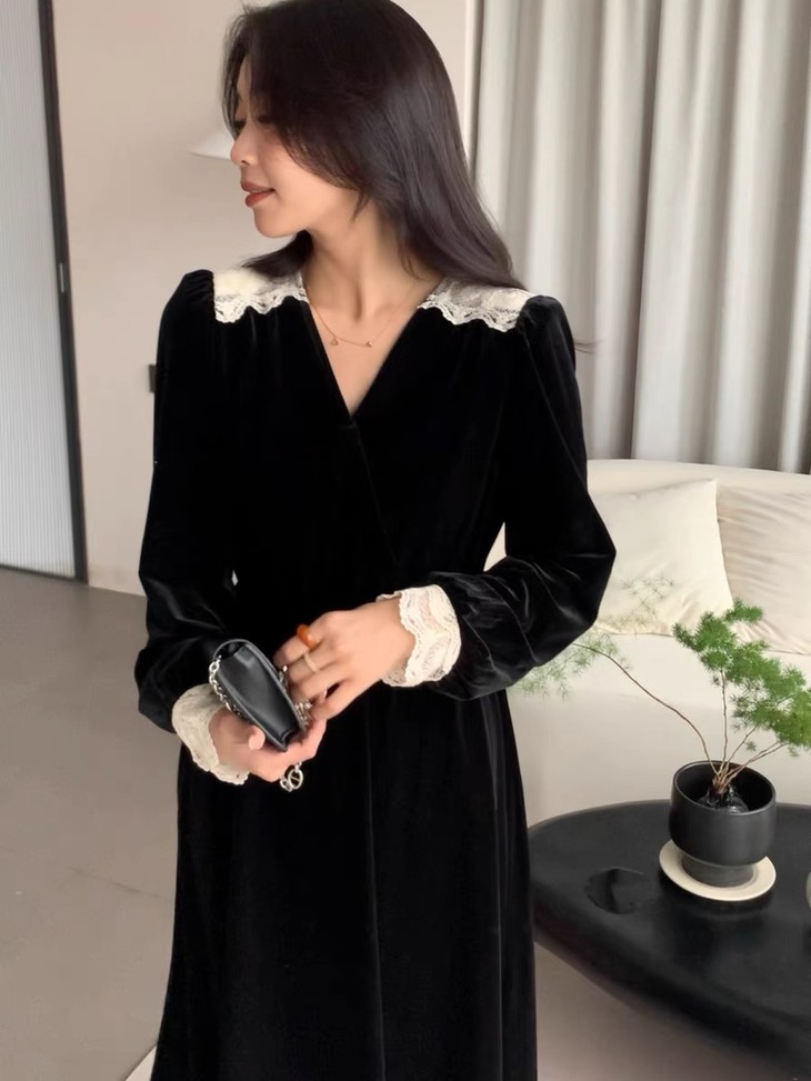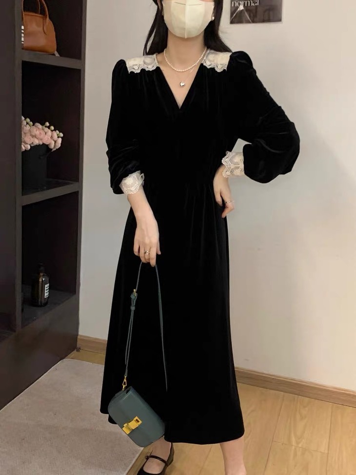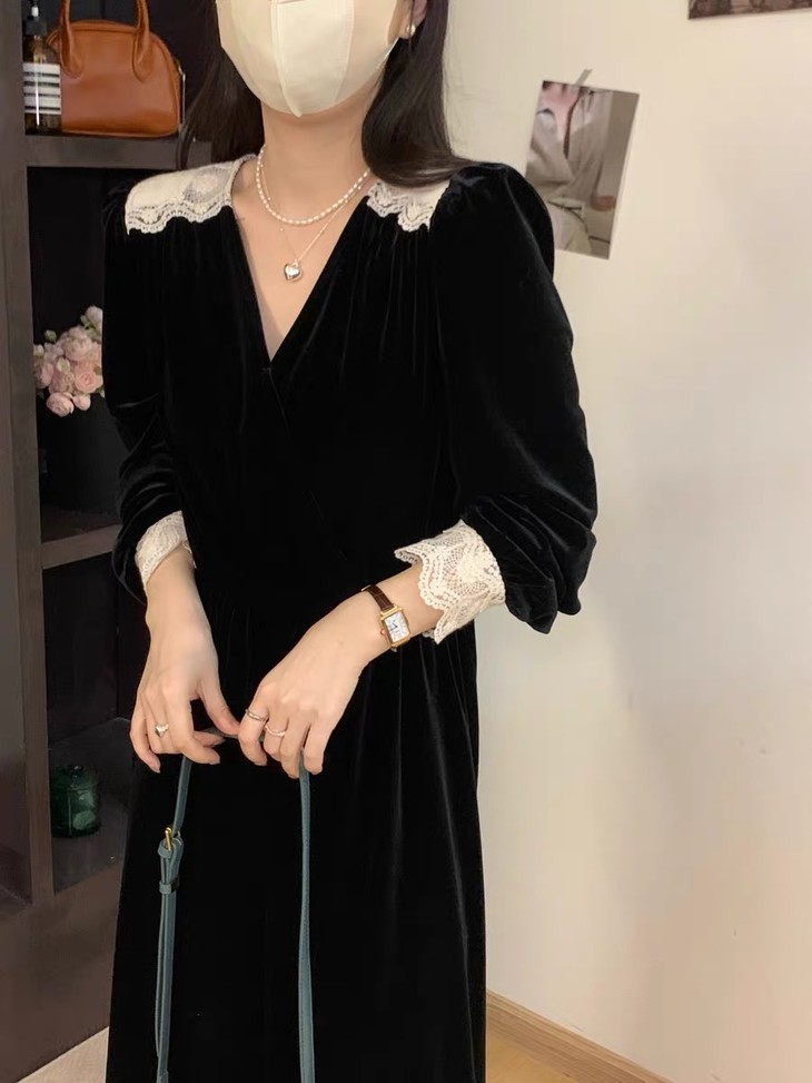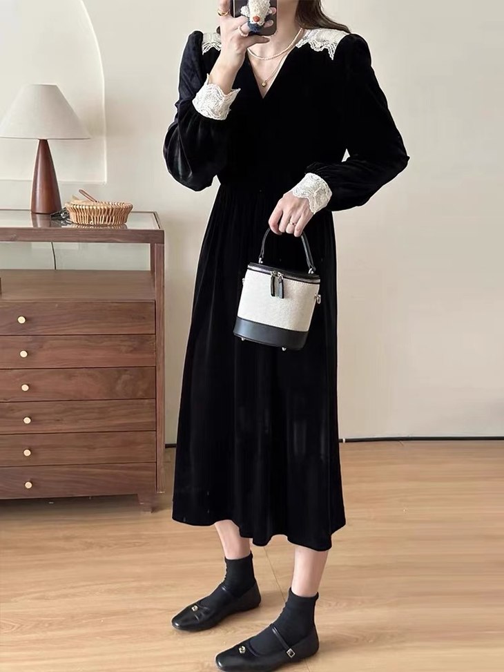 【商品名】赫本风V领丝绒蕾丝拼接连衣裙