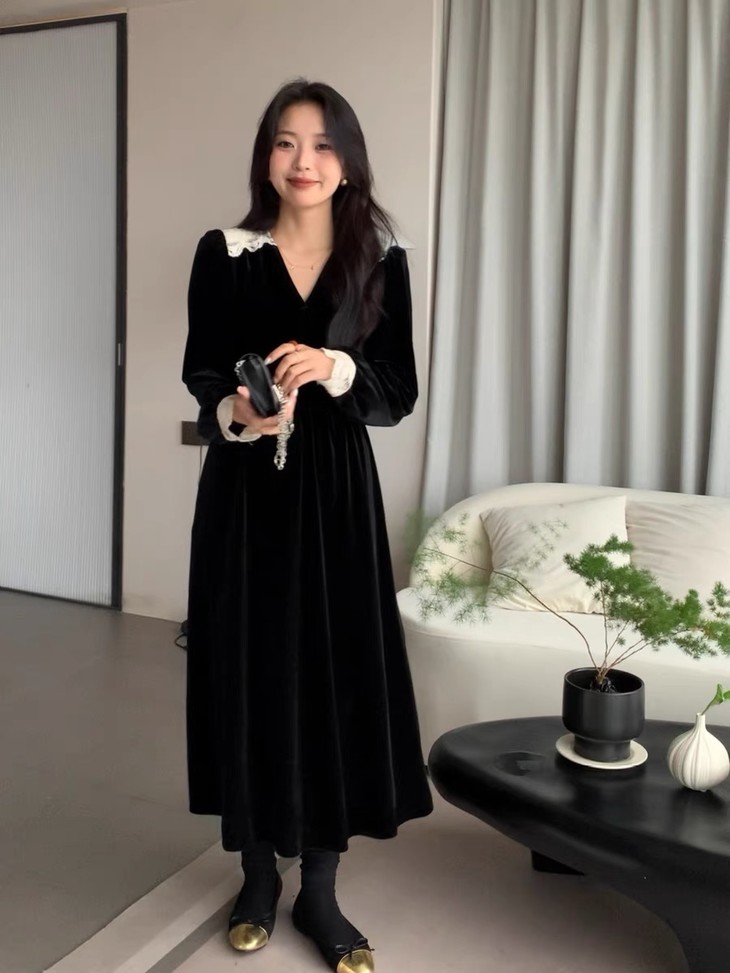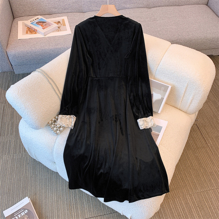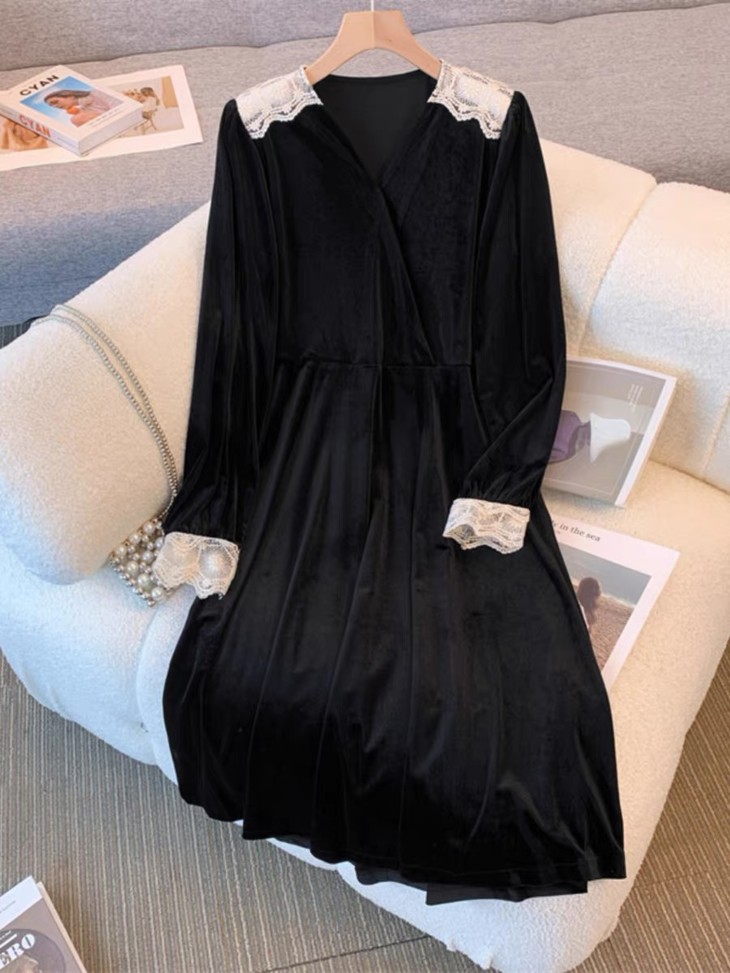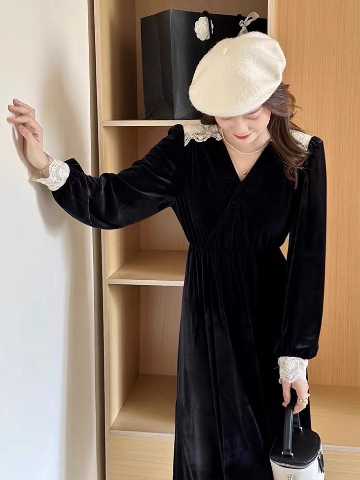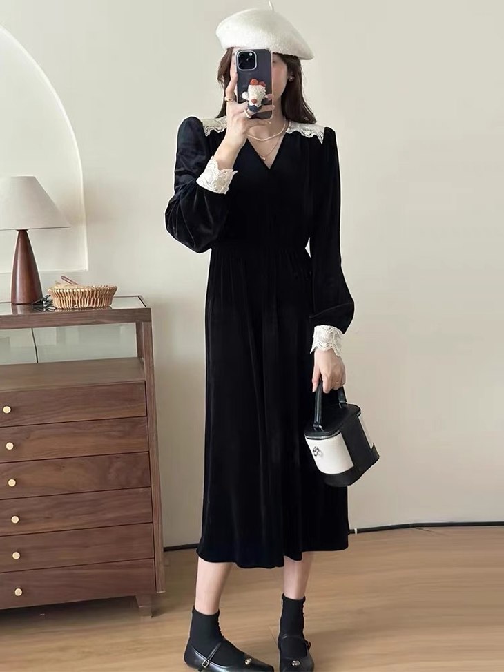 【商品名】赫本风V领丝绒蕾丝拼接连衣裙