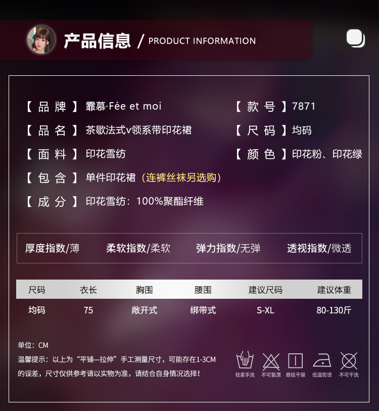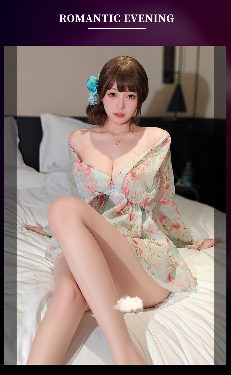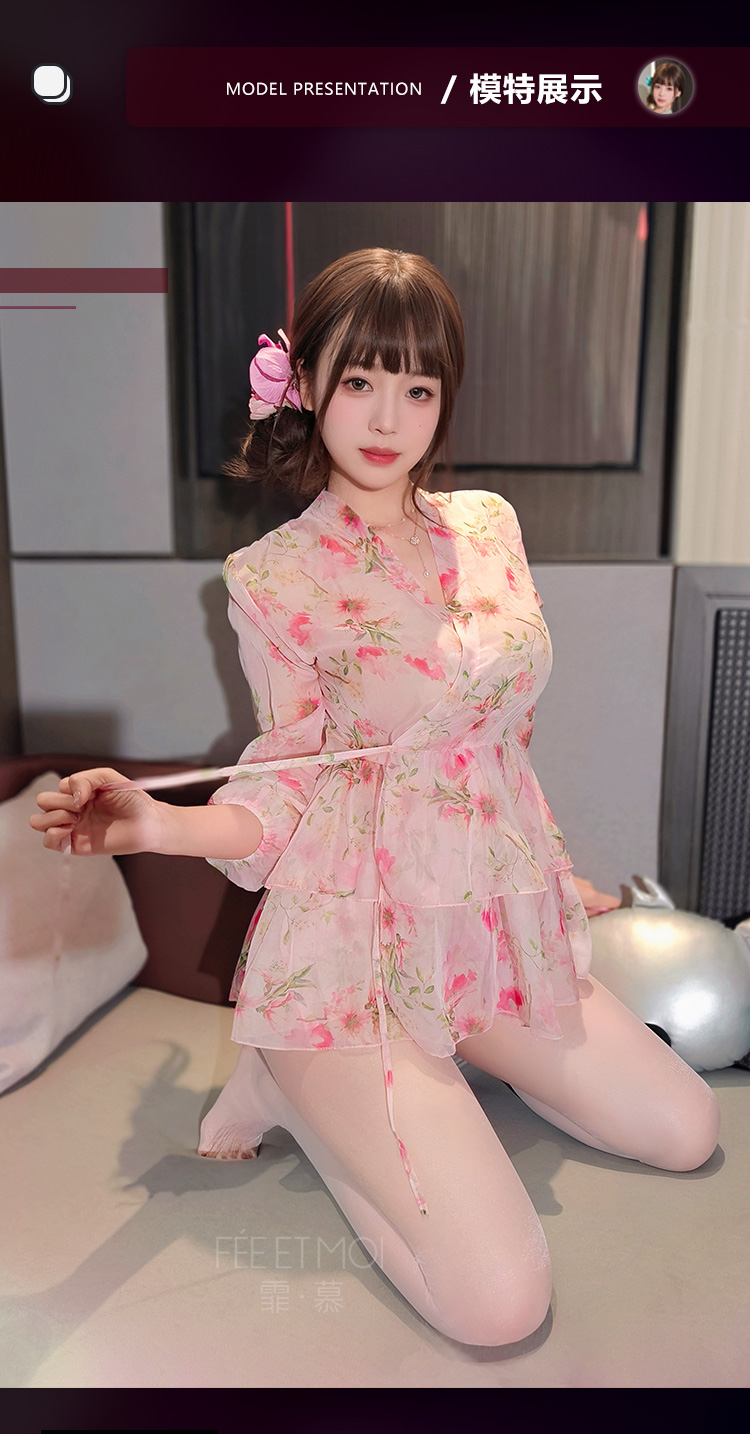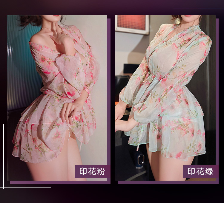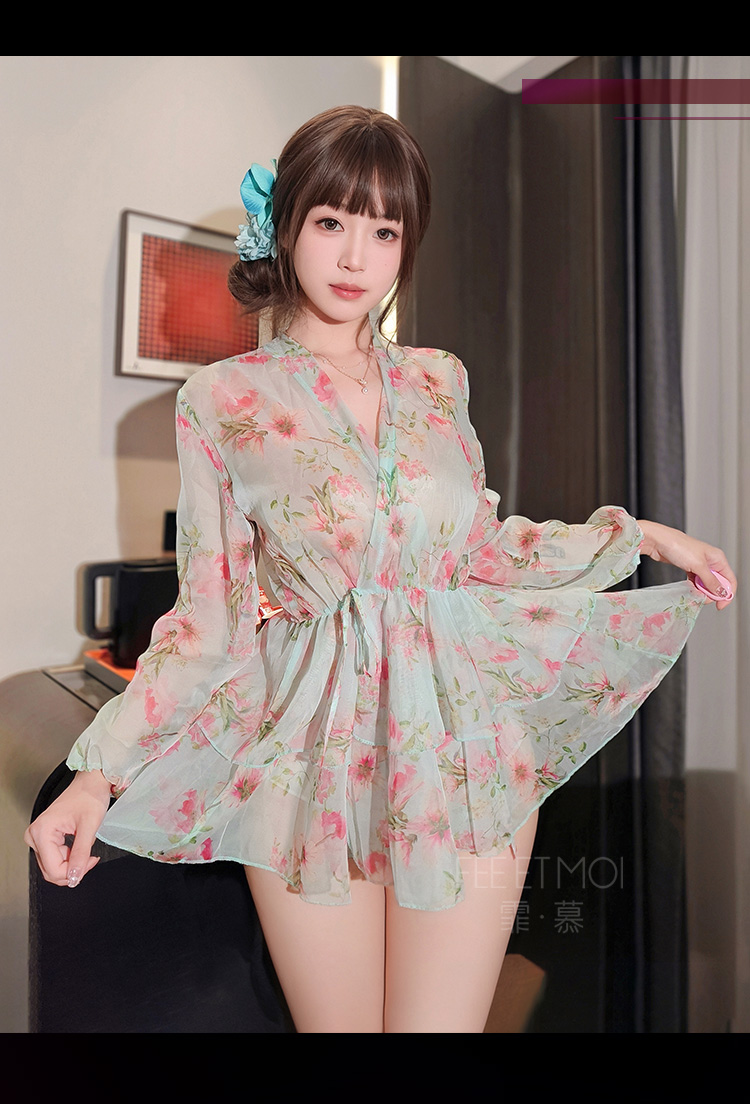 【情趣内衣】霏慕 茶歇法式V领系带印花裙7871