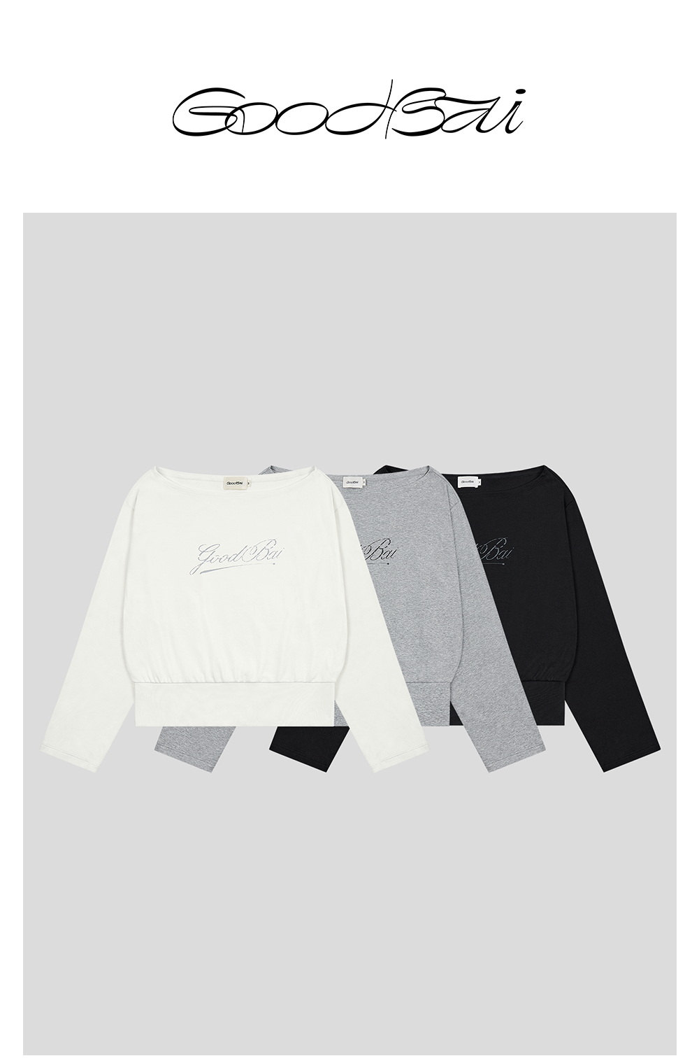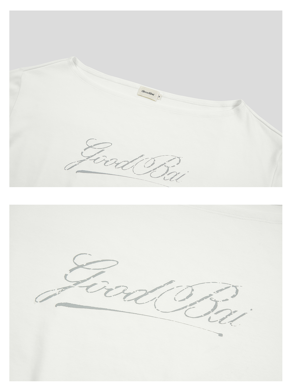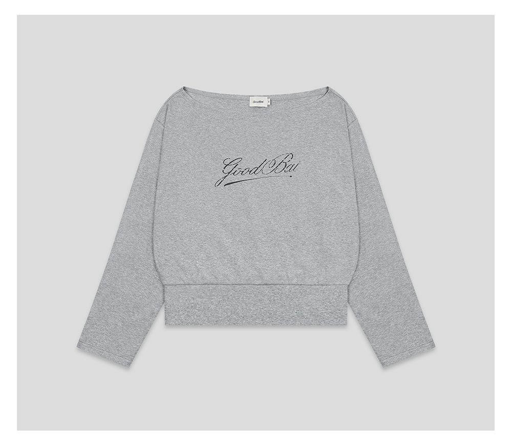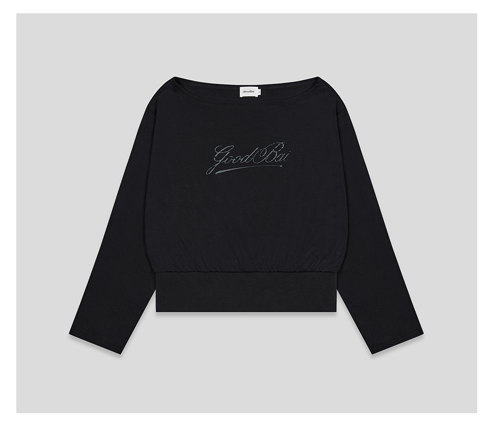 GOODBAI 斜体logo做旧印花露肩领宽松短款长袖T恤