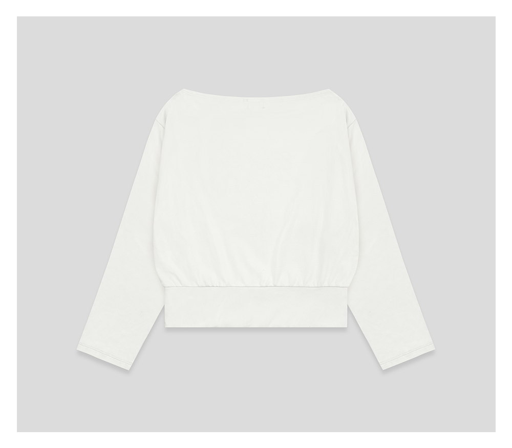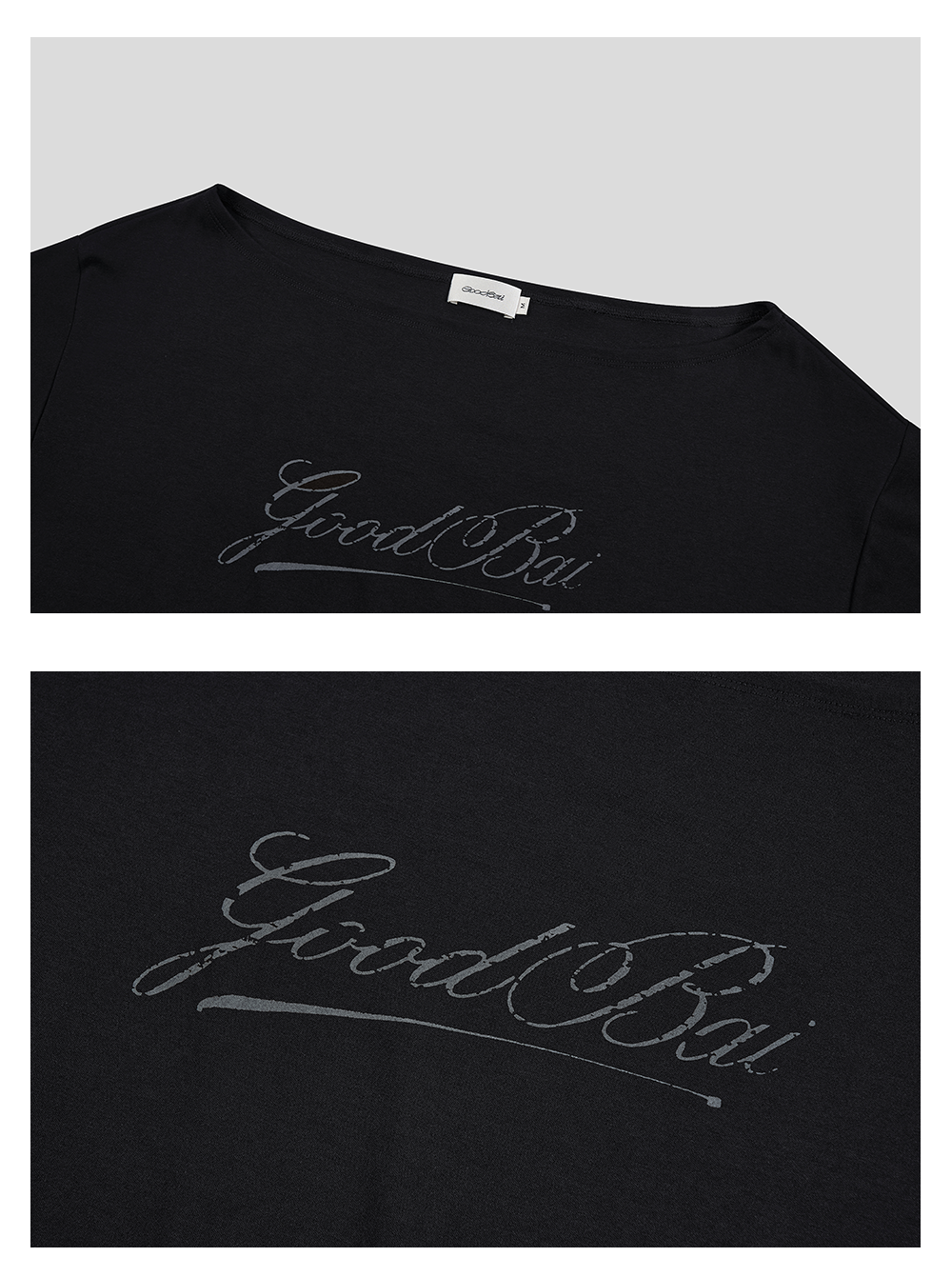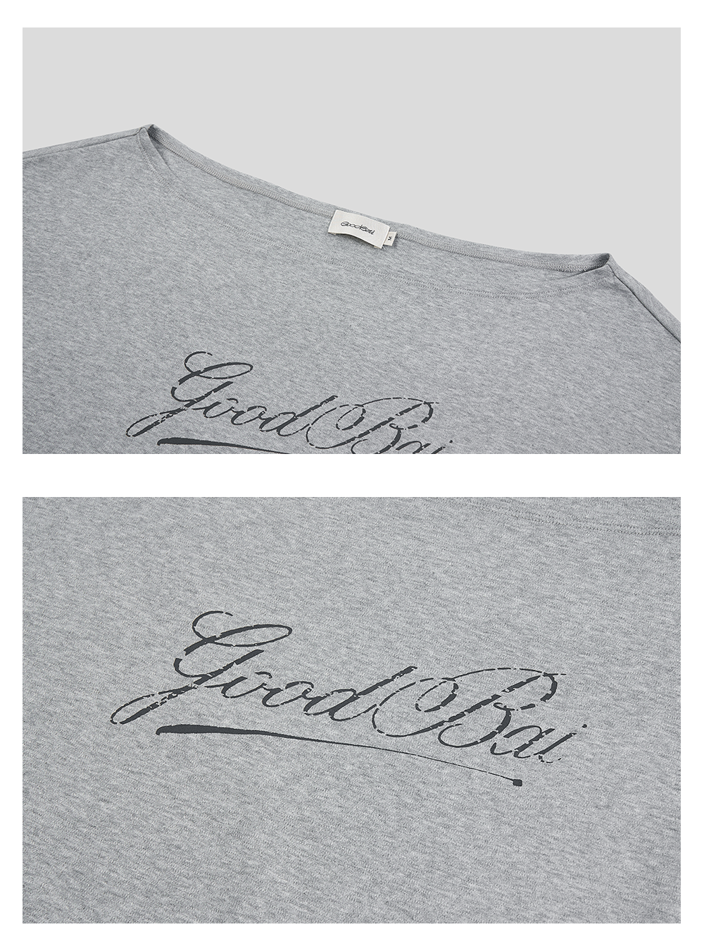 GOODBAI 斜体logo做旧印花露肩领宽松短款长袖T恤