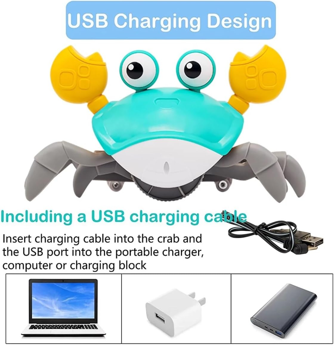 【多功能蟹】便捷充电,支持用移动电源、电脑或家中任何电源插头充电。采用高品质ABS塑料制成,安全耐用,防掉落且便携,适合户外游戏和室内婴儿爬行互动。