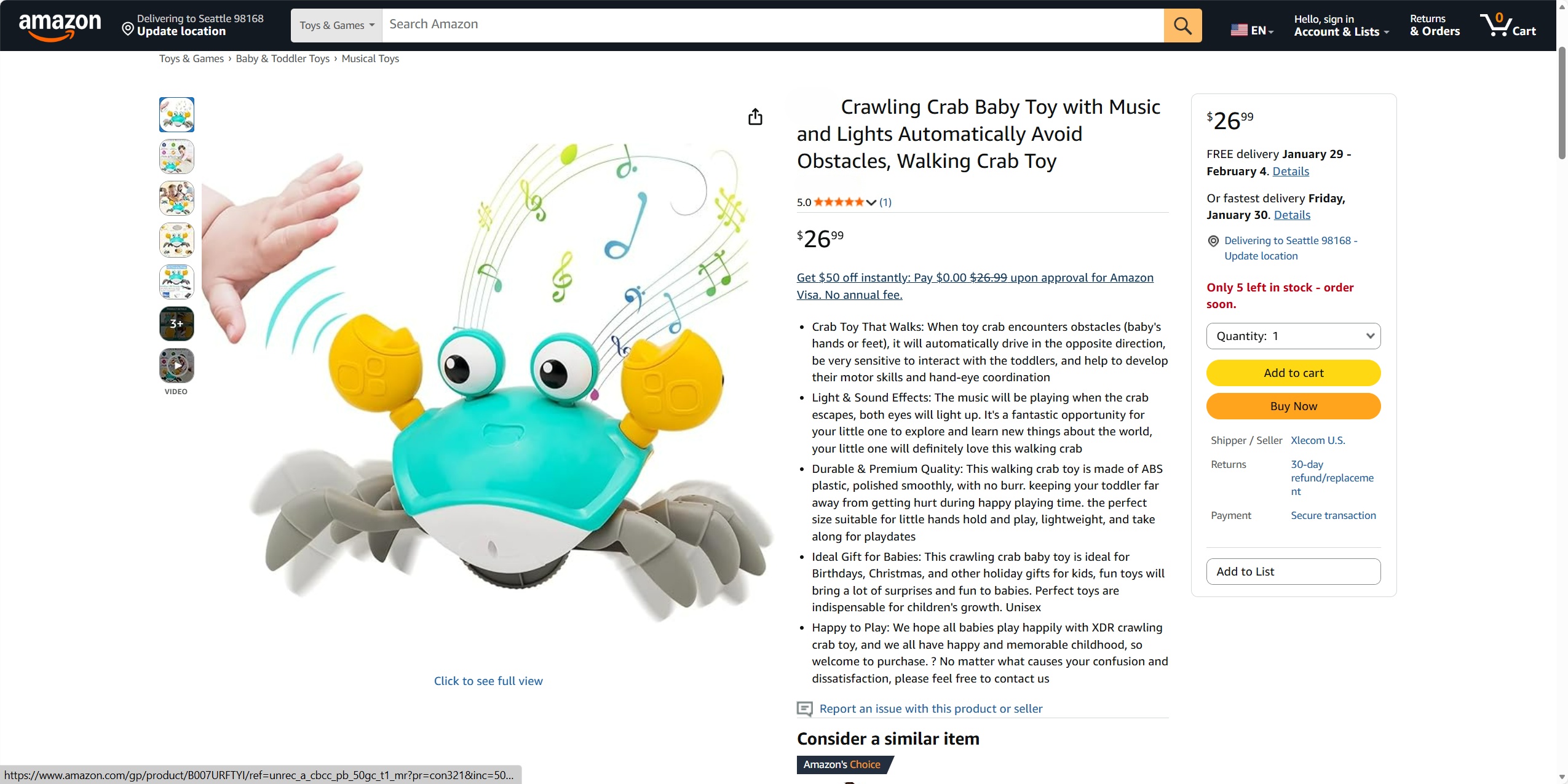 灯光与音效:当螃蟹逃脱时,音乐会响起,双眼都会发光。这是你的小孩探索和学习新事物的绝佳机会,你的小孩会喜欢这只会走路的螃蟹。