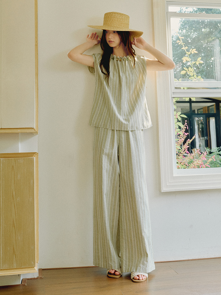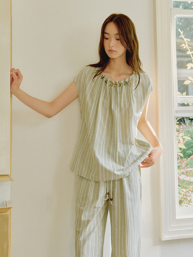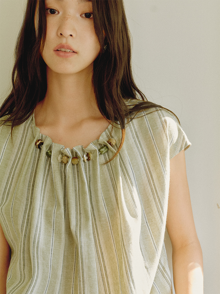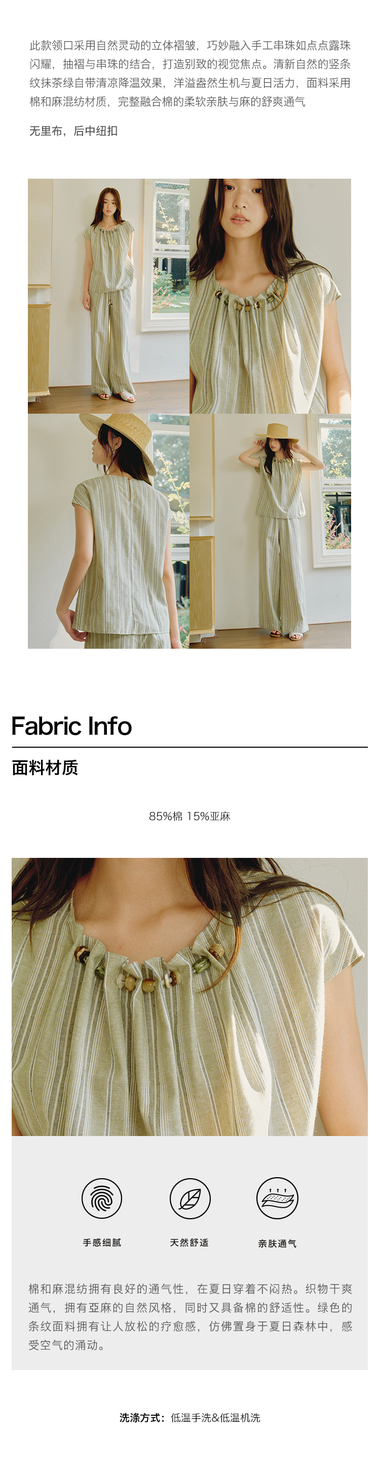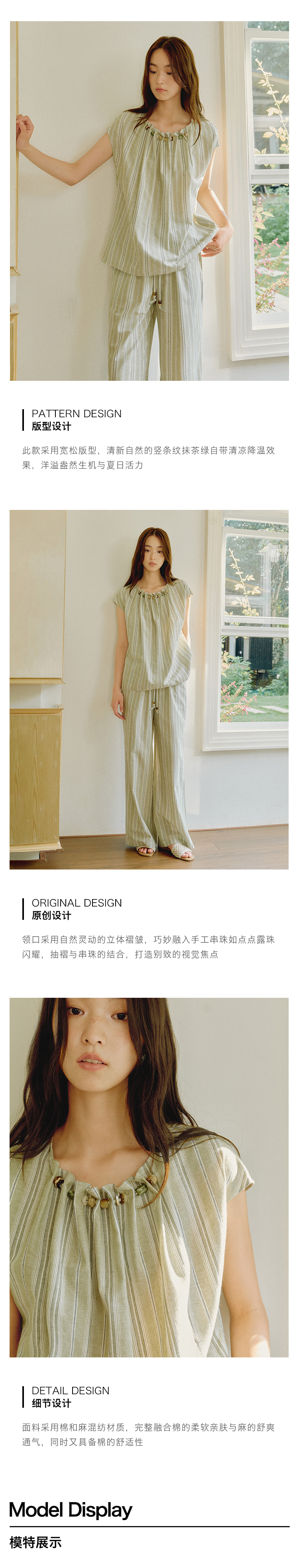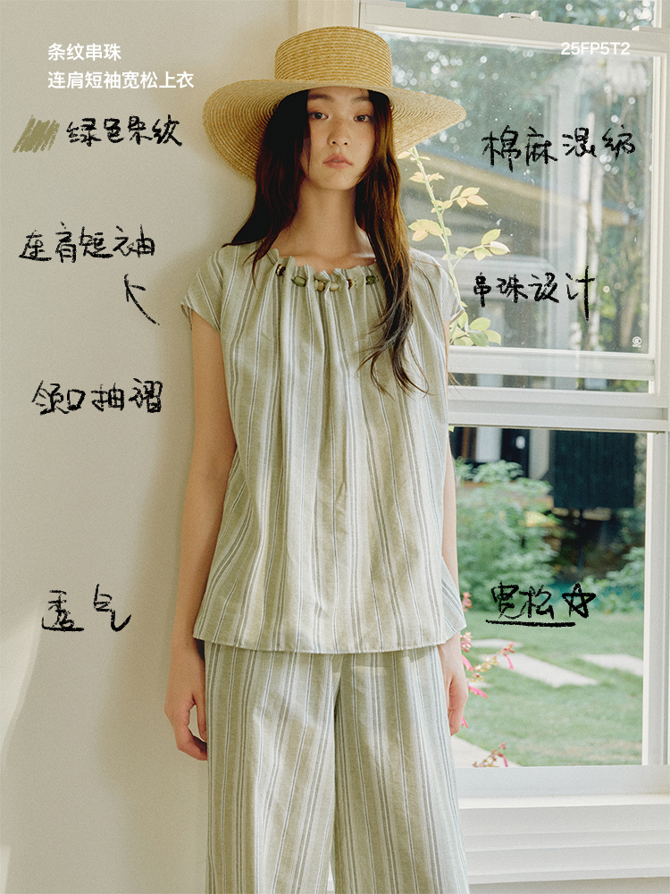 ForPoem 现货 25/SS原创设计棉麻条纹串珠连肩短袖宽松上衣