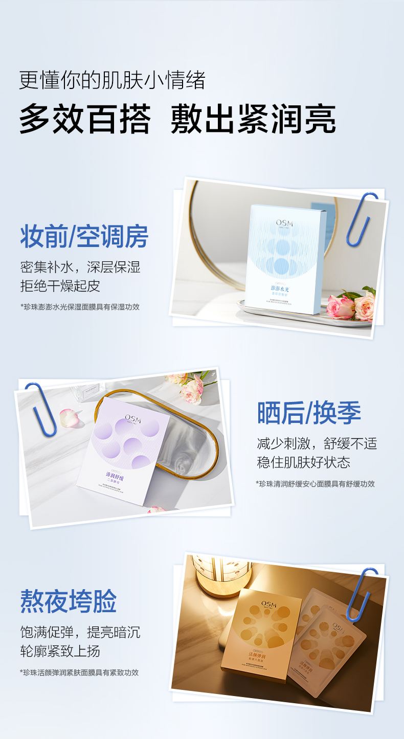 【到手100片】欧诗漫珍珠澎澎水光保湿面膜5盒+珍珠清润舒缓安心面膜5盒+珍珠活颜弹润紧肤面膜5盒+ 泛醇水润修护面膜5盒