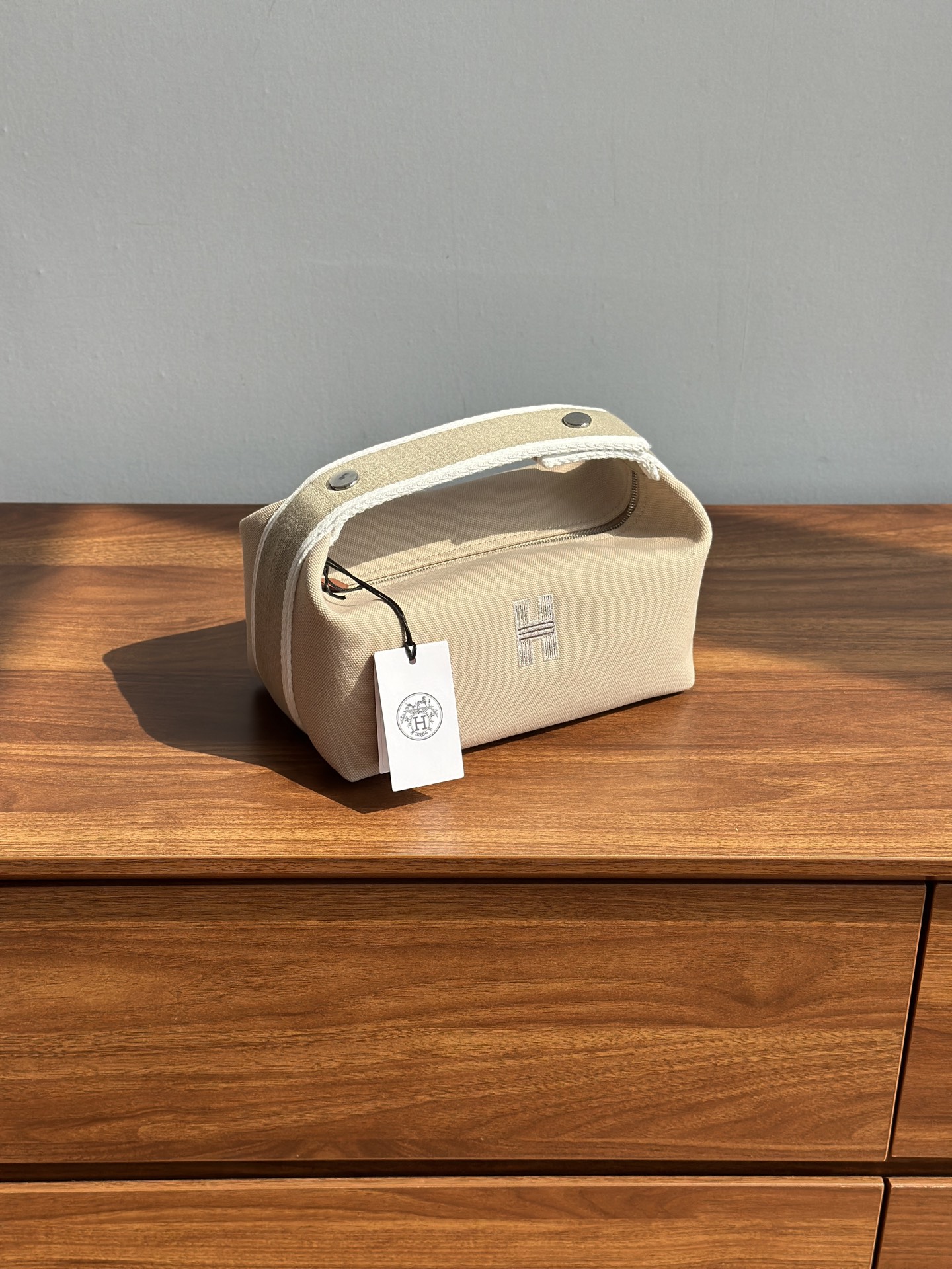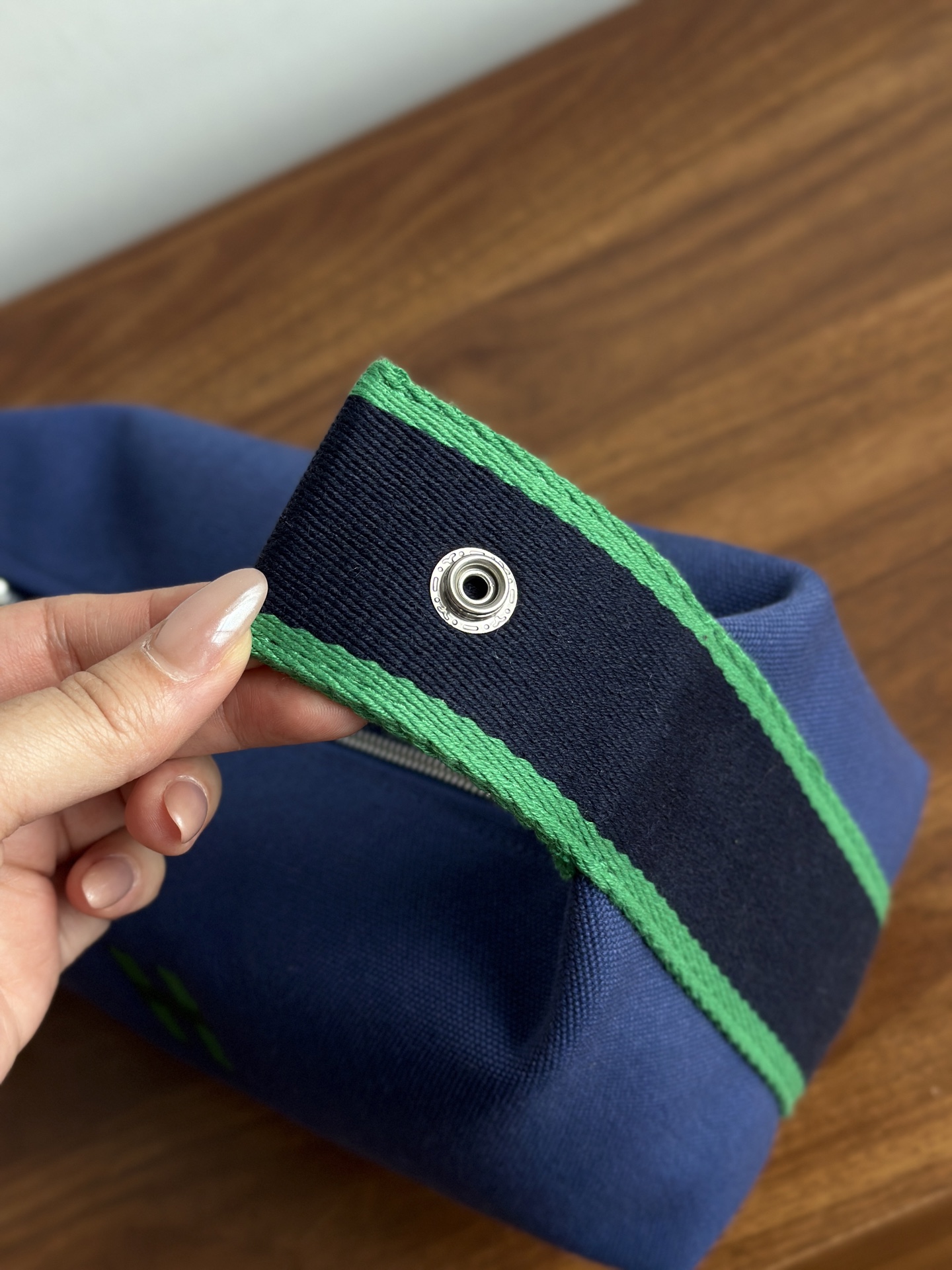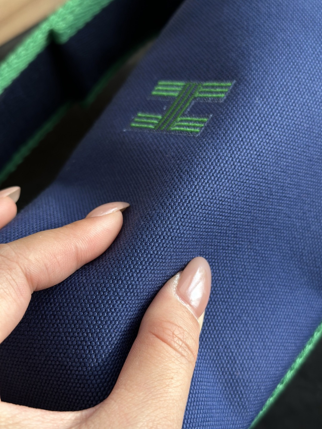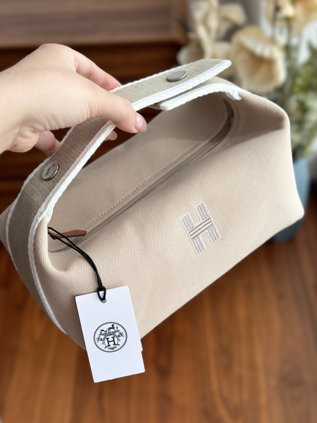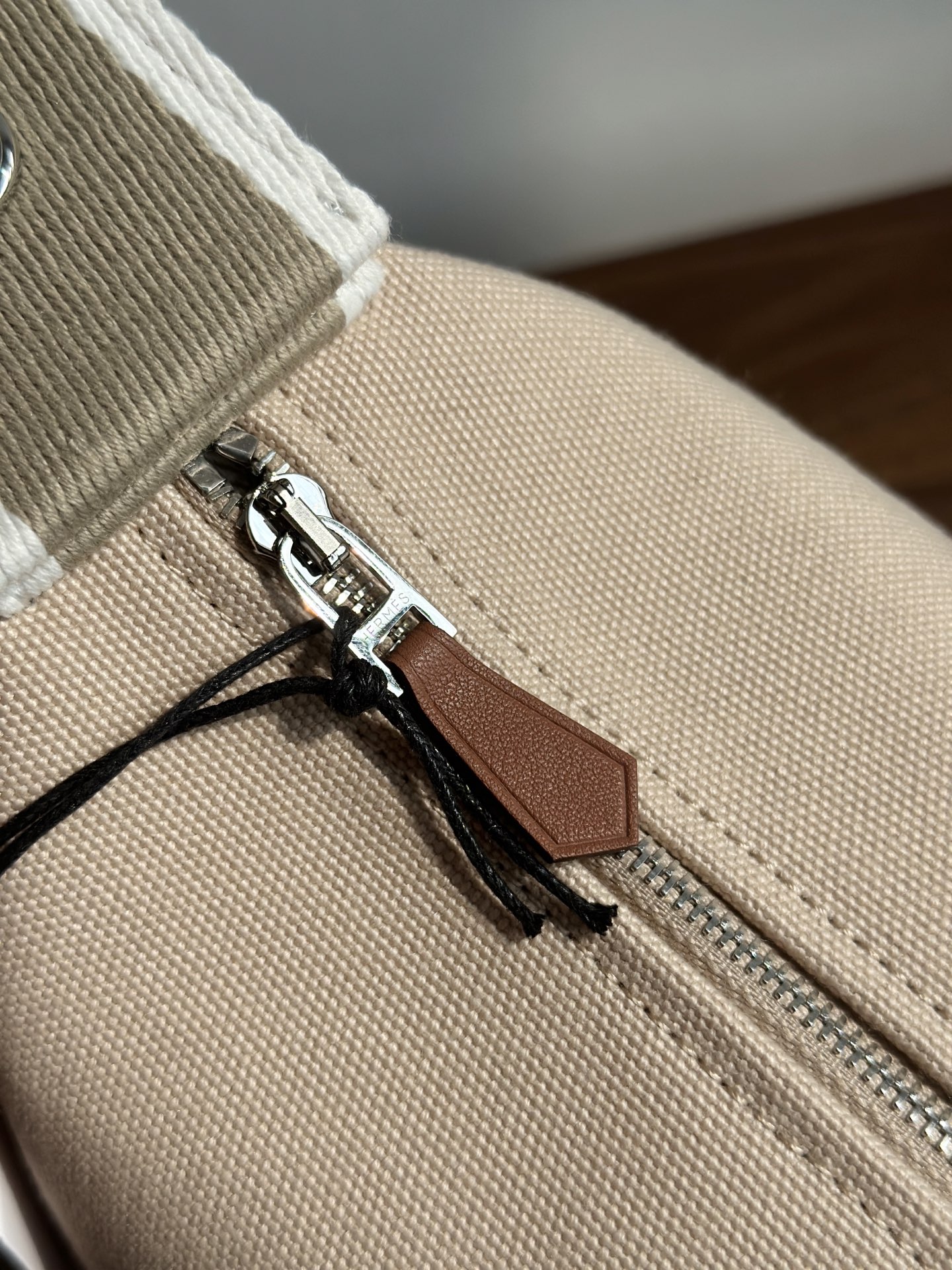 面料:日本进口H Plume帆布 特点是低调简约,包身整体是纯色或简单的条纹,上面印有小小的“H”字母图案,整体风格偏向现代、休闲和“老钱风”。 它没有大面积的标志性 logo,更显克制和高级! 手感与耐用性:由100%棉制成,手感柔软轻盈。 它的耐用性不错,但相比人字纹,表面相对光滑,没有粗犷的纹理感! ❗️这种材料需要特殊对纹 所以这里的每一只Bride-a-Brac洗漱包都是纯手工开料…配件 缝制工艺:爱马家的精髓就是纯手工制作的工匠精神! 你看似一个简单的布包 实则产量极低,真正的人工费也不比材料便宜! 这就是为何柜子售价¥6500 还如此受欢迎!!!