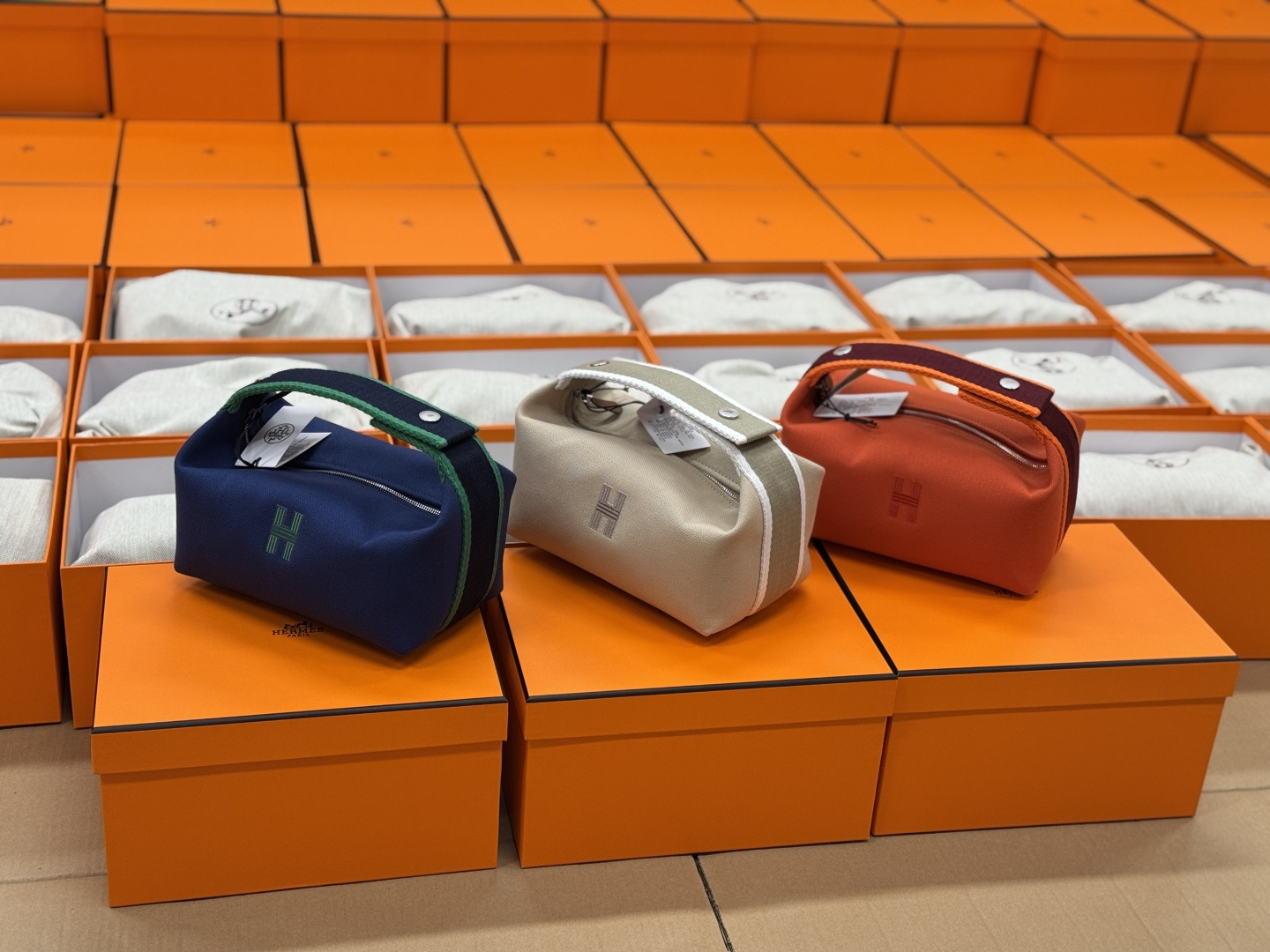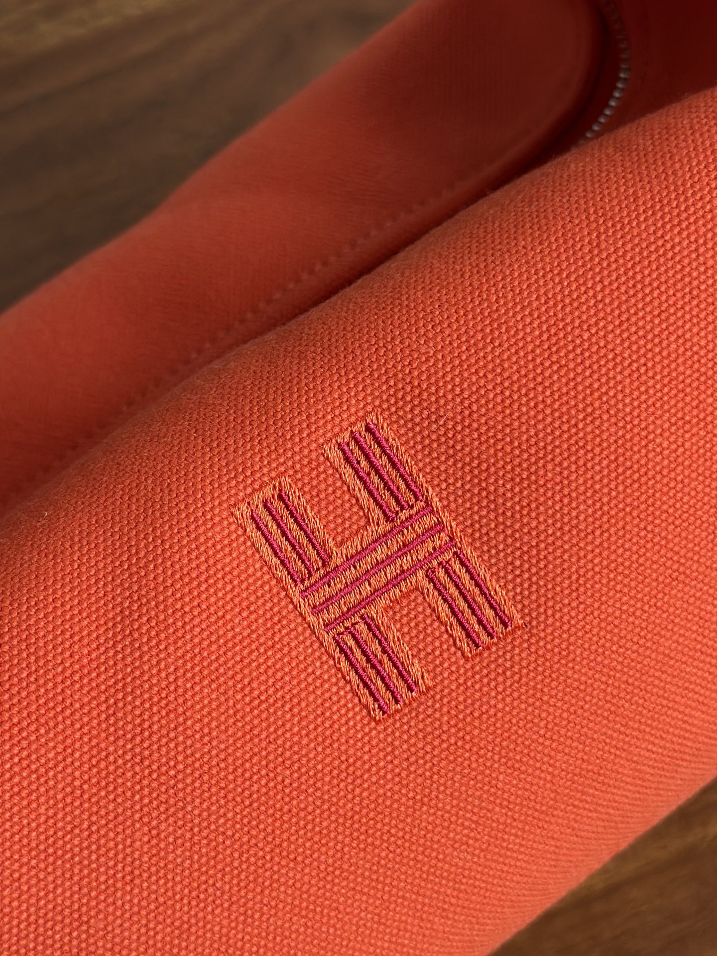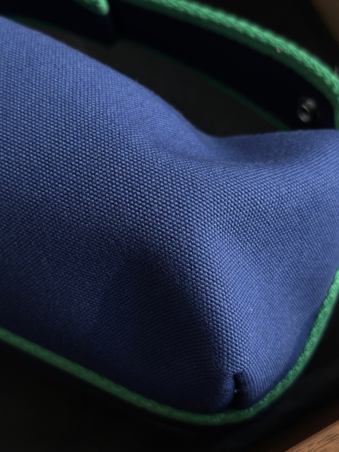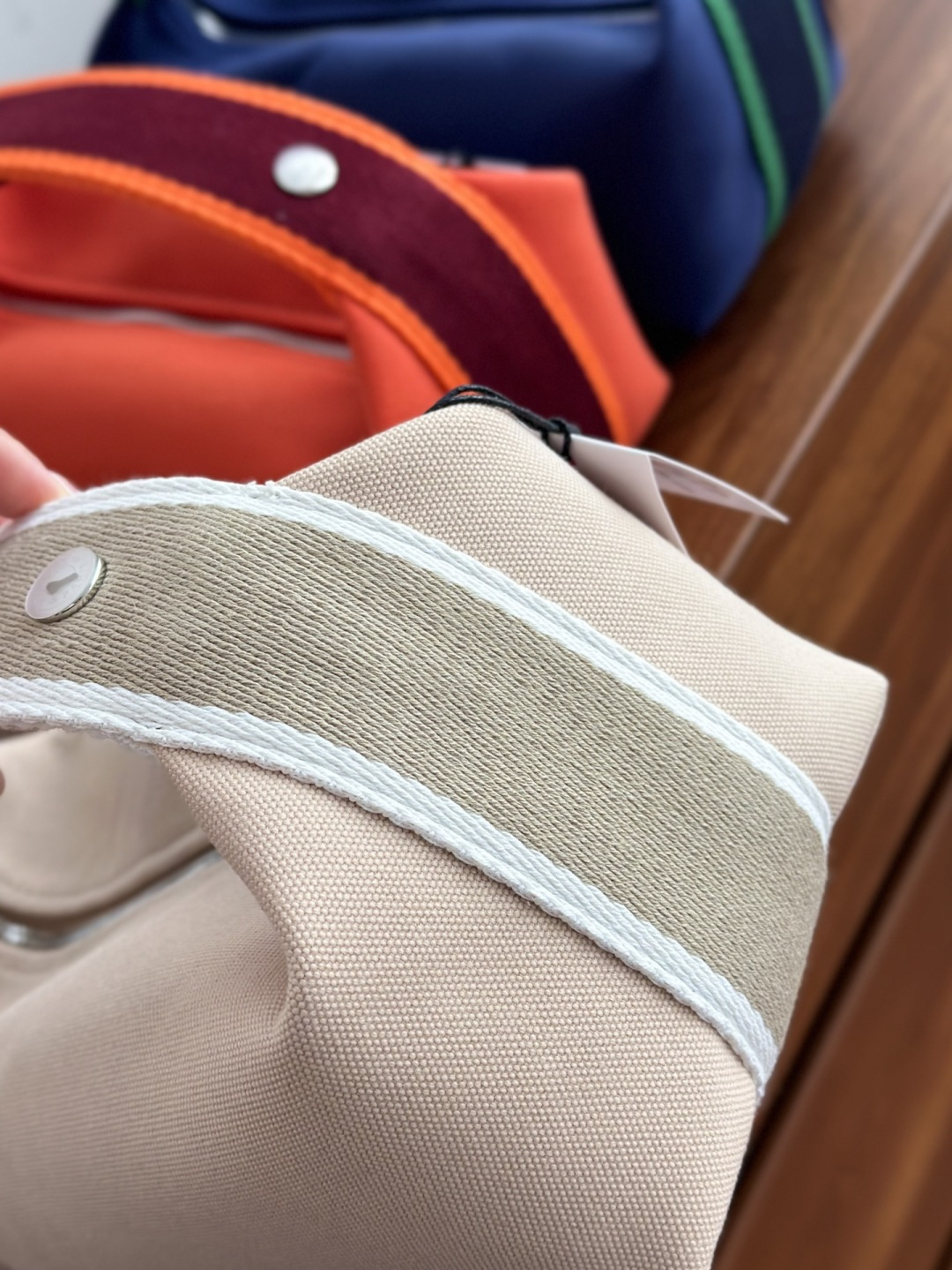 面料:日本进口H Plume帆布 特点是低调简约,包身整体是纯色或简单的条纹,上面印有小小的“H”字母图案,整体风格偏向现代、休闲和“老钱风”。 它没有大面积的标志性 logo,更显克制和高级! 手感与耐用性:由100%棉制成,手感柔软轻盈。 它的耐用性不错,但相比人字纹,表面相对光滑,没有粗犷的纹理感! ❗️这种材料需要特殊对纹 所以这里的每一只Bride-a-Brac洗漱包都是纯手工开料…配件 缝制工艺:爱马家的精髓就是纯手工制作的工匠精神! 你看似一个简单的布包 实则产量极低,真正的人工费也不比材料便宜! 这就是为何柜子售价¥6500 还如此受欢迎!!!