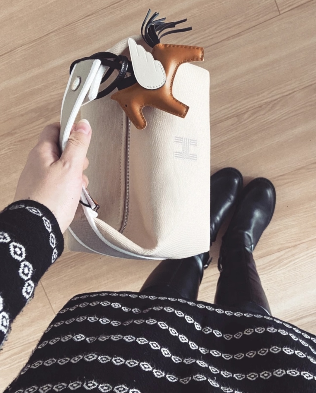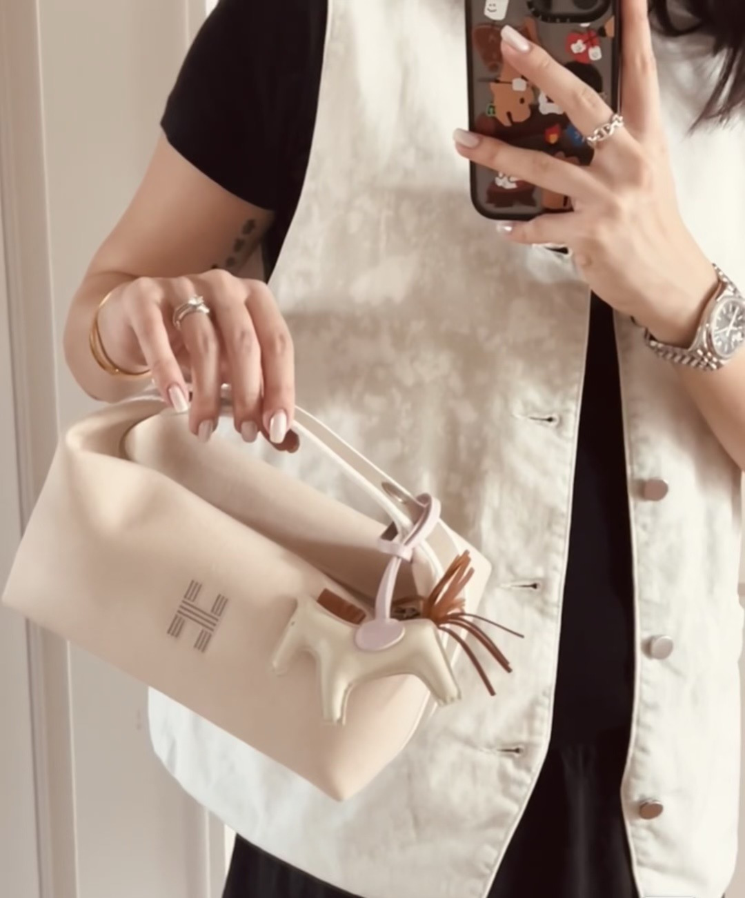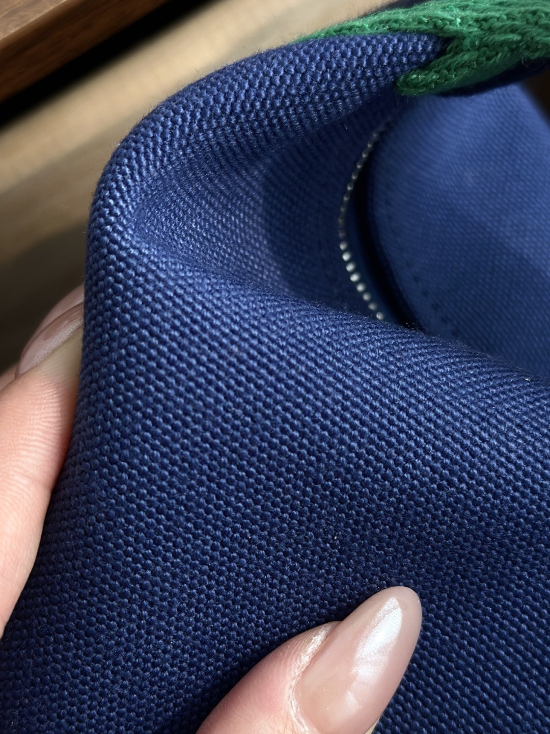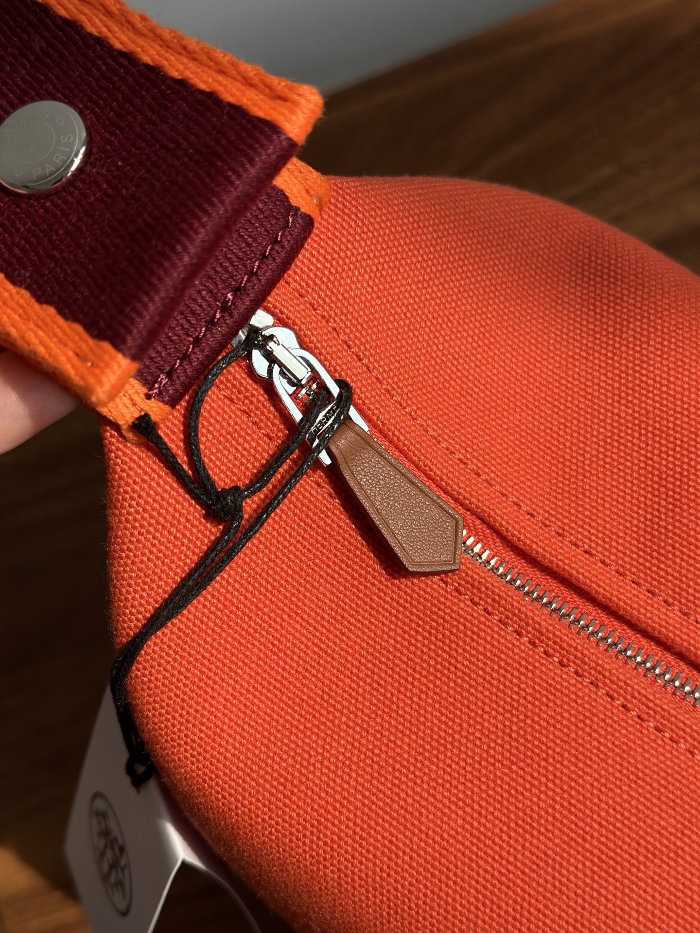 面料:日本进口H Plume帆布 特点是低调简约,包身整体是纯色或简单的条纹,上面印有小小的“H”字母图案,整体风格偏向现代、休闲和“老钱风”。 它没有大面积的标志性 logo,更显克制和高级! 手感与耐用性:由100%棉制成,手感柔软轻盈。 它的耐用性不错,但相比人字纹,表面相对光滑,没有粗犷的纹理感! ❗️这种材料需要特殊对纹 所以这里的每一只Bride-a-Brac洗漱包都是纯手工开料…配件 缝制工艺:爱马家的精髓就是纯手工制作的工匠精神! 你看似一个简单的布包 实则产量极低,真正的人工费也不比材料便宜! 这就是为何柜子售价¥6500 还如此受欢迎!!!