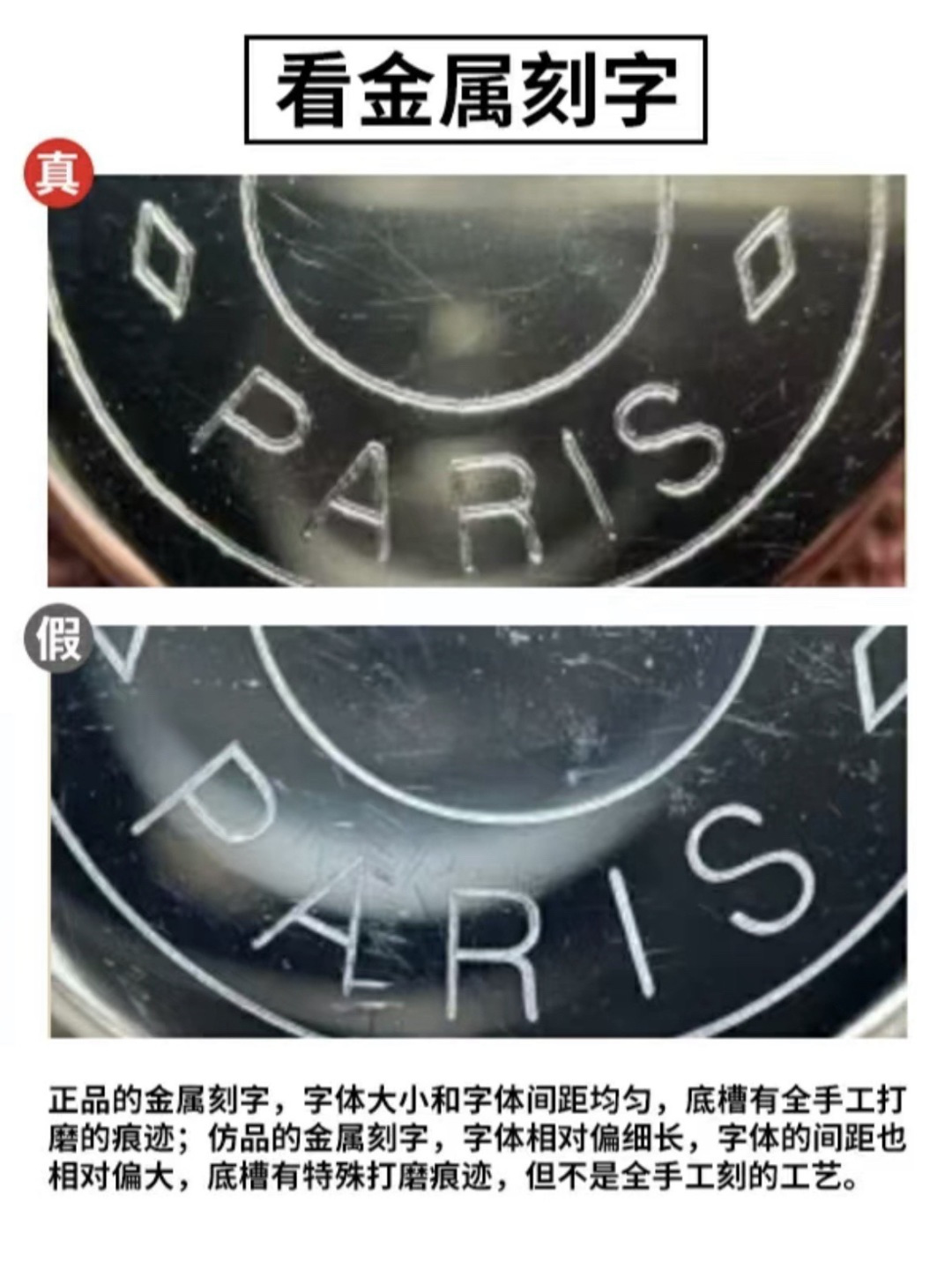 再来看一下按扣! zp字体大小间距均匀 底槽有手工打磨的痕迹❗️非市面普通机刻版字体根本就不对,字体的间距也相对偏大,注意区分