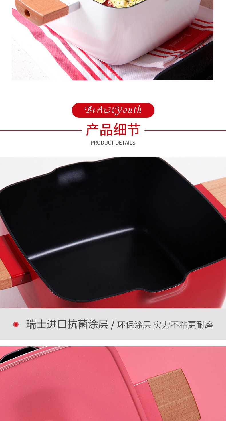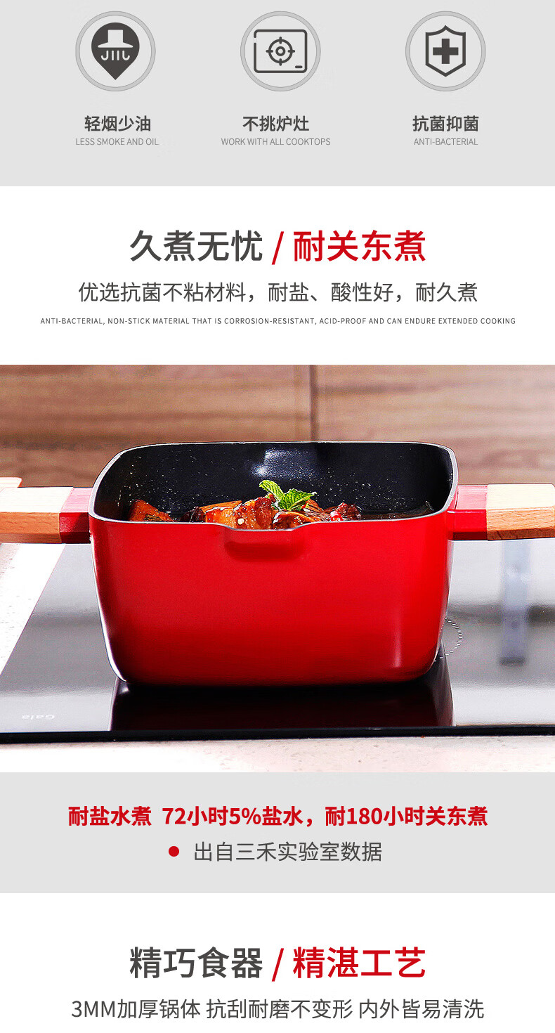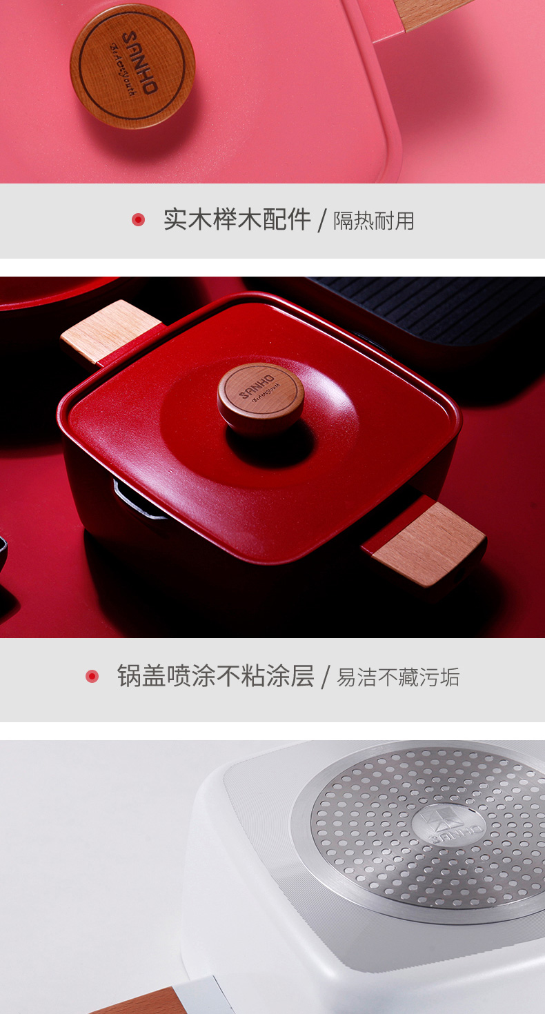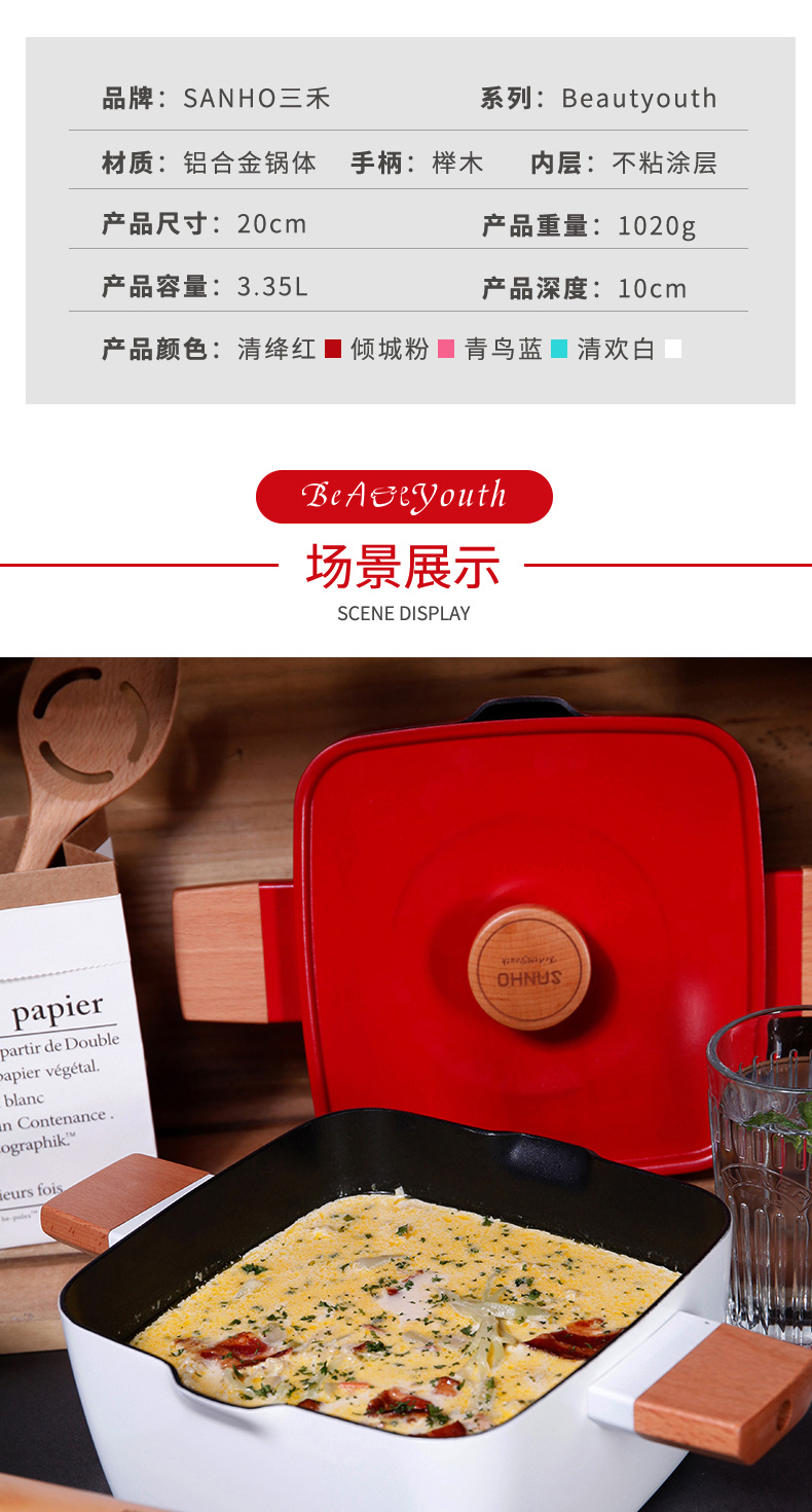三禾锅具Beautyouth小清新不粘锅汤锅双耳炖锅电磁炉通用家用燃气方锅炖锅 LT2020E1