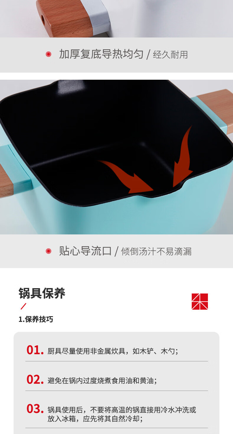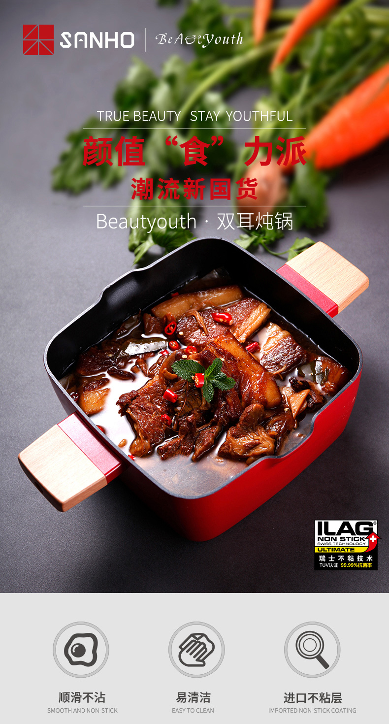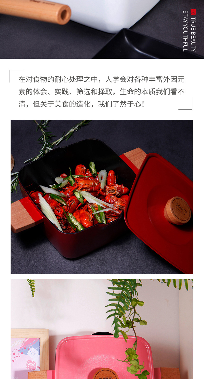 三禾锅具Beautyouth小清新不粘锅汤锅双耳炖锅电磁炉通用家用燃气方锅炖锅 LT2020E1