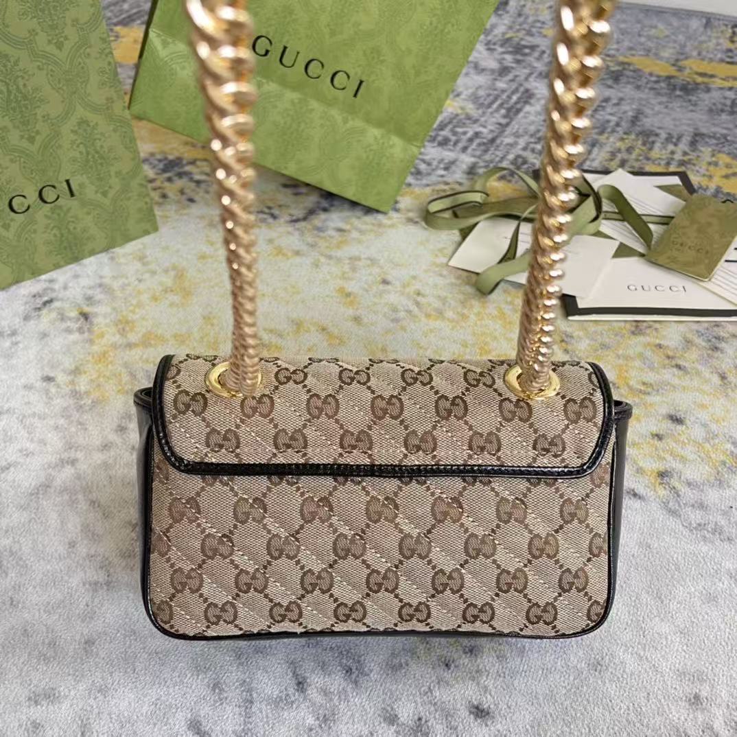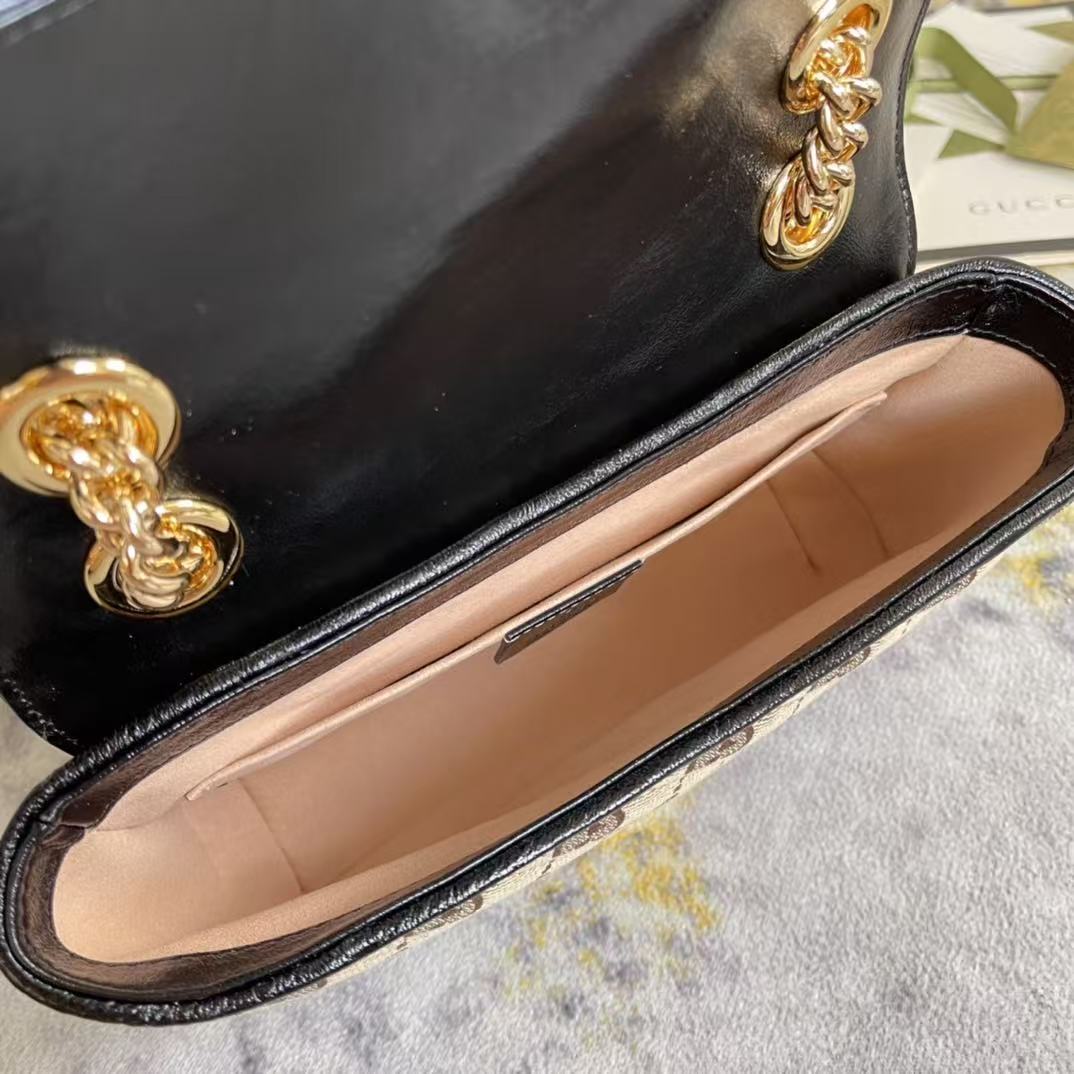 GG Marmont系列,优雅精巧的设计可是俘获了不少少女的芳心!同时也是全球达人必备的百搭单品!超级赞!型号:443497。尺寸:26*15*7cm。颜色:黑/杏布