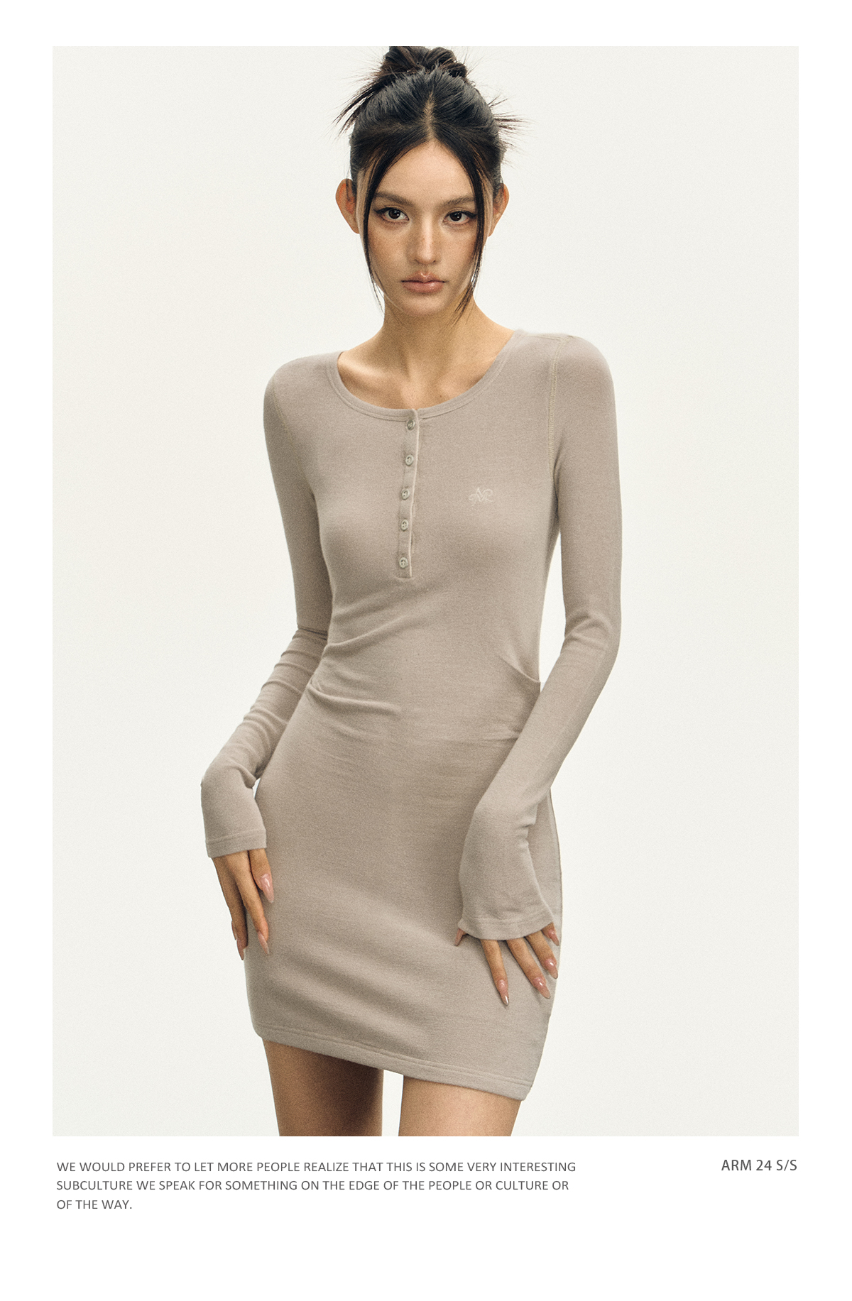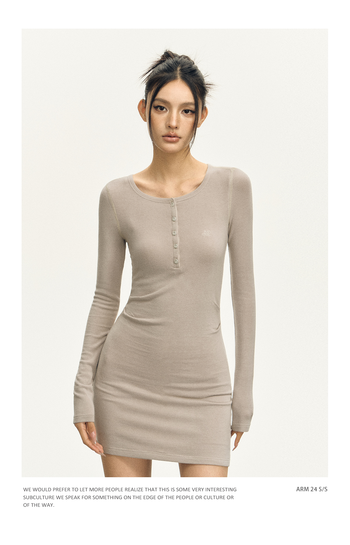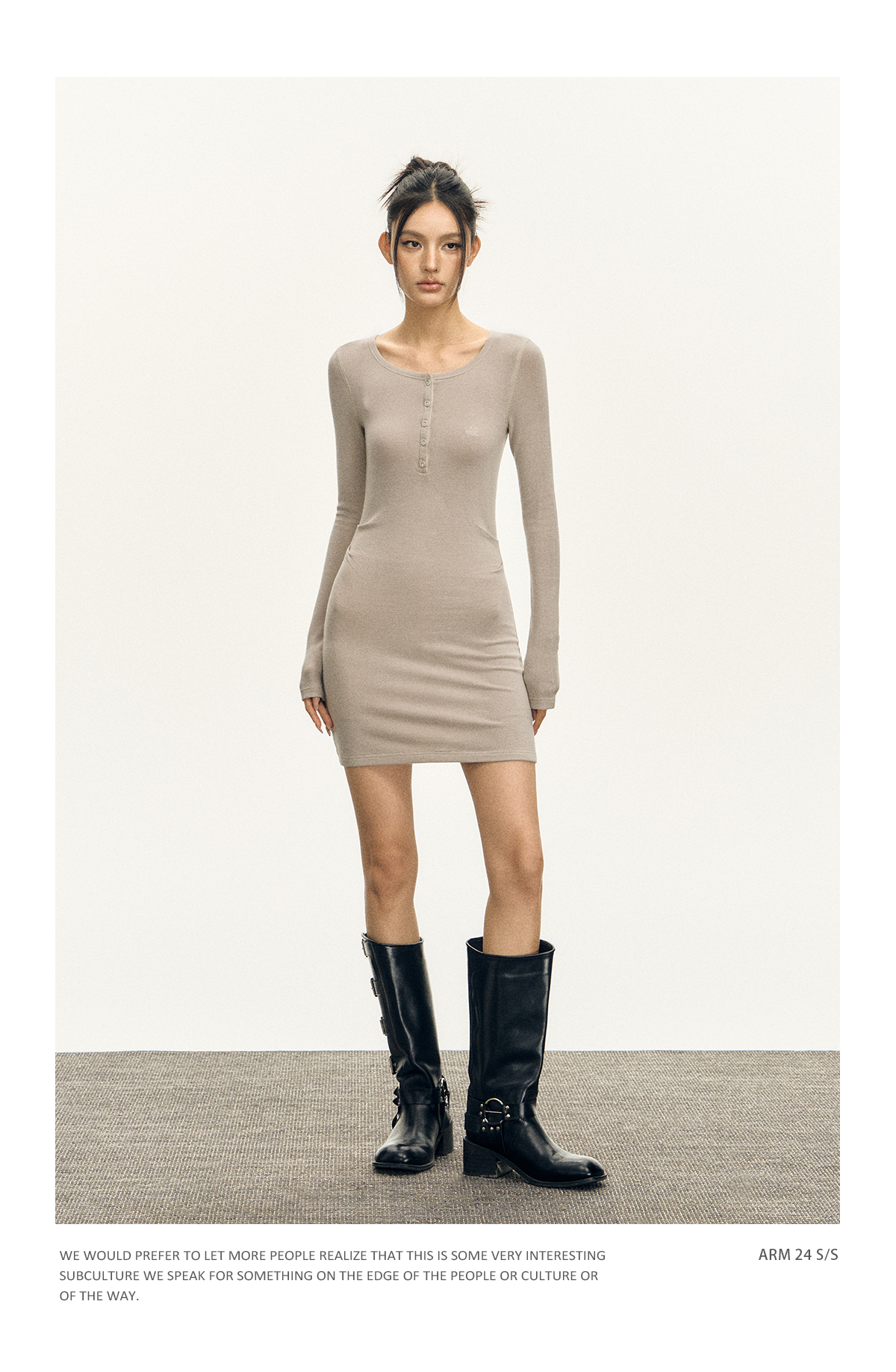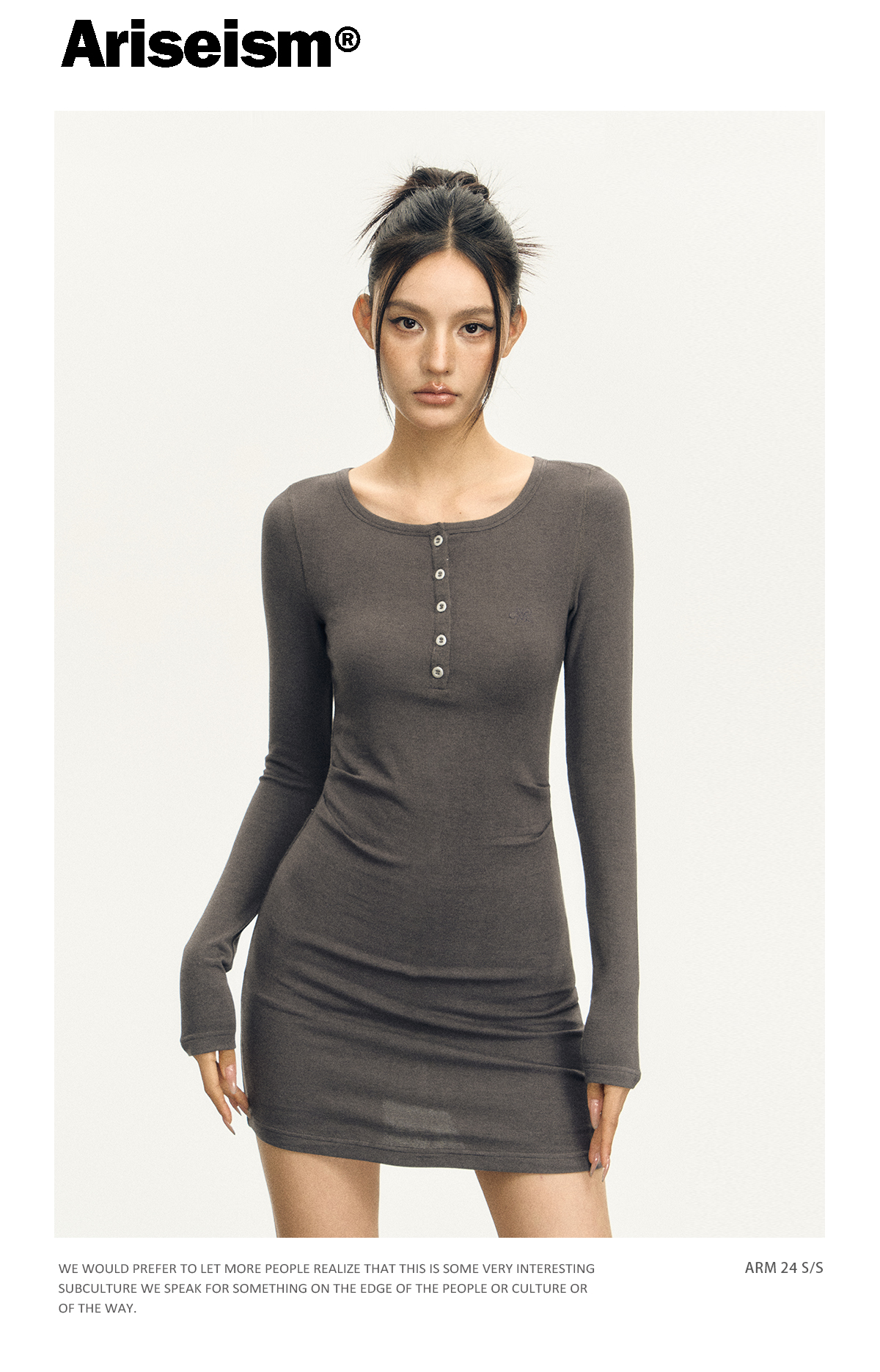 Ariseism 美式复古亨利领修身长袖连衣裙女春季新款包臀长裙子