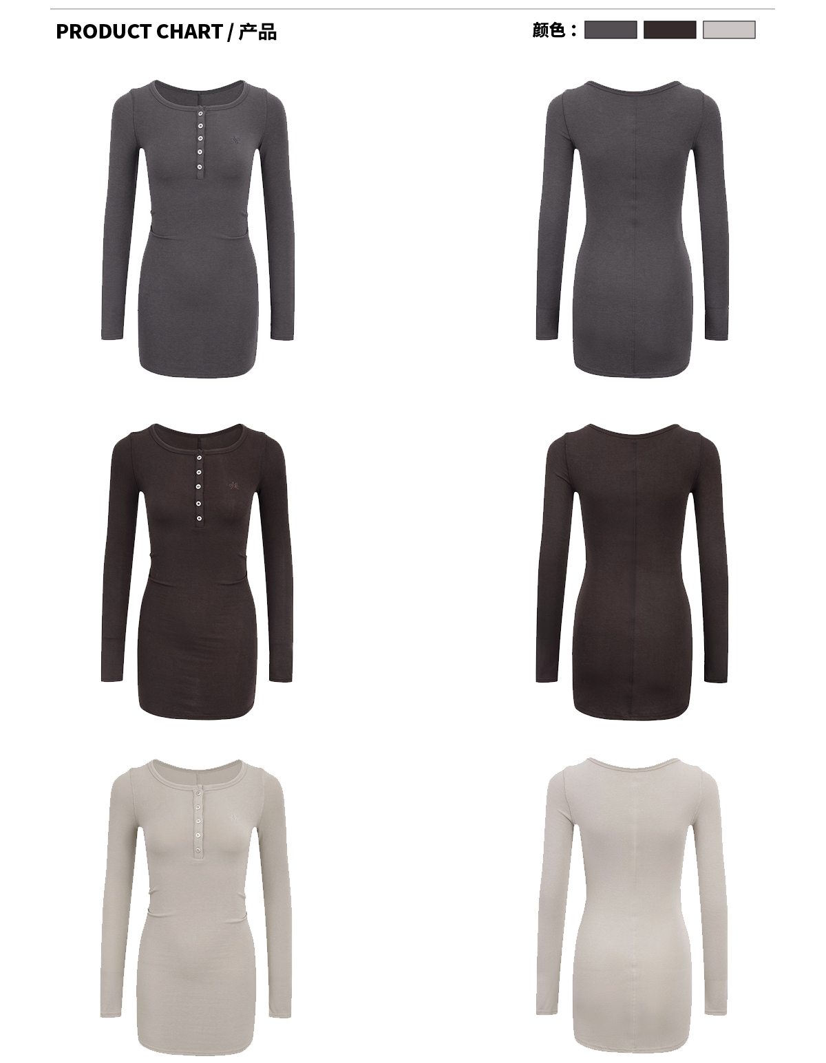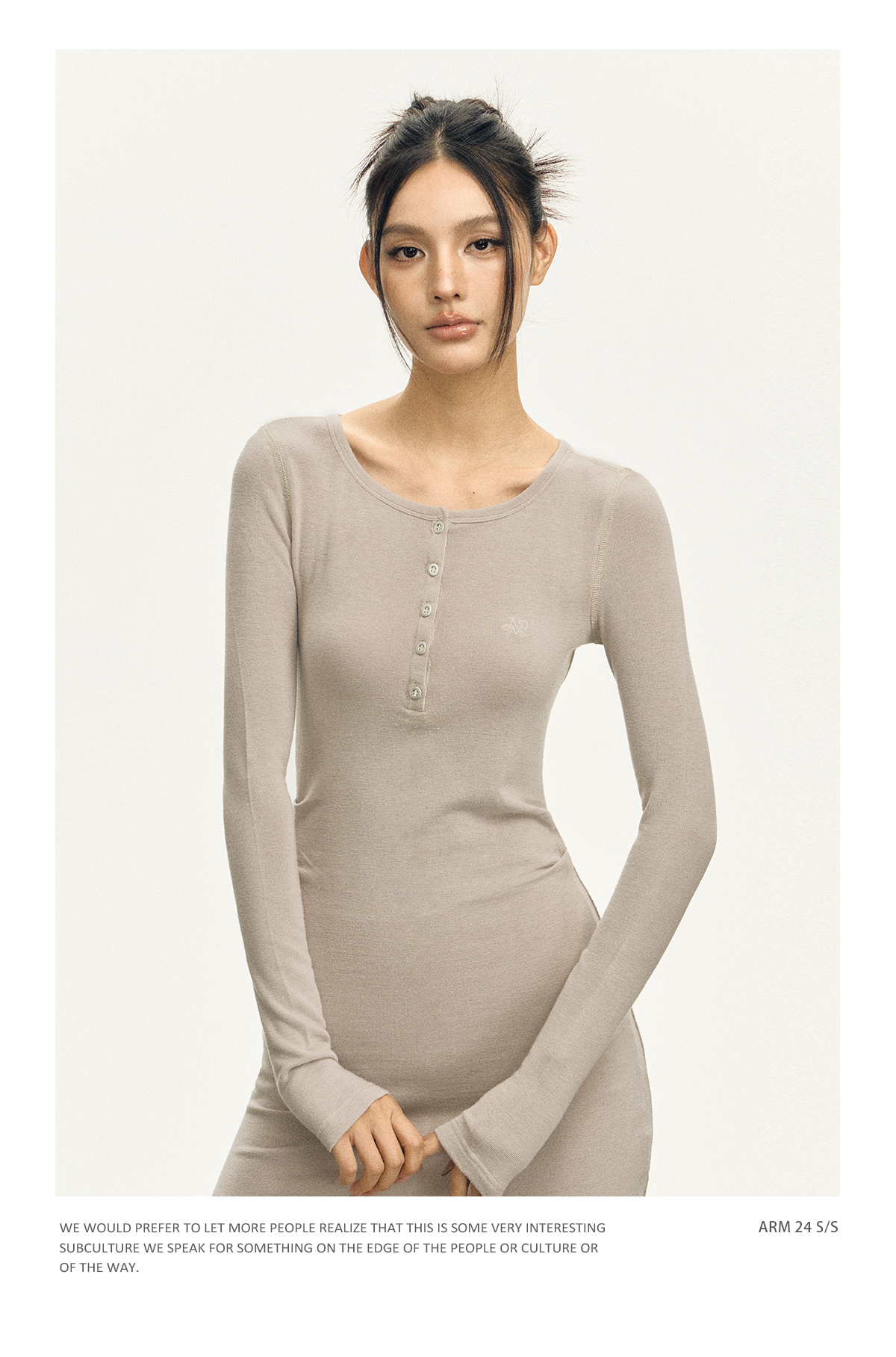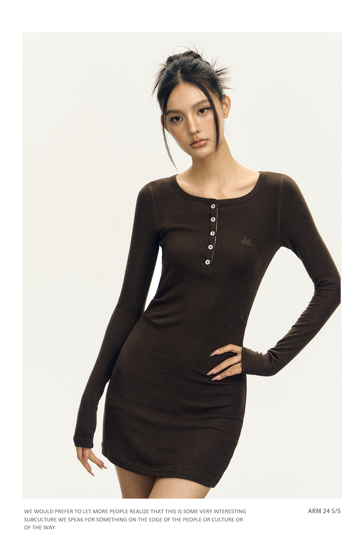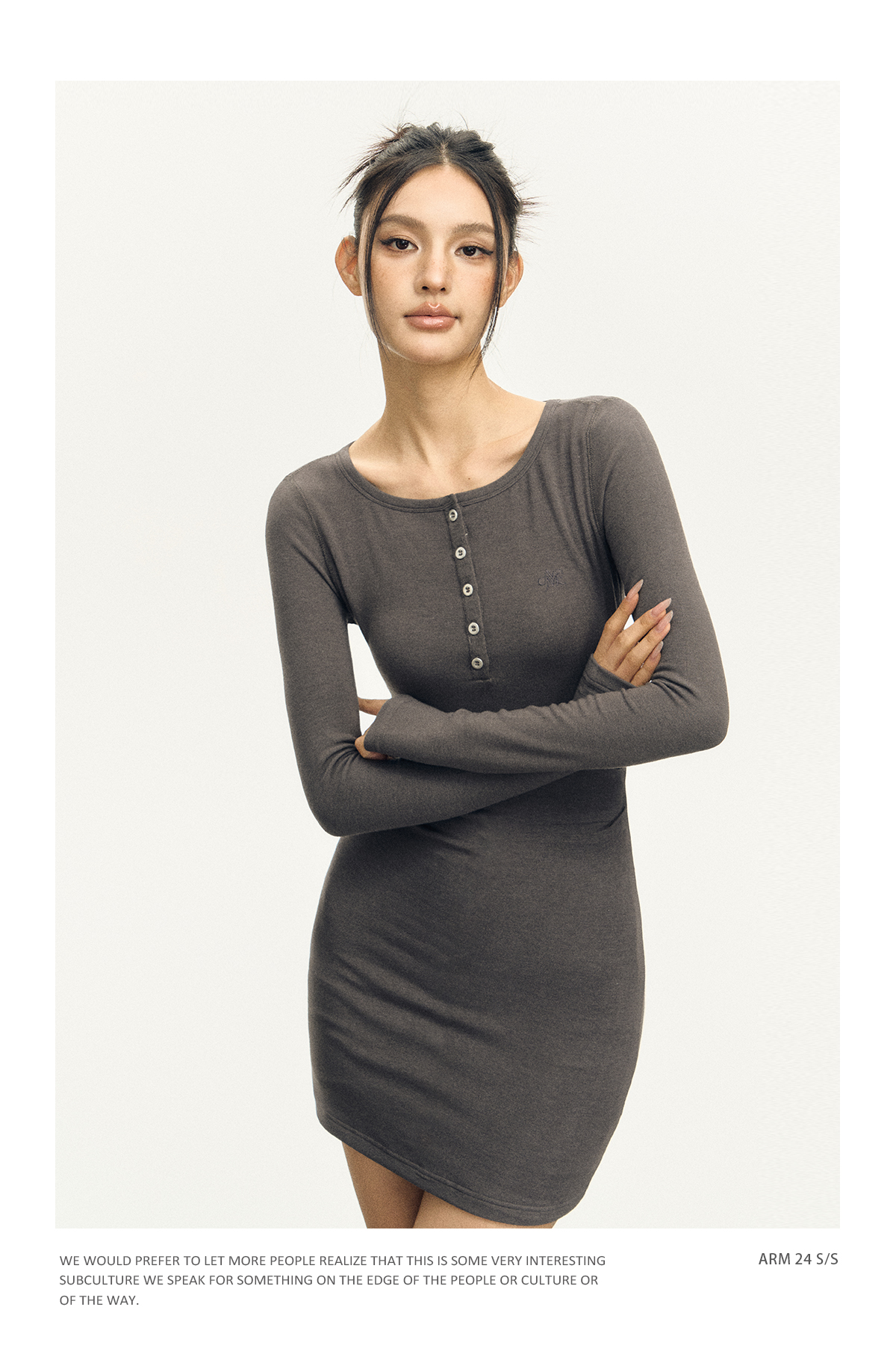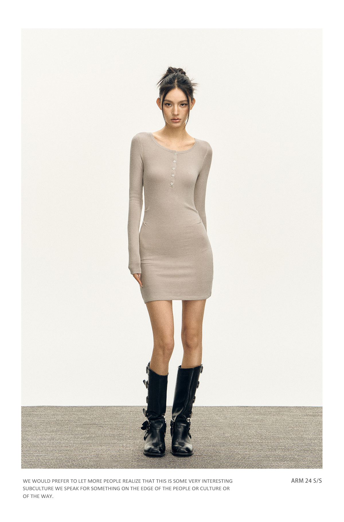 Ariseism 美式复古亨利领修身长袖连衣裙女春季新款包臀长裙子