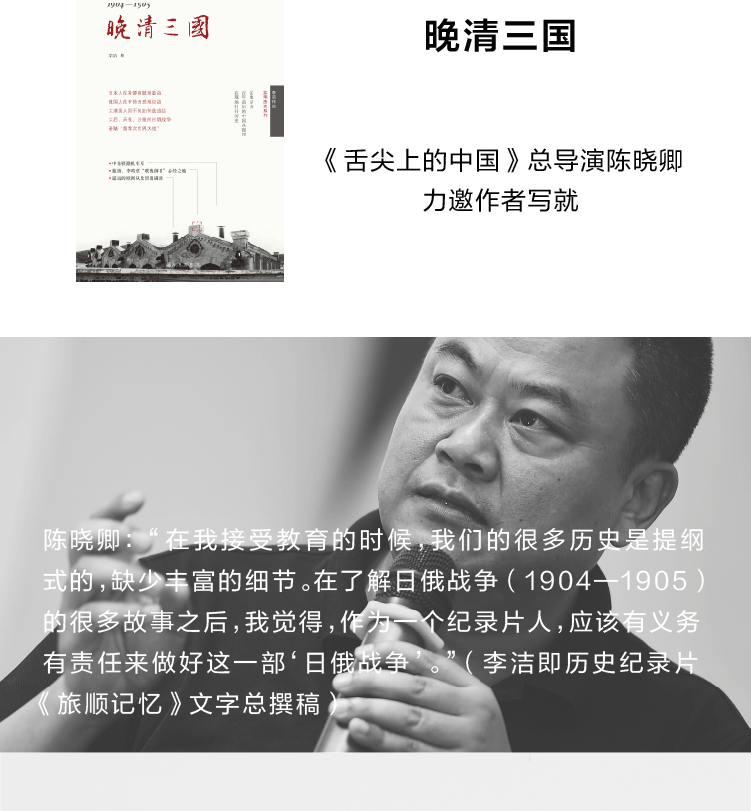 《晚清三国》作者两度造访旅顺口,三度在辽宁大地上驱车驰骋,重寻当年日军的进军路线,或曰沿当年俄军的败北路线,车轮逐次碾过丹东、凤凰城、新宾、本溪、辽阳、沈阳、铁岭、法库和昌图,逐一打探战争遗迹。2015年阳春、仲夏和深秋,作者还曾三次东渡日本,就近解读战争的策源地和一代军政巨头的生长环境。俄罗斯海军节那天(每年7月的最后一个星期日),作者曾专程赶到远东名城海参崴,零距离地打量节日中的太平洋舰队,日俄战争期间的开头与结尾,都与这支舰队有关。