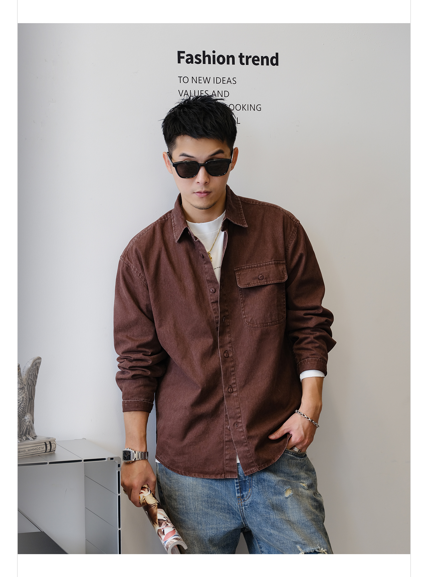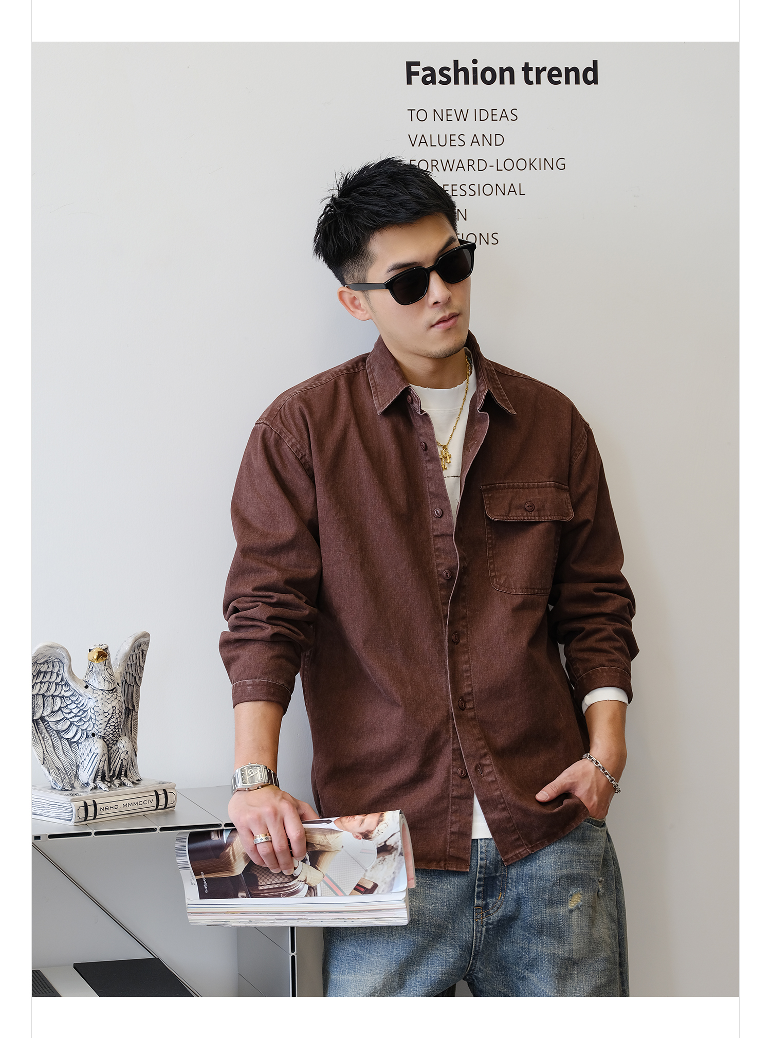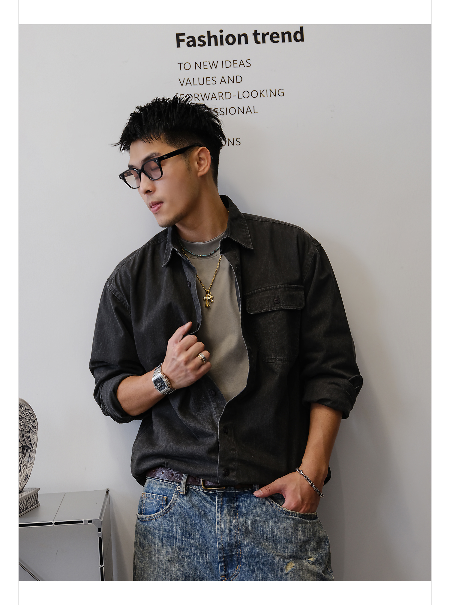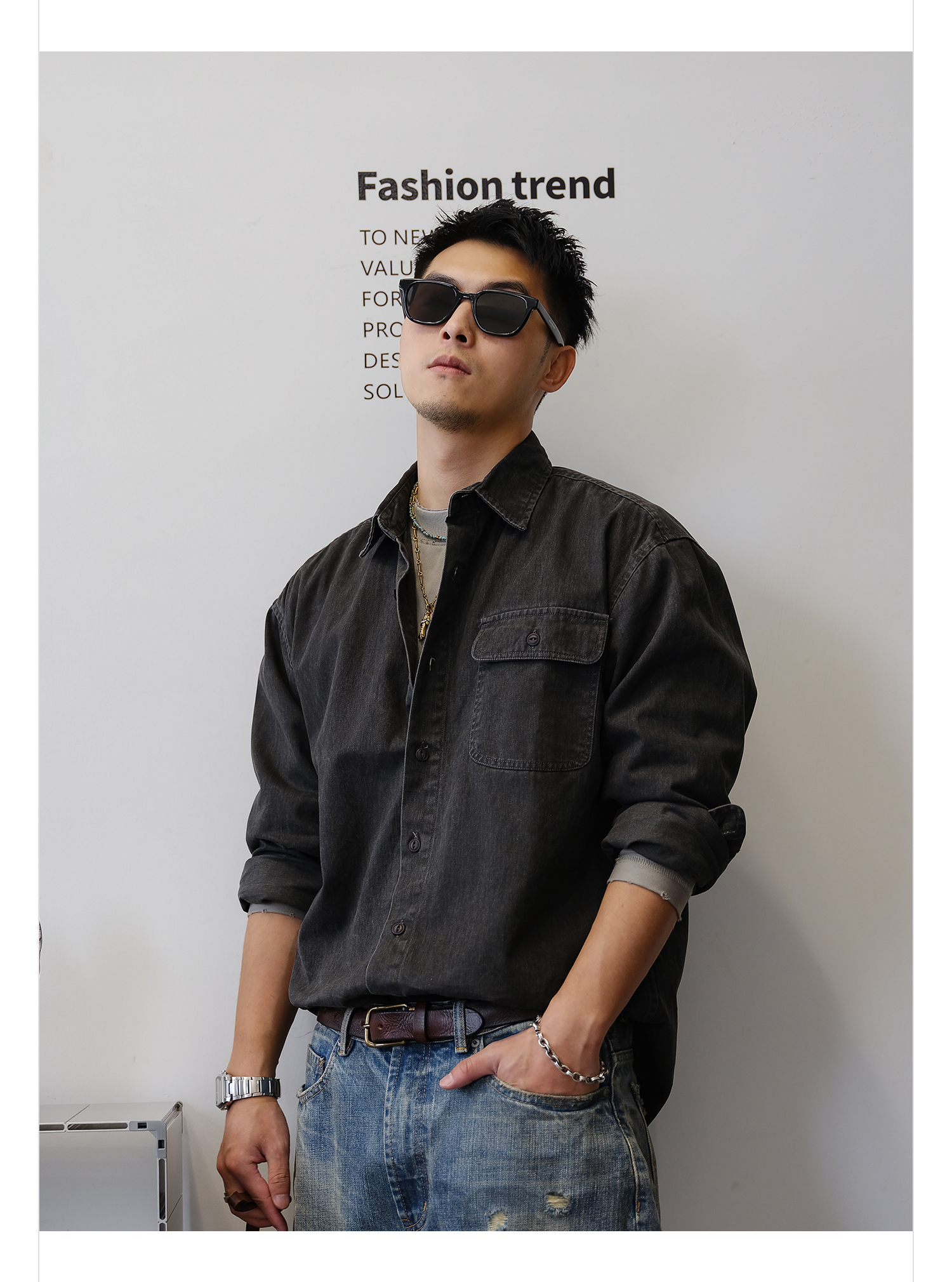 徐太浪240g日系复古牛仔长袖衬衫男秋季2025新款纯棉方领衬衣外套