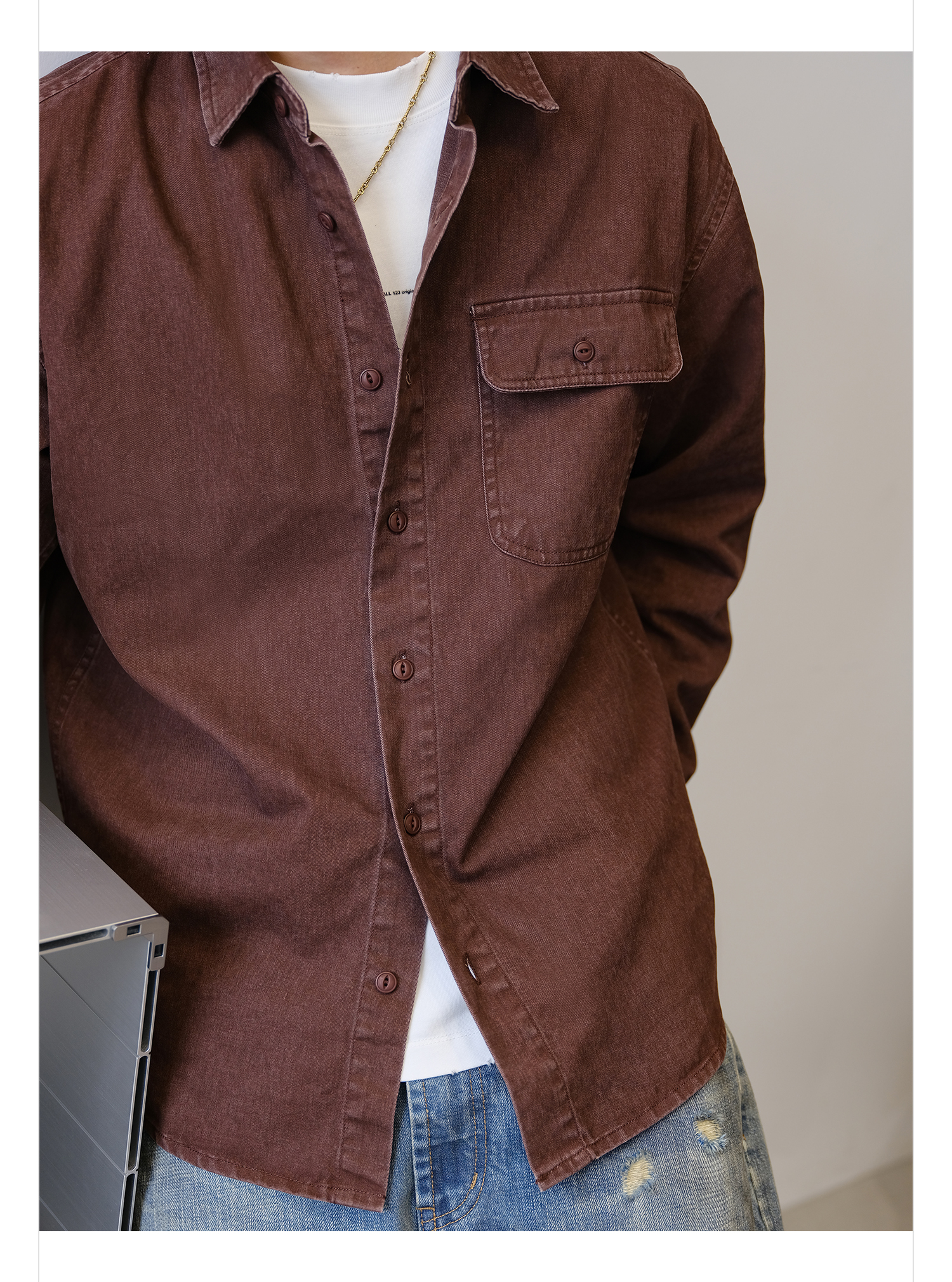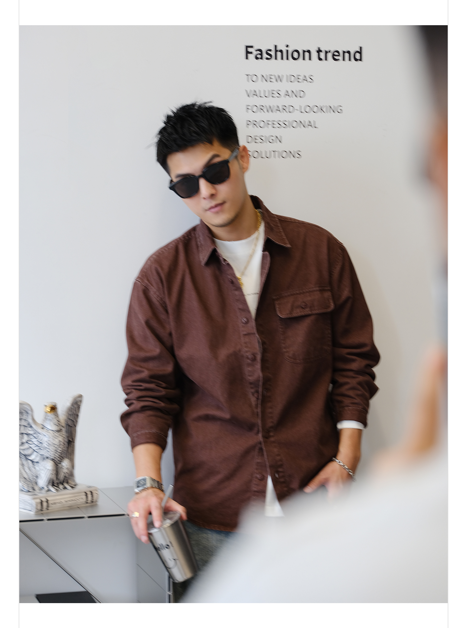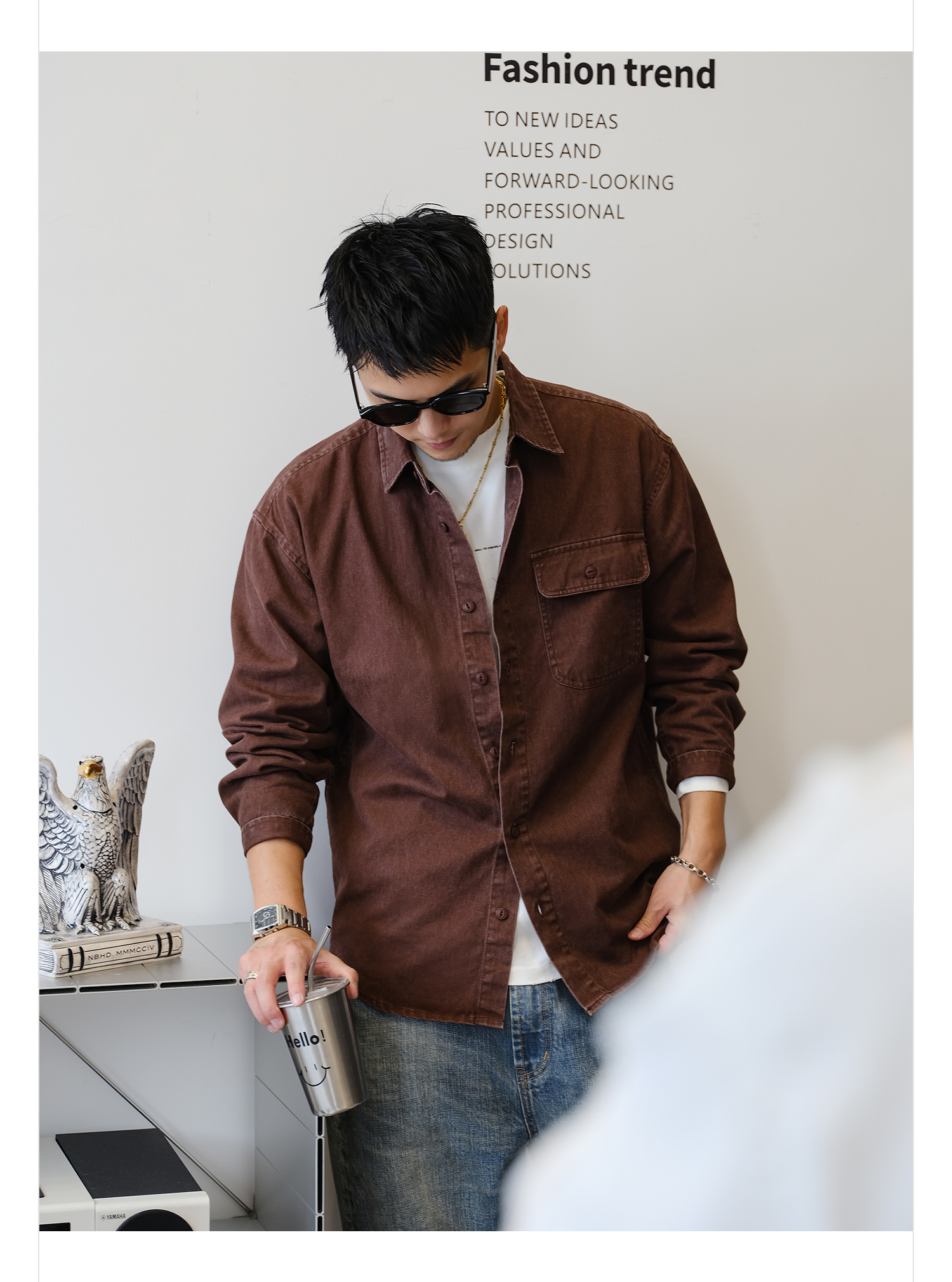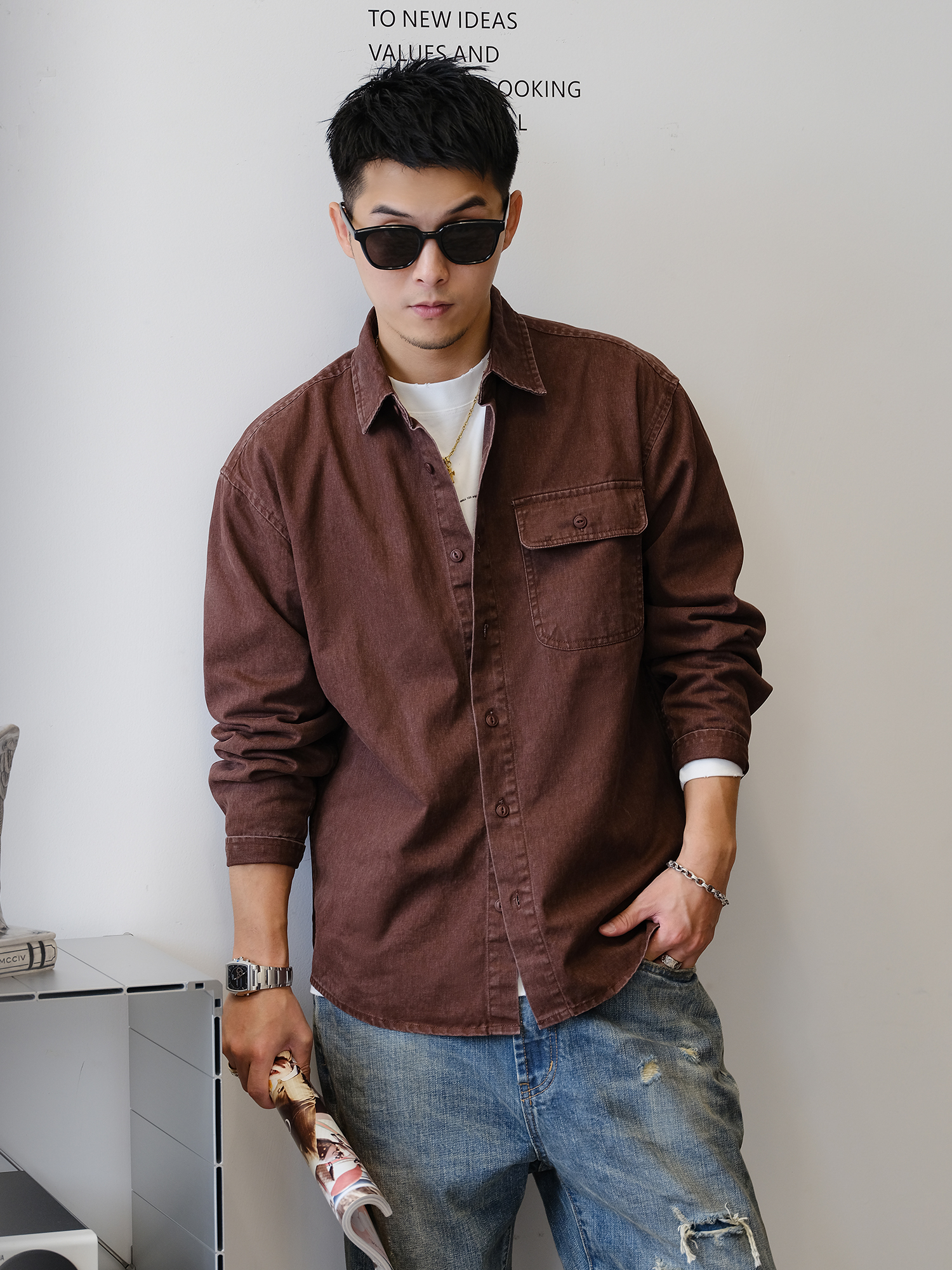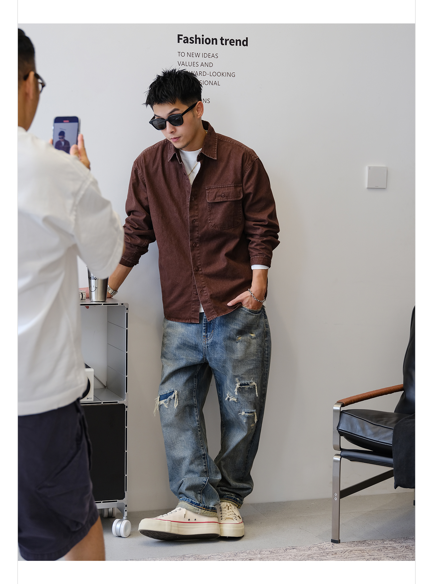 徐太浪240g日系复古牛仔长袖衬衫男秋季2025新款纯棉方领衬衣外套