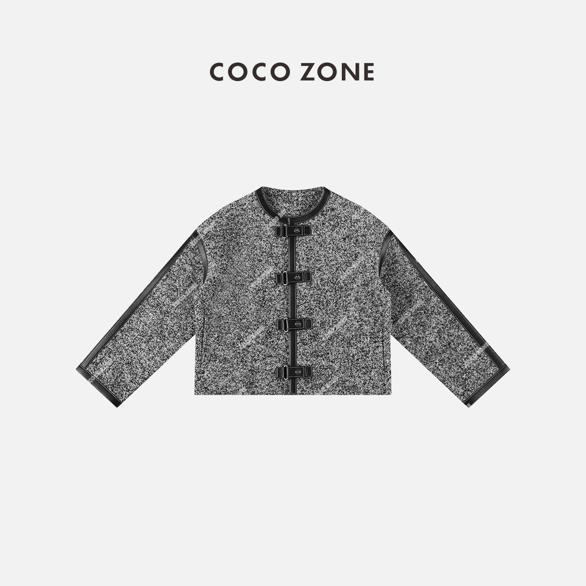COCO ZONE 法式气质拼皮外套圆领单配扣设计感毛呢23C29646