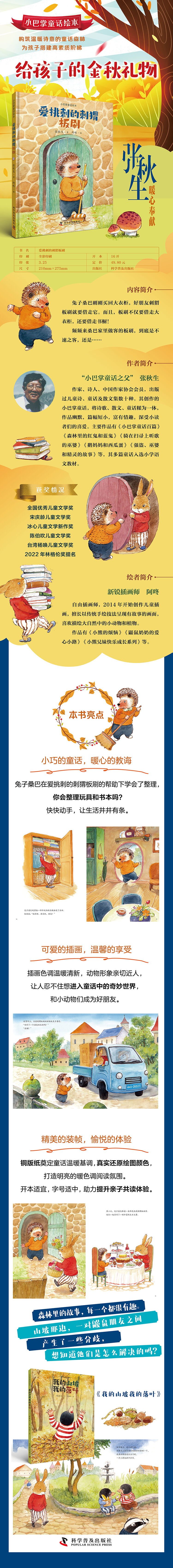 适读人群 :3-6岁 ※小巧的童话,暖心的教诲 精选自“小巴掌童话”之父张秋生的经典童话作品。张秋生创作的“小巴掌童话”,故事虽然如巴掌一样小巧,但蕴含深刻的道理。《爱挑刺的刺猬板刷》给孩子讲述了兔子桑巴在爱挑刺的刺猬板刷的帮助下学会了整理的故事,在潜移默化中培养孩子整理玩具、书本等身边的事物的意识,让生活井井有条。 ※可爱的插画,温馨的享受 新锐插画师阿咚有其独特的绘画风格,他笔下的插画,色调温暖清新,动物形象亲切近人,让人忍不住想进入童话中的奇妙世界,和小动物们成为好朋友。 ※精美的装帧,愉悦的体验 封面和内页均选用铜版纸,更好地奠定童话温暖基调,真实还原绘图颜色,打造明亮的暖色调阅读氛围。开本适宜易翻阅,字号适中更护眼,助力提升亲子共读体验。