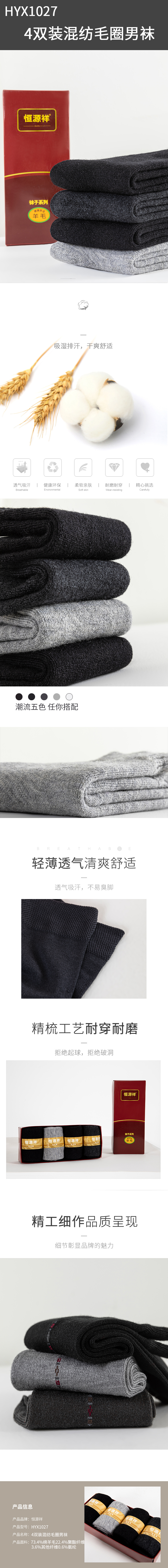 恒源祥 HYX1027 4双装混纺毛圈男袜 单位:盒