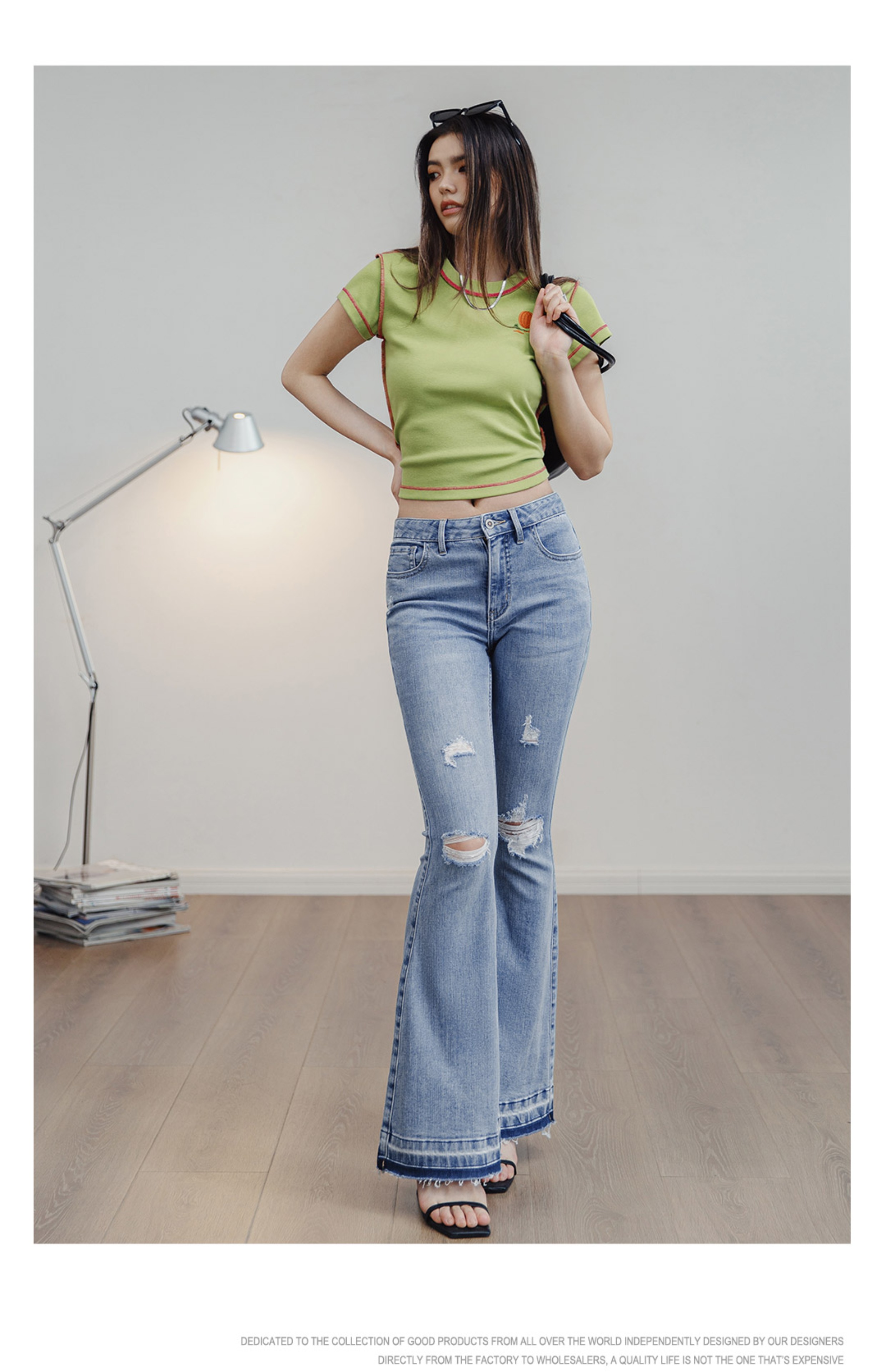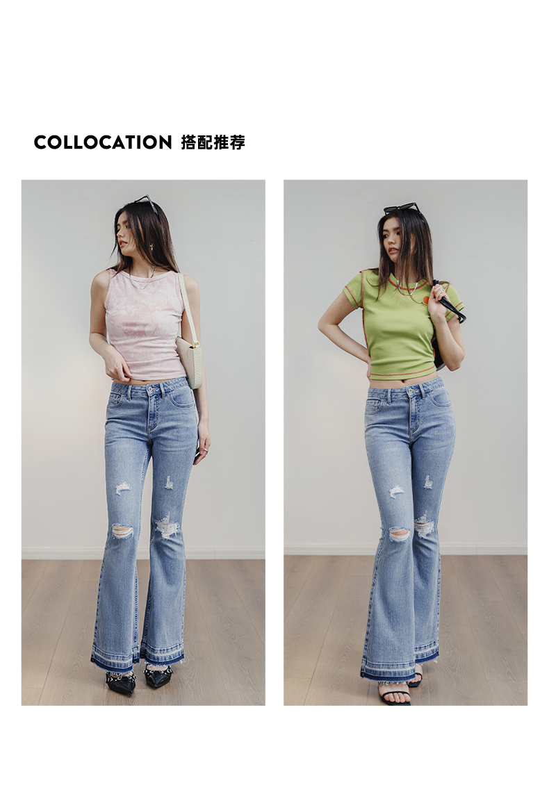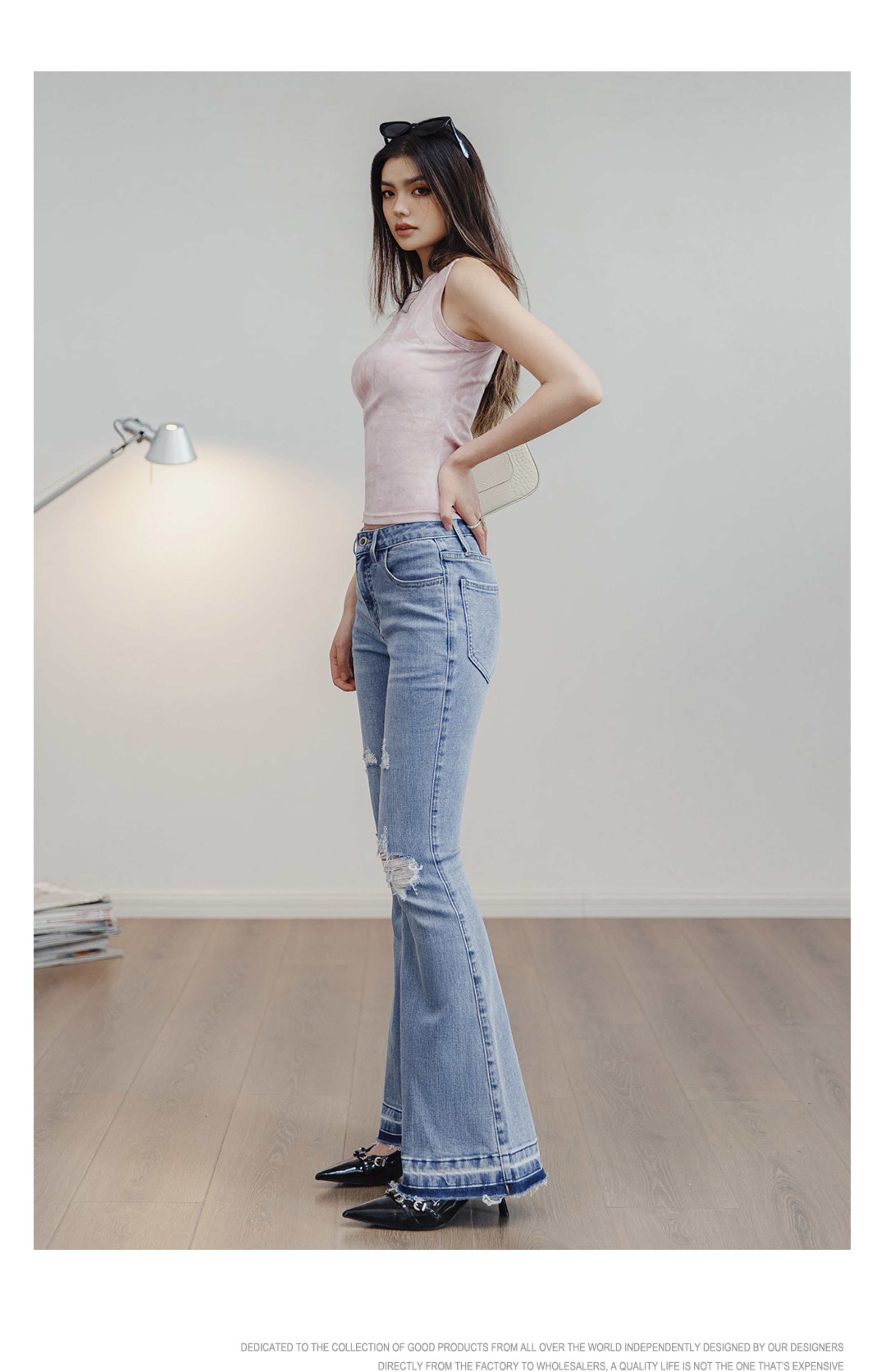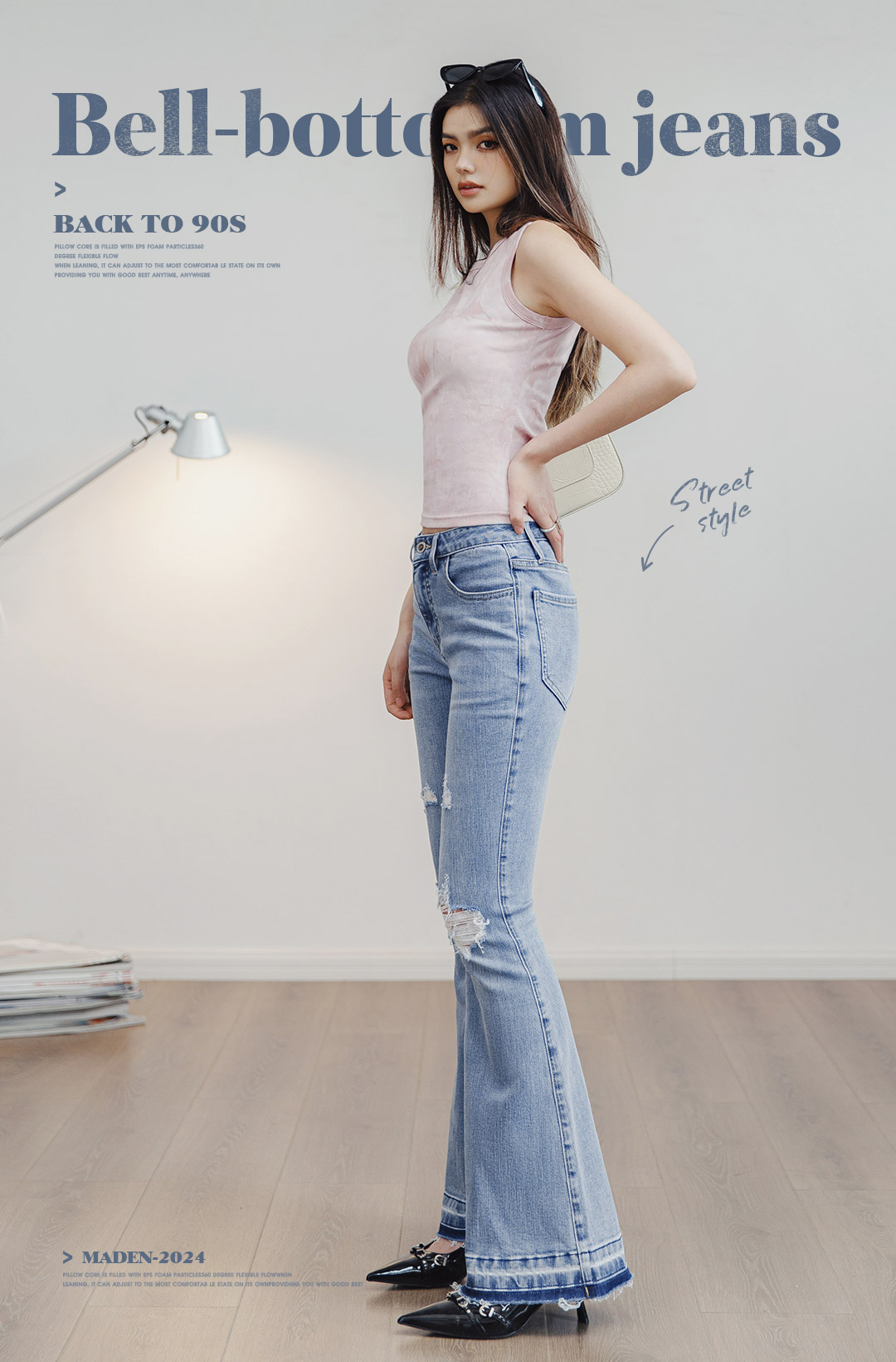 马登破洞浅色牛仔裤复古修身微喇叭裤显瘦长款马蹄裤毛边长裤夏女