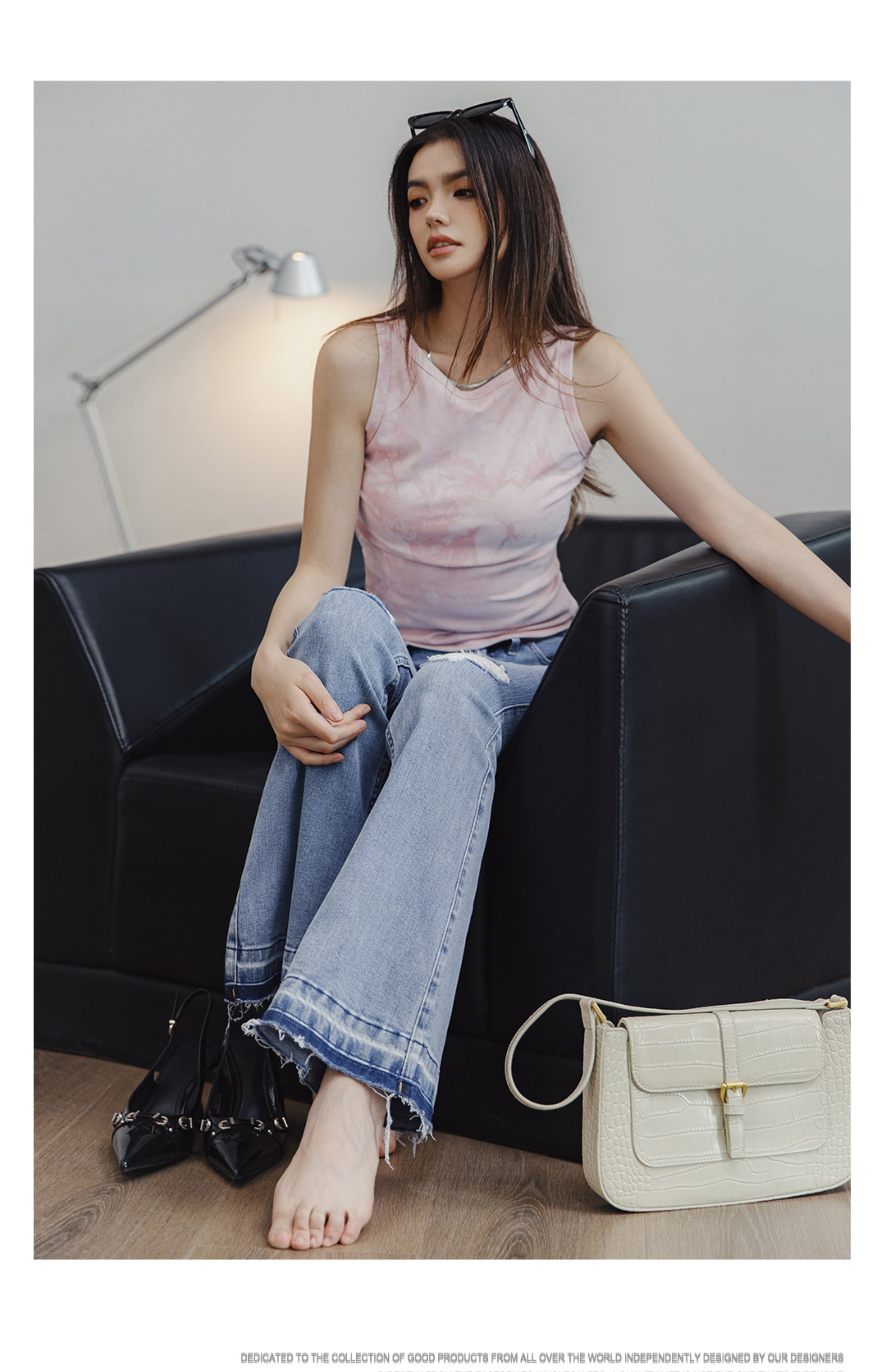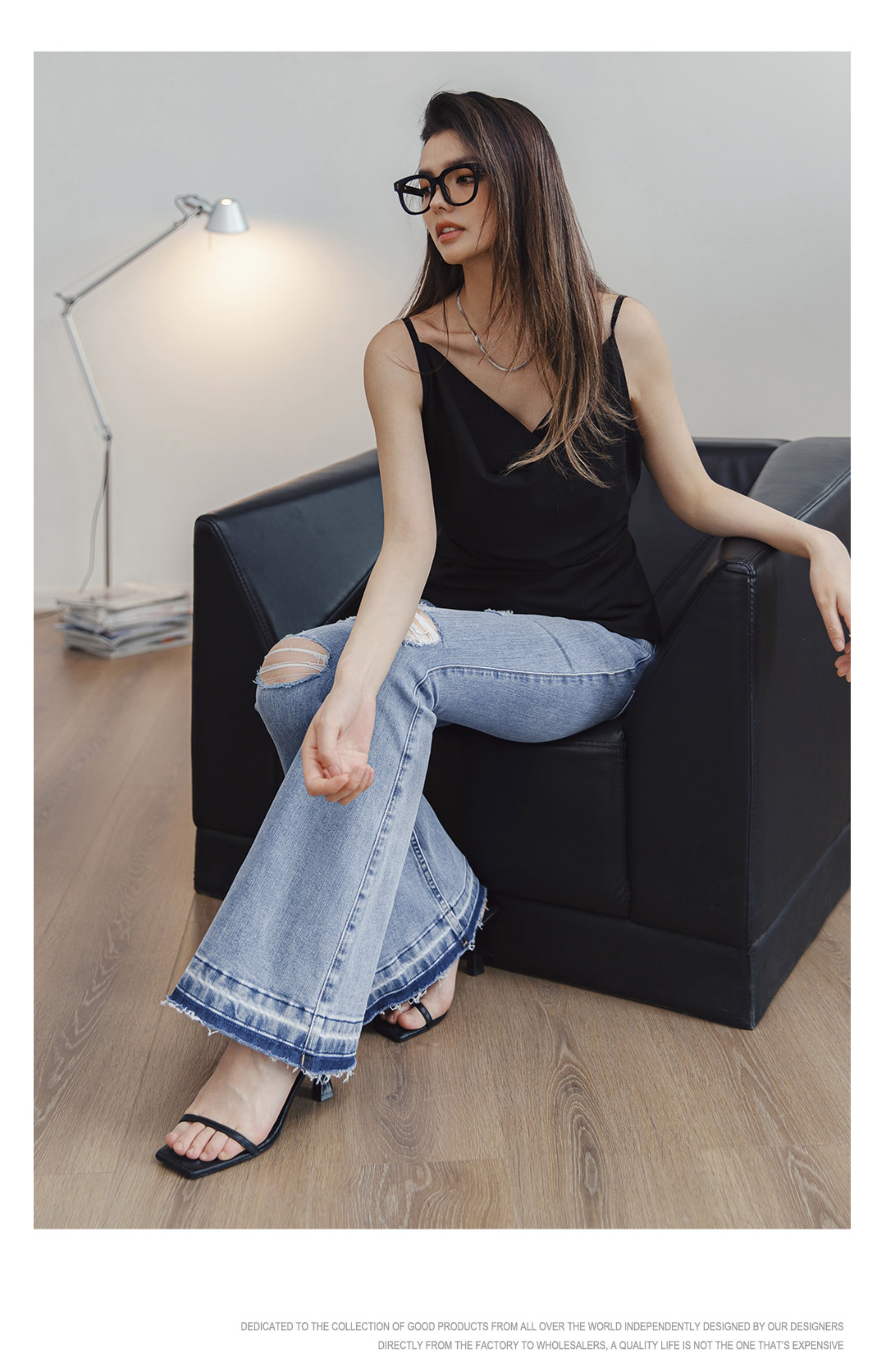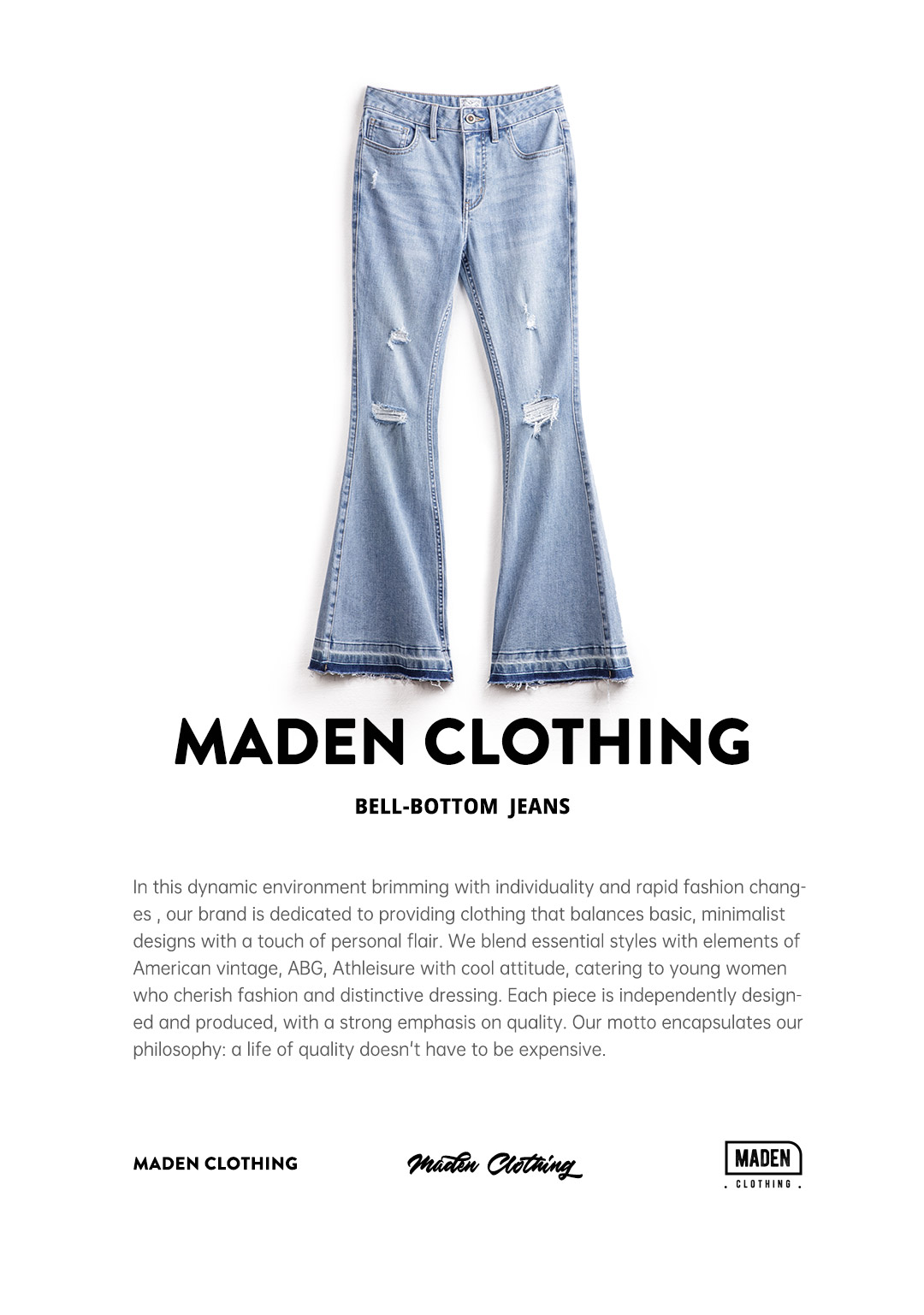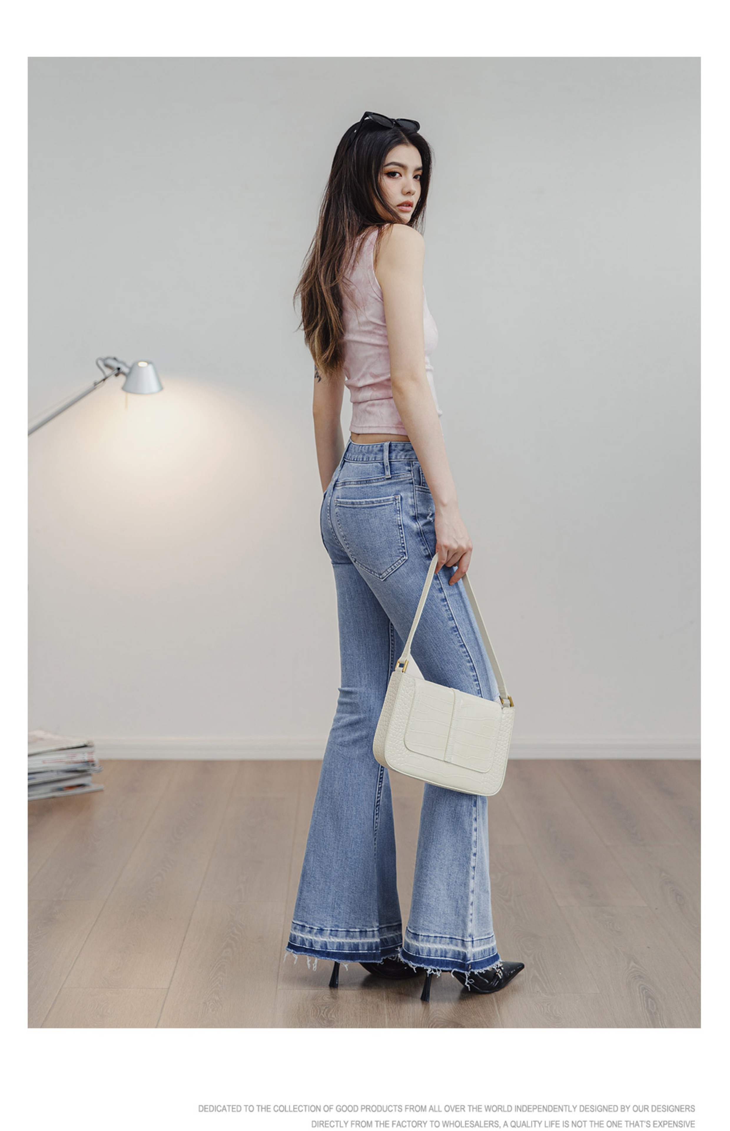 马登破洞浅色牛仔裤复古修身微喇叭裤显瘦长款马蹄裤毛边长裤夏女