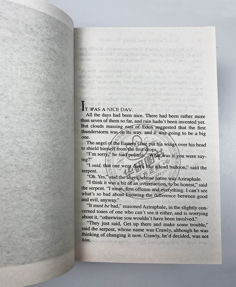 I WAS A NICE DAY. All the days had been nice. There had been rather more than seven of them so far, and rain hadn’t been invented yet. But clouds massing east of Eden suggested that the first thunderstorm was on its way, and it was going to be a big one. The angel of the Eastern Gate put his wings over his head to shield himself from the first drops. ‘I’m sorry,” he said politely. “What was it you were saying?” “1 said, that one went down like a lead balloon,” said the serpent. “Oh. Yes.” said the angel, whose name was Aziraphale. ‘I think it was a hit of an overreaction, to be honest.” said the serpent. “I mean, first offense and everything. I can’t see what’s so bad about knowing the difference between good and evil, anyway.” “It must be bad.” reasoned Aziraphale, in the slightly concerned tones of one who can’t see it either, and is worrying about it. “otherwise you wouldn’t have been involved.” “They just said. Get up there and make some trouble,” said the serpent, whose name was Crawly, although he was thinking of changing it now. Crawly, he’d decided, was not him. “Yes, but you’re a demon. I’m not sure if it’s actually possible for you to do good,” said Airaphale. “It’s down to your basic, you know, nature. Nothing personal, you understand.” “You’ve got to admit it’s a bit of a pantomime. though.” said Crawly. “I mean, pointing out the Tree and saying ‘Don’t Touch’ in big letters. Not very subtle, is it? I mean, why not put it on top of a high mountain or a long way off? Makes you wonder what He’s really planning.” “Best not to speculate, really,” said Aziraphale. “You can’t second-guess ineffability, 1 always say. There’s Right, and there’s Wrong. If you do Wrong when you’re told to do Right, you deserve to be punished. Er.” They sat in embarrassed silence, watching the raindrops bruise the first flowers.