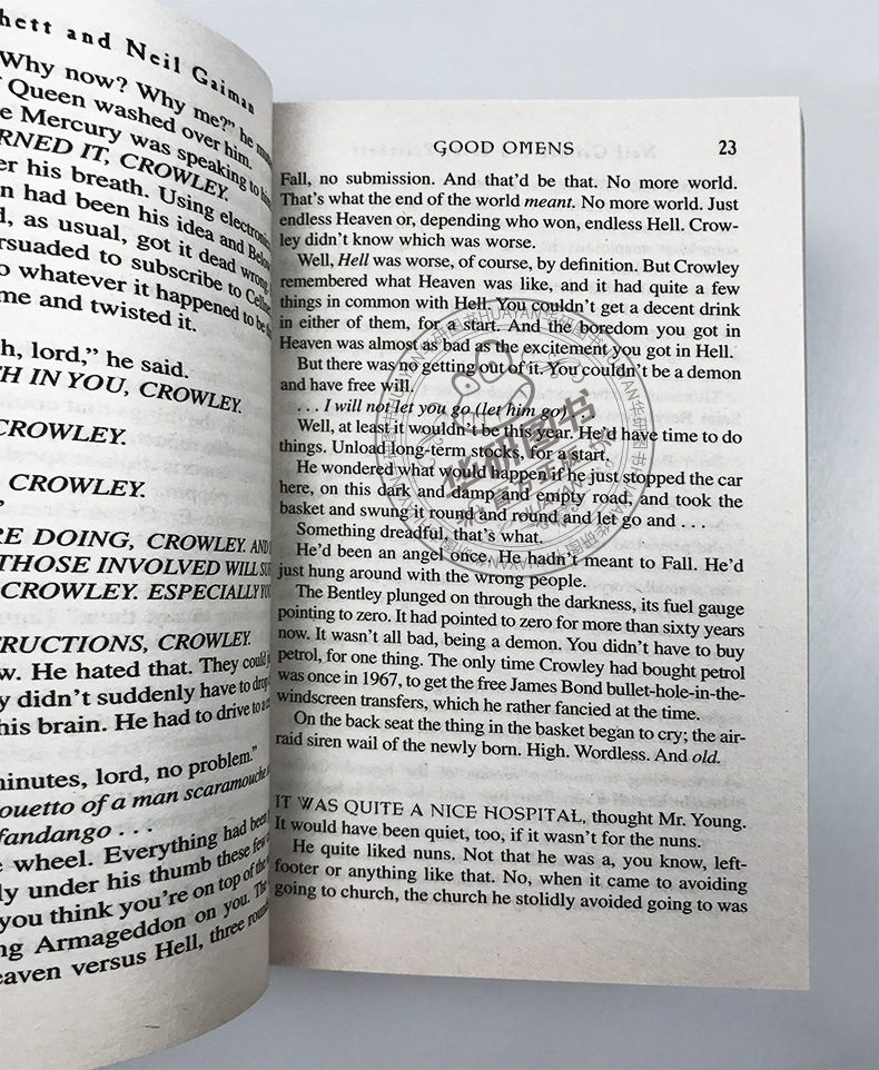 Good Omens《好兆头》是由英国奇幻作家尼尔·盖曼和特里·普拉切特写的一部奇幻小说,讲述了世界末日(即善恶大决战)的故事。本书还被BBC改编为广播剧,深受读者和观众的喜爱。 According to The Nice and Accurate Prophecies of Agnes Nutter, Witch (the world's only completely accurate book of prophecies, written in 1655, before she exploded), the world will end on a Saturday. Next Saturday, in fact. Just before dinner. So the armies of Good and Evil are amassing, Atlantis is rising, frogs are falling, tempers are flaring. Everything appears to be going according to Divine Plan. Except a somewhat fussy angel and a fast-living demon—both of whom have lived amongst Earth's mortals since The Beginning and have grown rather fond of the lifestyle—are not actually looking forward to the coming Rapture. And someone seems to have misplaced the Antichrist . . . Review “The Apocalypse has never been funnier.”(Clive Barker) “Hilariously naughty.” (Kirkus Reviews) “Wacky and irreverent.” (Booklist) “Reads like the Book of Revelation, rewritten by Monty Python.” (San Francisco Chronicle) “Fiendishly funny.” (New Orleans Times-Picayune) “From beginning to end, GOOD OMENS is side-splittingly funny . . . a ripping good time.” (Rave Reviews) “If you’ve never read [GOOD OMENS], don’t miss it now. Grade: A.” (Rocky Mountain News) “It could be called The Hitchhiker’s Guide to Armargeddon.”(Palm Beach Post) “[L]ittle asides, quirky observations, simple puns and parody eventually add up to snorts, chortles and outright laughs.”(San Diego Union-Tribune) “What’s so funny about Armageddon? More than you’d think . . . GOOD OMENS has arrived just in time.”(Detroit Free Press)