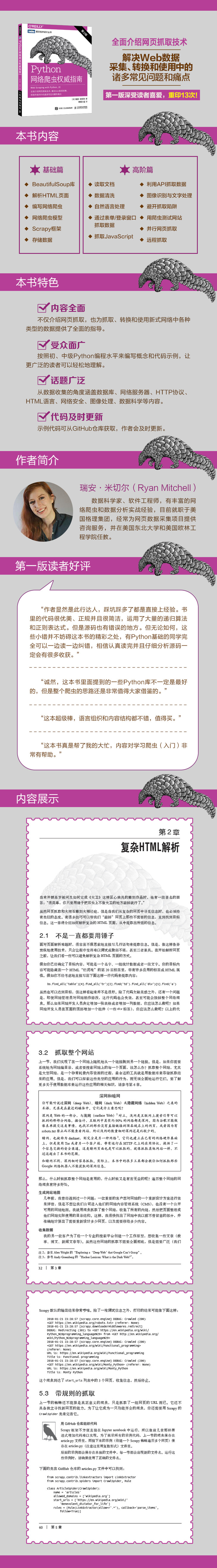 本书采用简洁强大的Python 语言,介绍了网页抓取,并为抓取新式网络中的各种数据类型提供了全面的指导。*一部分重点介绍网页抓取的基本原理:如何用Python 从网络服务器请求信息,如何对服务器的响应进行基本处理,以及如何以自动化手段与网站进行交互。*二部分介绍如何用网络爬虫测试网站,自动化处理,以及如何通过更多的方式接入网络。