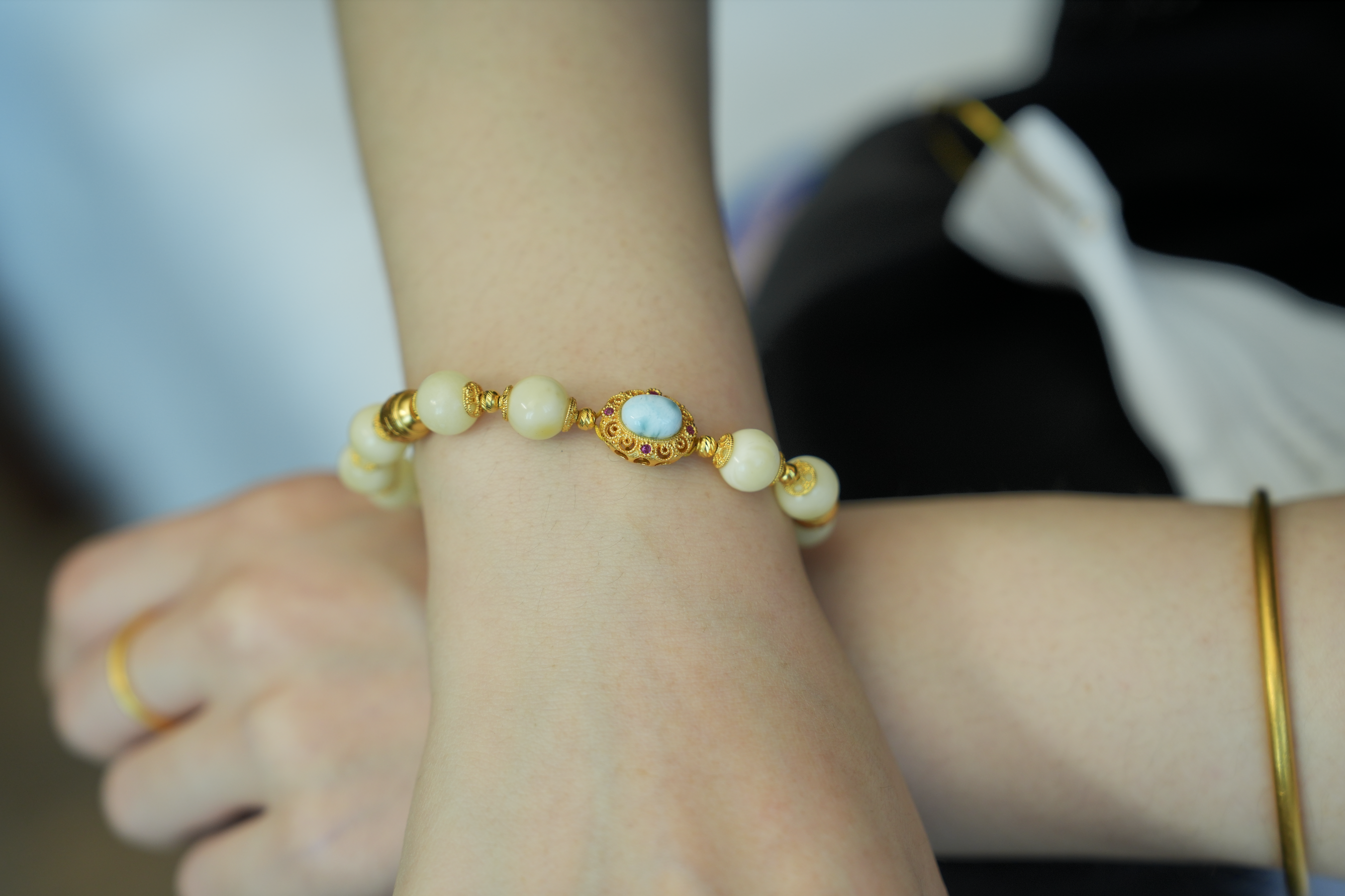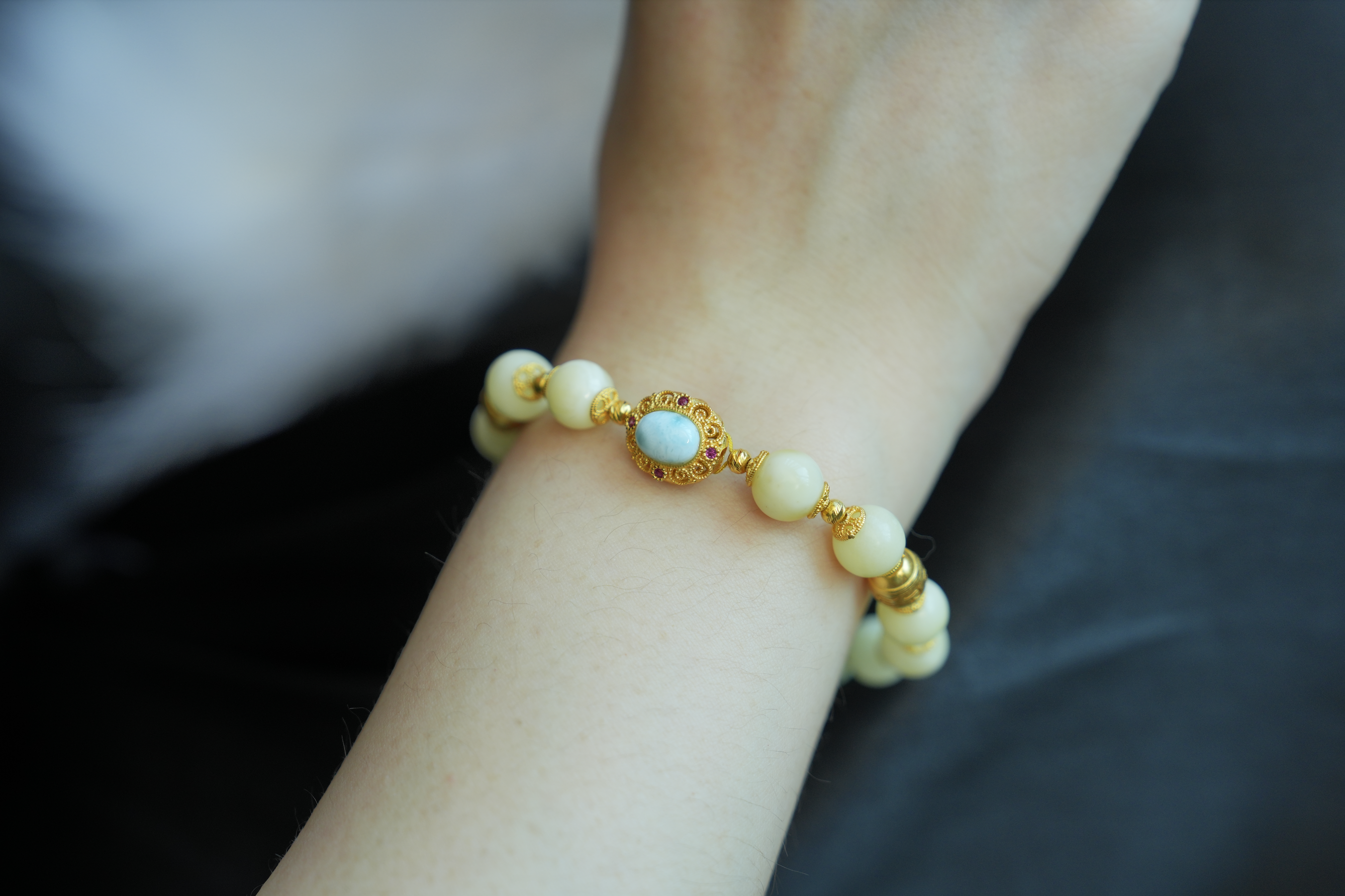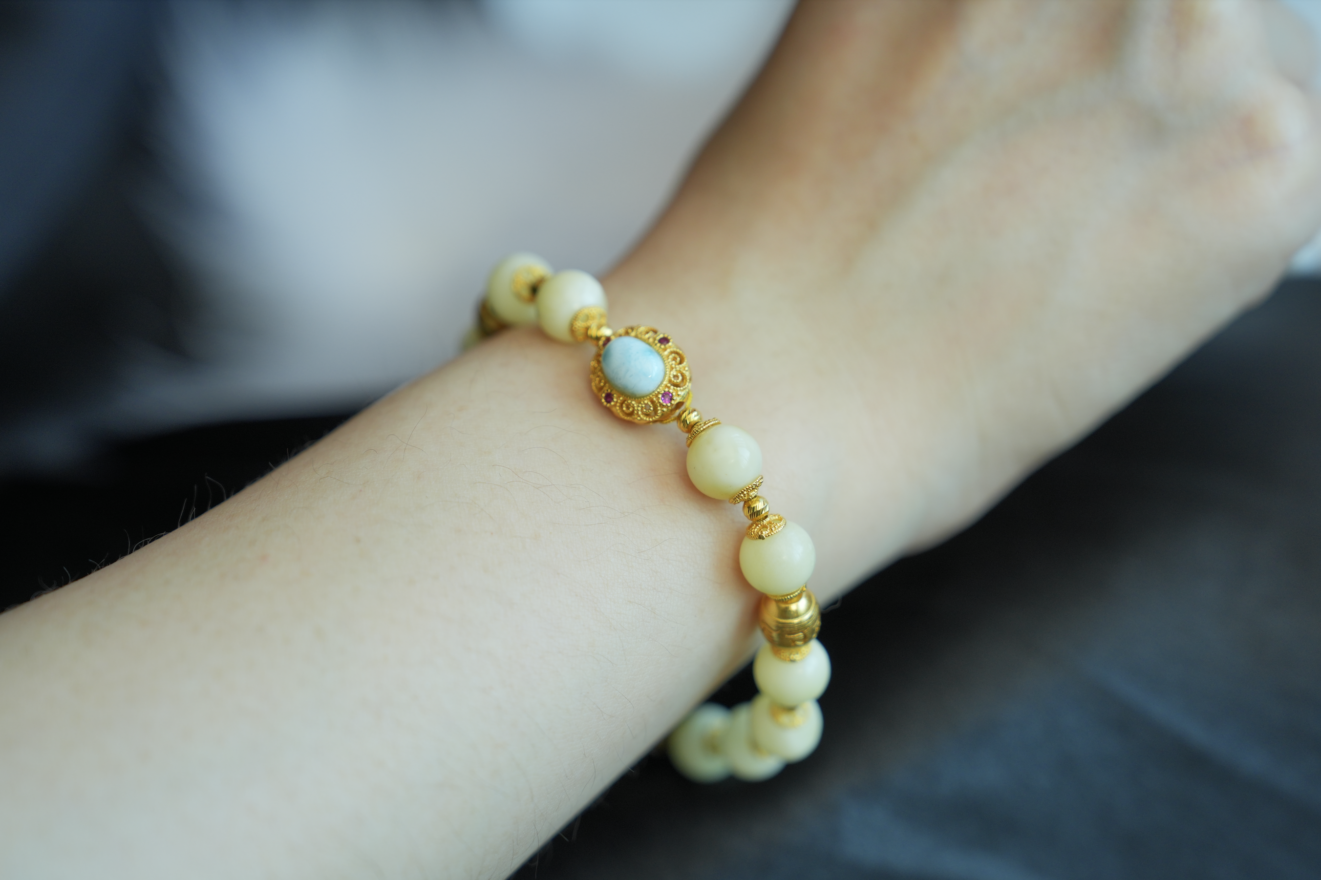 天然原矿白花蜡妖花超精工手串,花纹妖娆漂亮,有层次,颗颗有纹 又白又花 。白蜡极度稀有,产量稀少,大概占整体蜜蜡的百分之一左右。同时白蜡以纯净无杂,白度高,润度好、不干涩的质地很受大家喜爱。经过人体长期佩戴,在温度和油脂的滋养下氧化包浆变色,会使黄白流纹变得层次分明,越发美丽光泽动人。白蜡也称为香珀,它的香味相对于其他蜜蜡琥珀气味更清纯,更醒脑,因为白蜡里面的琥珀酸含量是最高的,能增强人体免疫力,对身体极有好处。