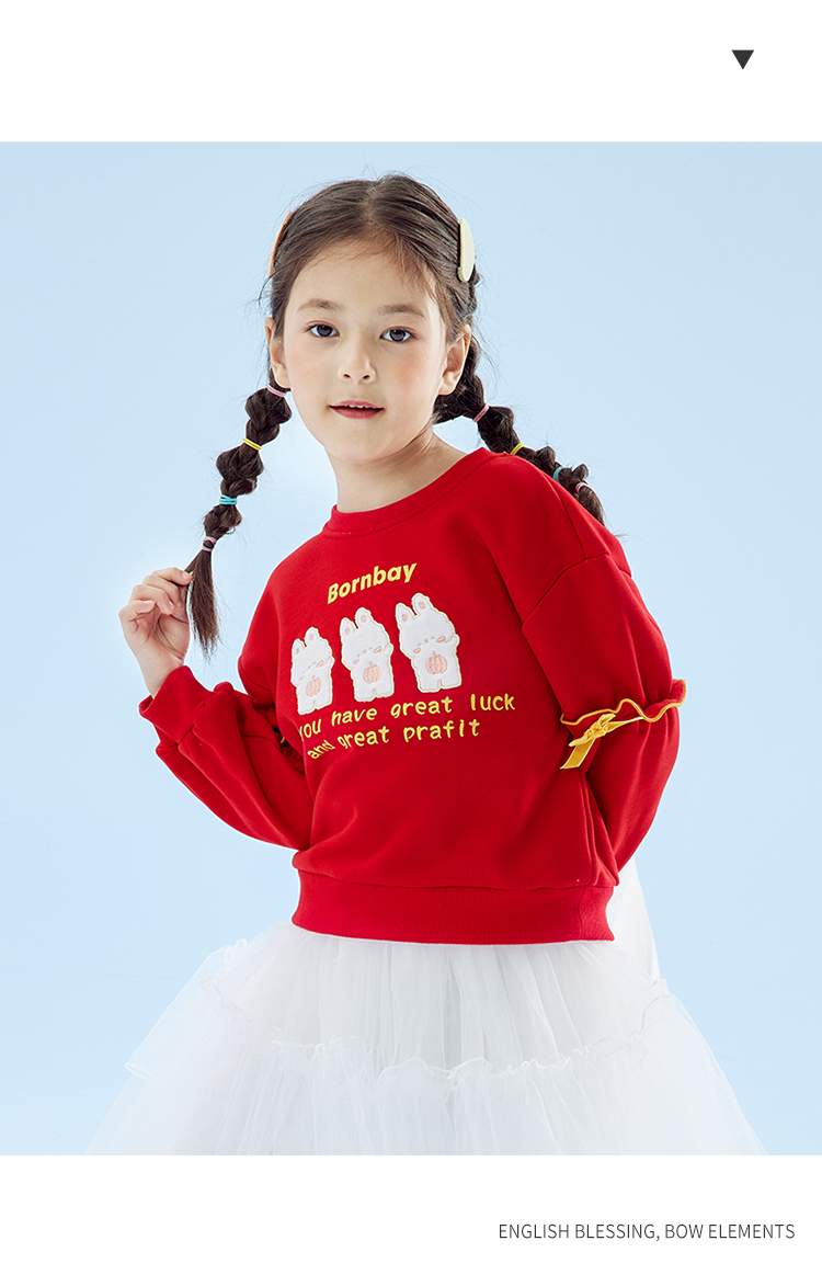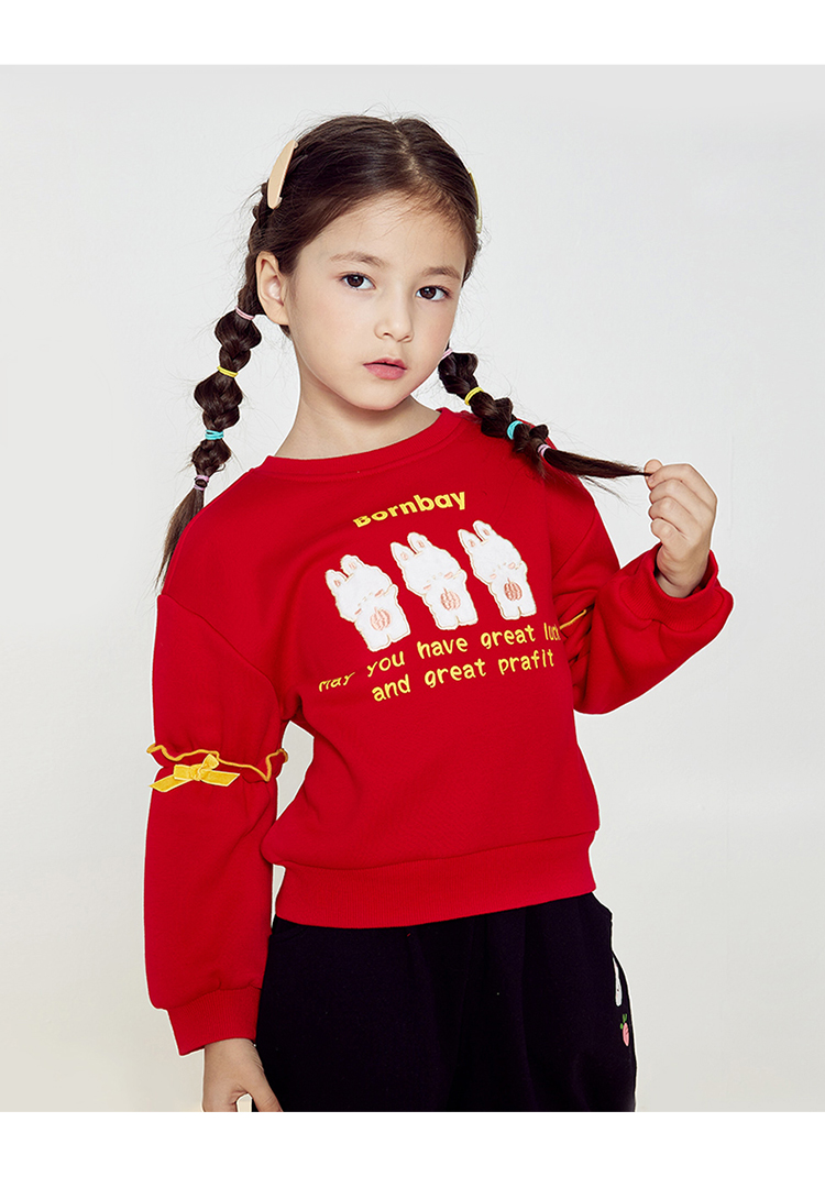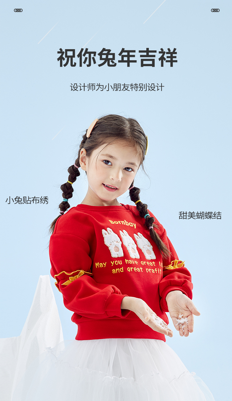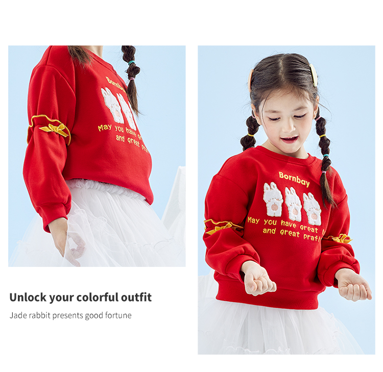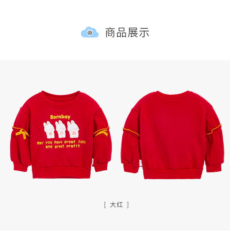贝贝怡 秋冬女童红色喜庆抓绒保暖上衣可爱时尚卫衣223S3085