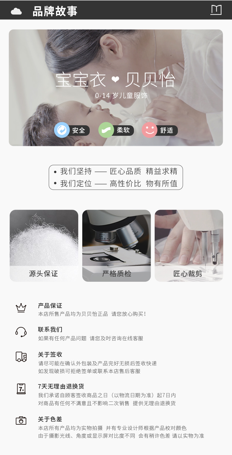 - 贝贝怡专注0-6岁婴幼儿服饰,坚持安全、柔软、舒适的产品理念,为千万中国家庭提供超高品质、安全可靠的婴幼儿服饰产品,妈妈放心,宝宝开心!
