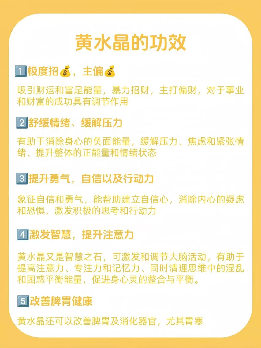 黄水晶被认为具有吸引财富和增强财运的能力特别是对于偏财,因此常被商人和投资者所青睐