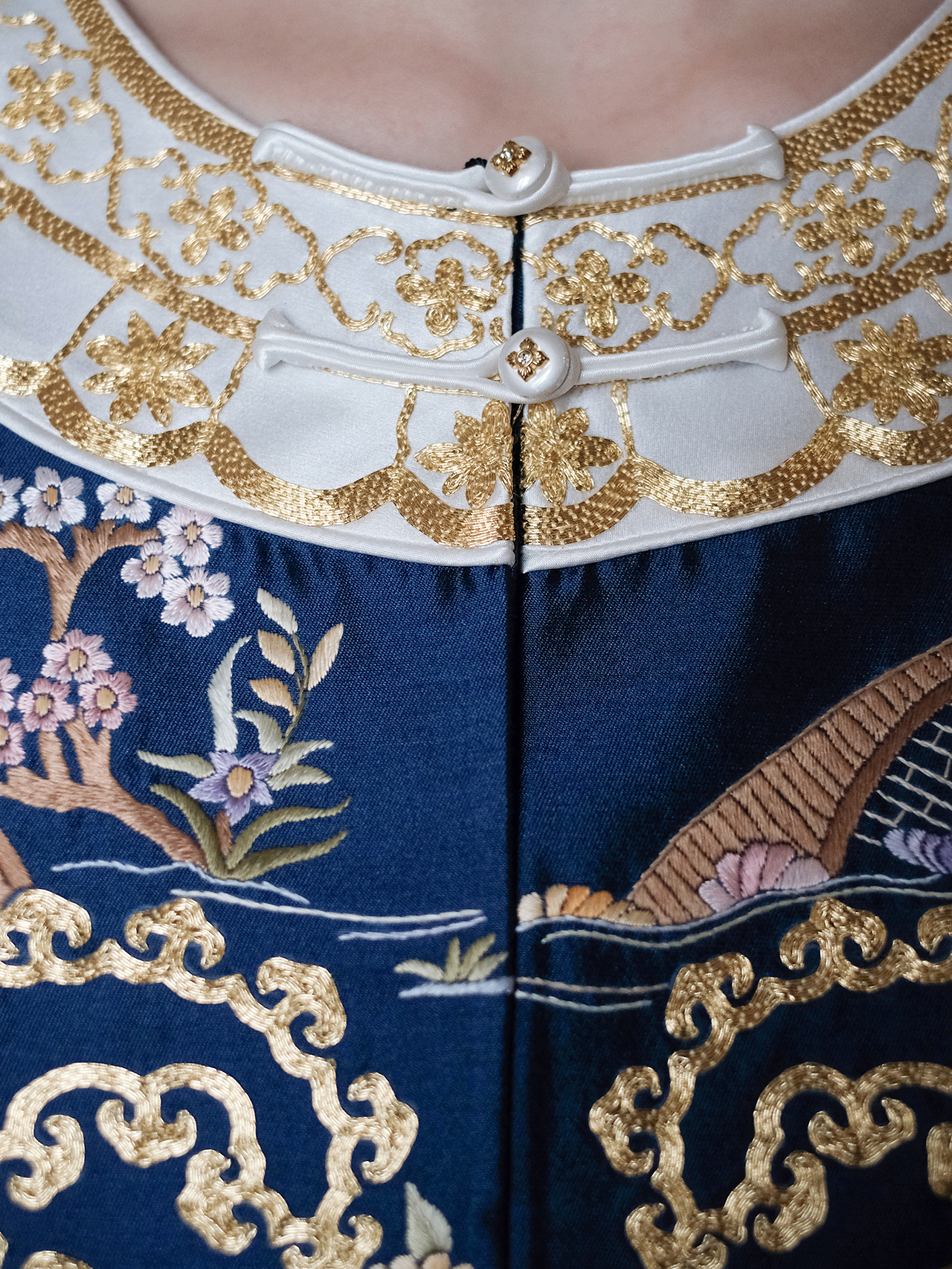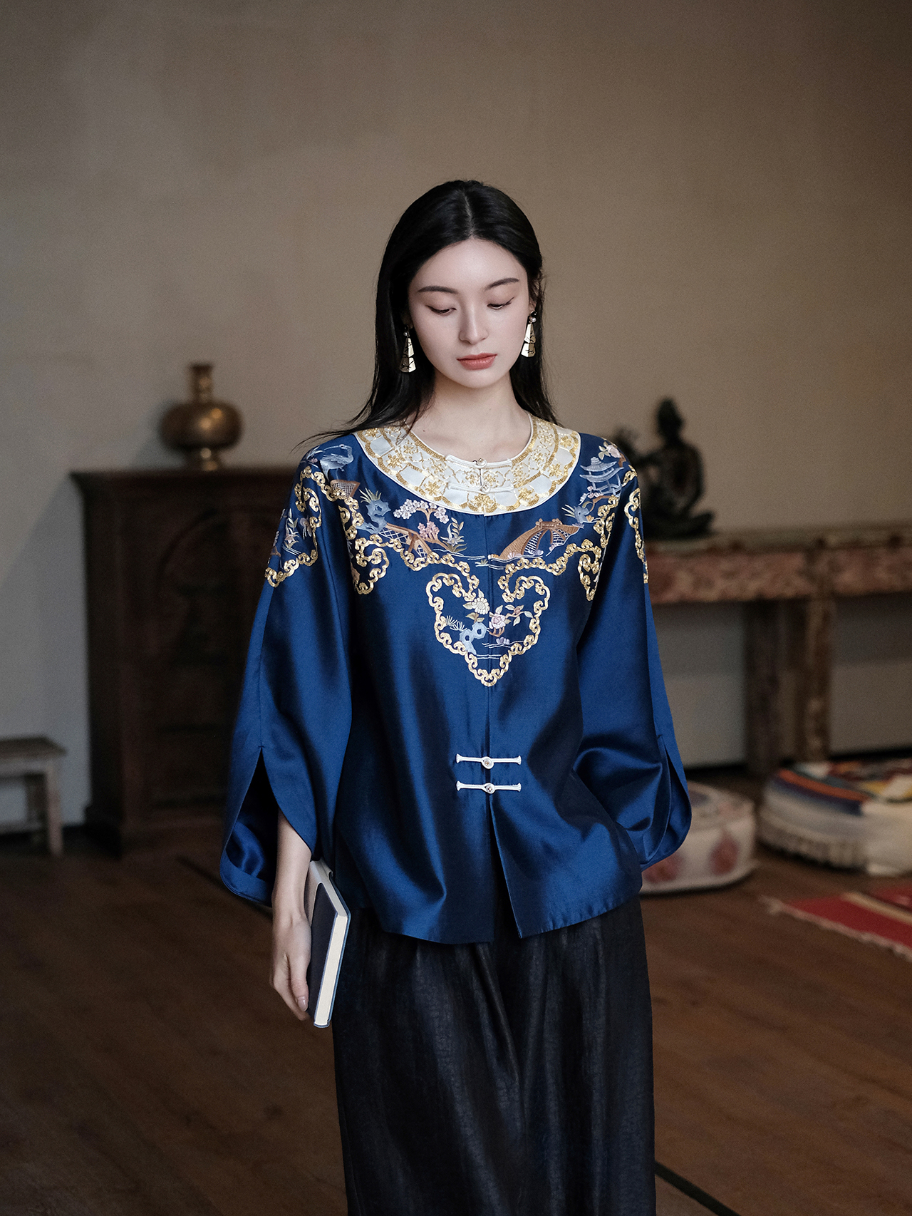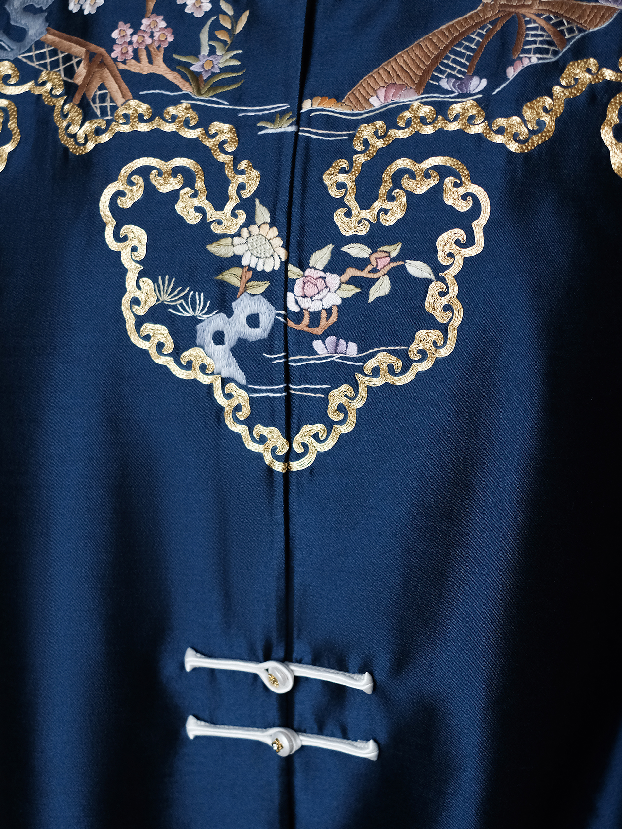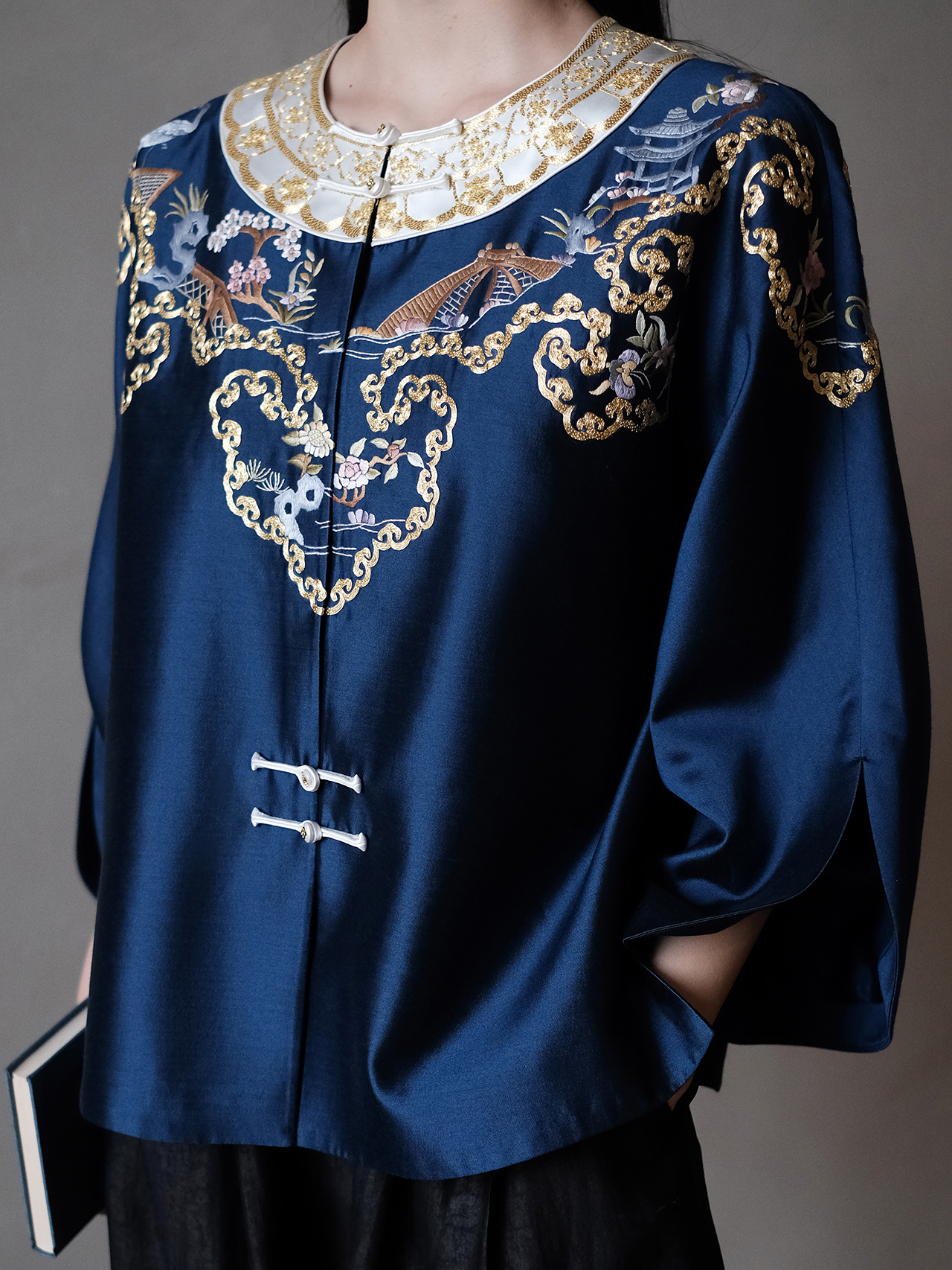 盛唐牡丹大师系列-卢梅红| 金绣游园新中式上衣-蓝色(盛唐牡丹与非遗传承人卢梅红联名系列)