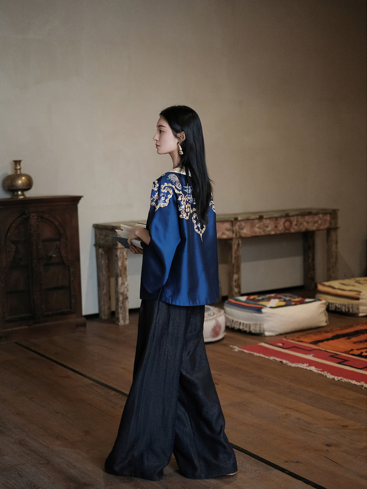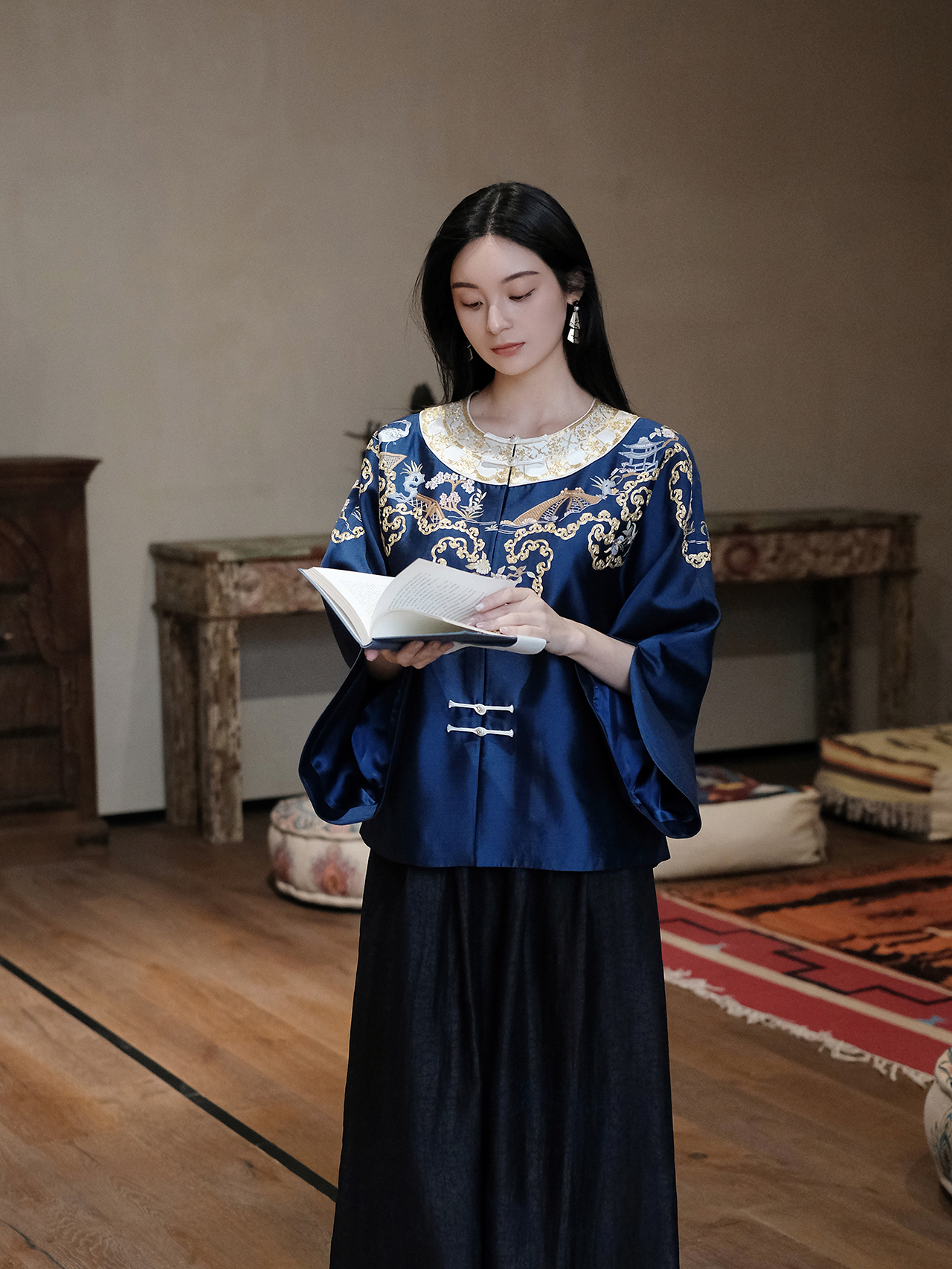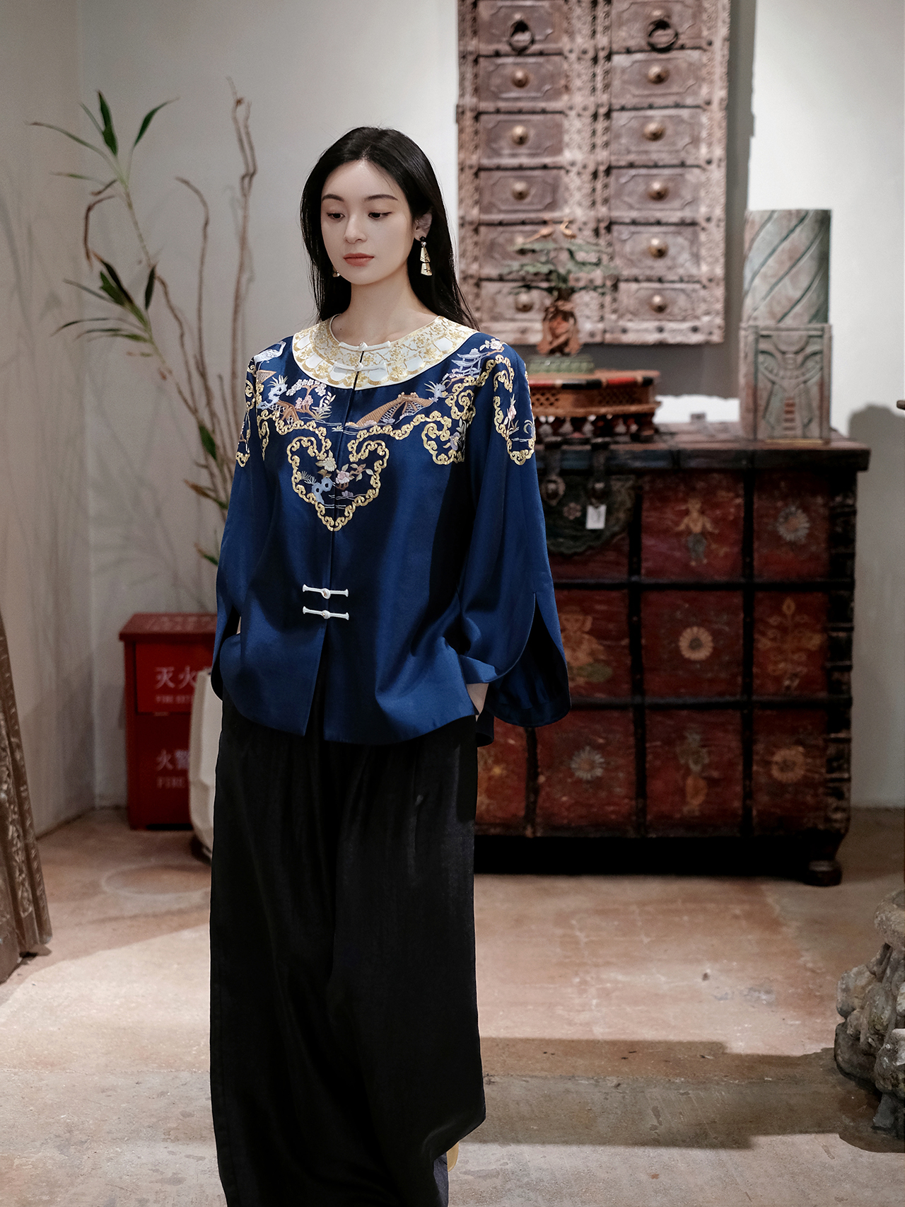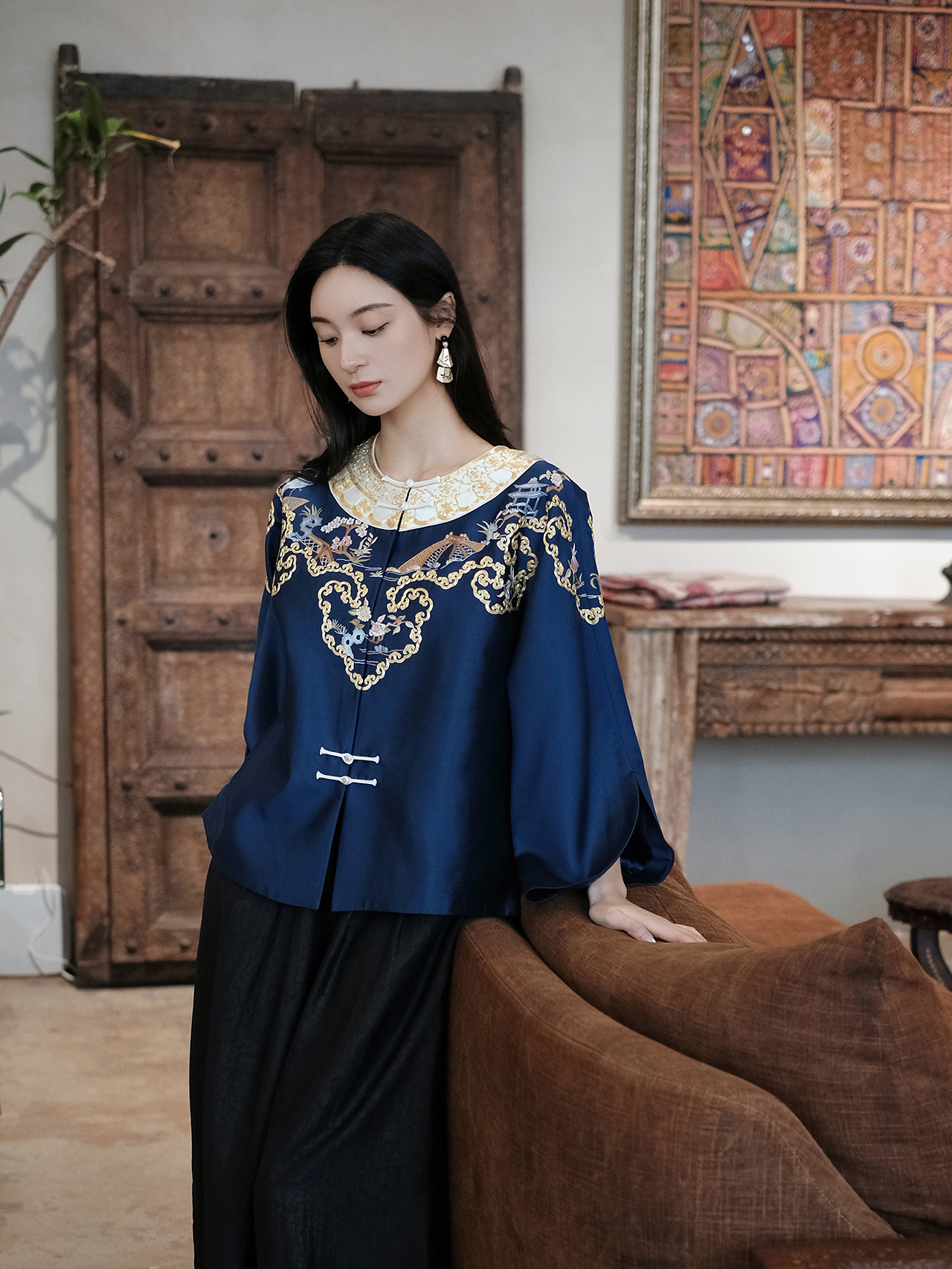 盛唐牡丹大师系列-卢梅红| 金绣游园新中式上衣-蓝色(盛唐牡丹与非遗传承人卢梅红联名系列)