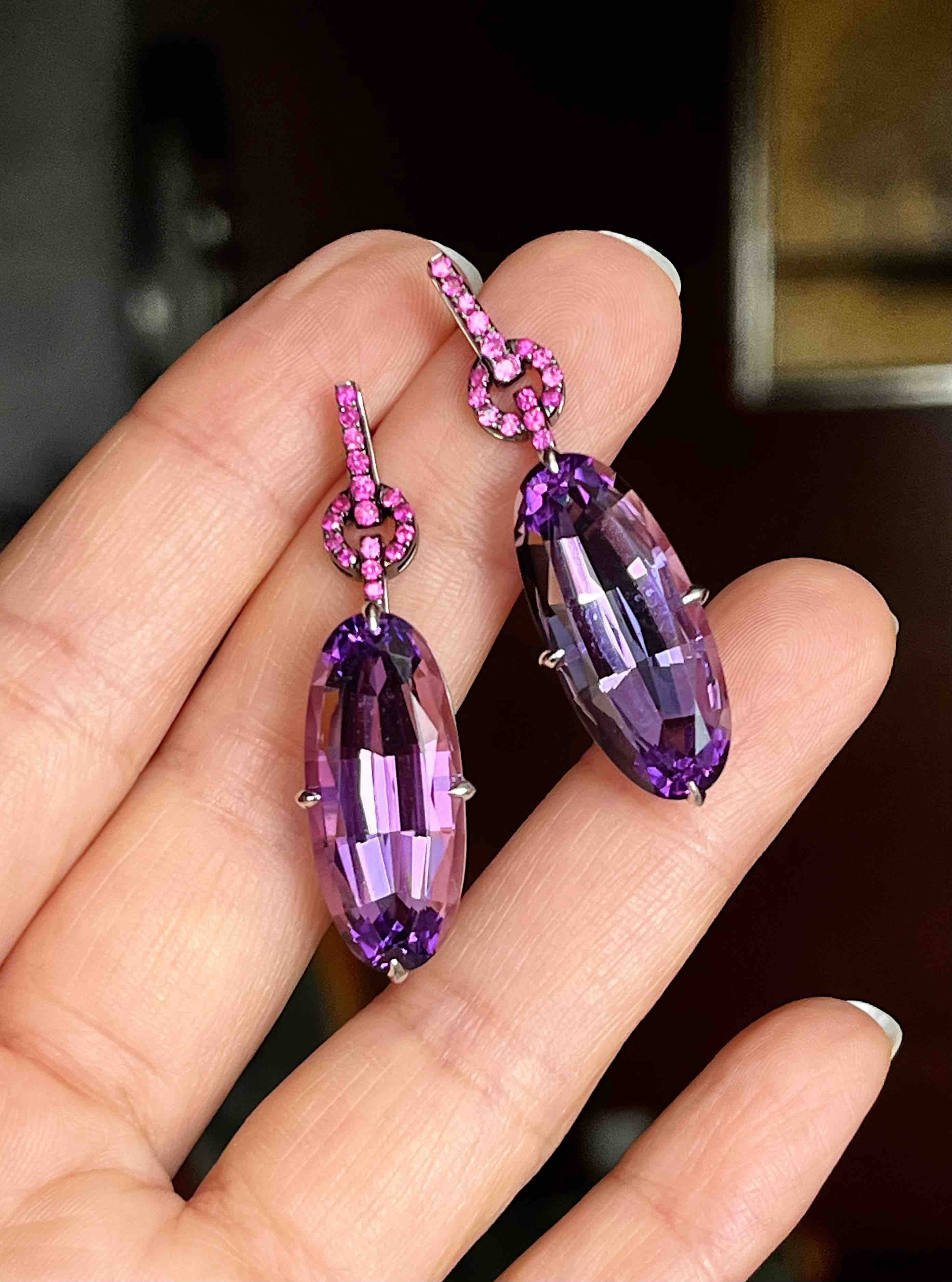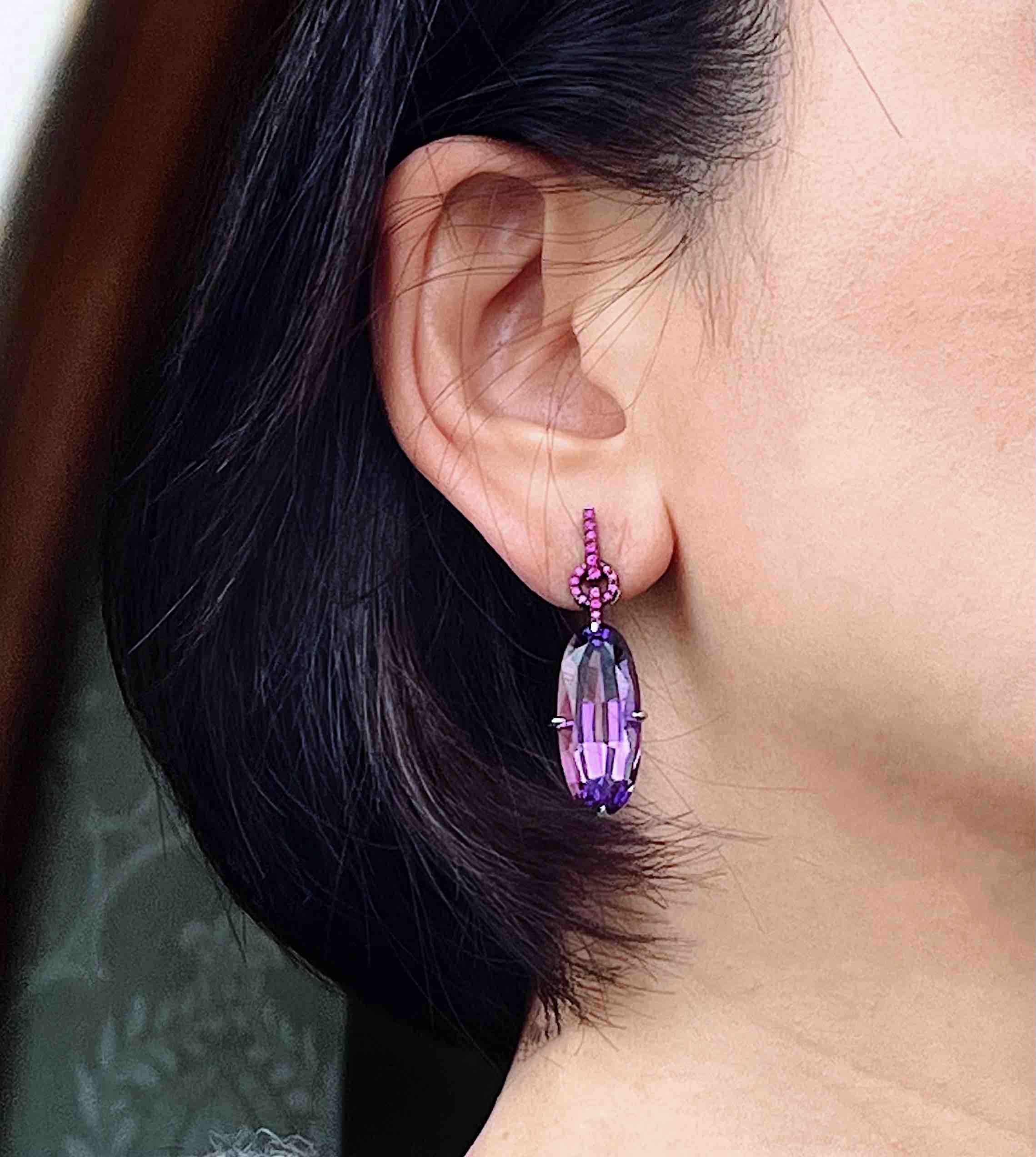 作品名称:18K镶粉色蓝宝石和紫晶耳坠