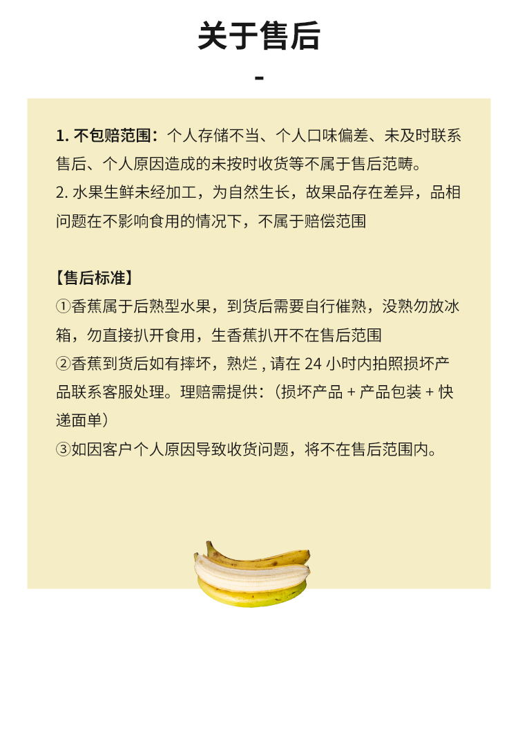 【注意事项】:我们发出的香蕉是根据基地采摘情况发货,无催熟剂,生态自然成熟,具体以收到果子情况为准,催熟时间受催熟方式和催熟温度而定,2-10天不等