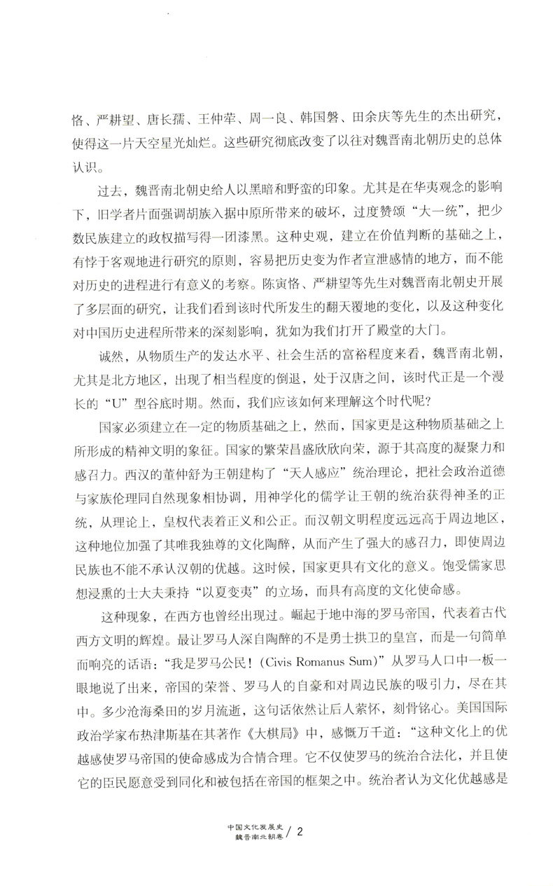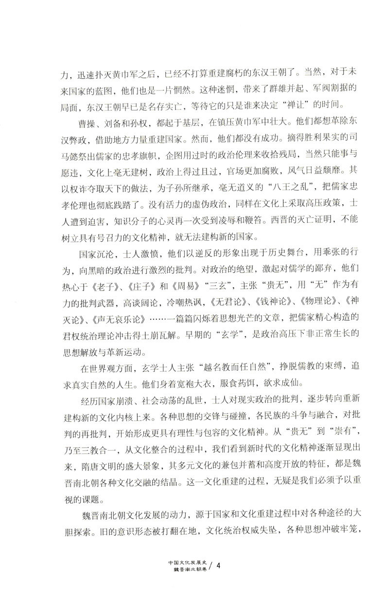 本书论述的文化指包括宗教信仰、风俗习惯、道德情操、学术思想、文学艺术、科学技术、各种制度等意识形态所创造的精神财富,是民族的历史积淀,蕴含着民族智慧和民族精神,是民族生生不息的生命源泉。全书从中国文化赖以形成和发展的社会生活环境入手,论述了魏晋南北朝时期的主流文化,以及各种文化在特定历史条件下的变异,从而切实把握住中华文化的特质,展现出中国文化的发展趋向和规律,彰显出中国文化的民族精神。本书论述的文化指包括宗教信仰、风俗习惯、道德情操、学术思想、文学艺术、科学技术、各种制度等意识形态所创造的精神财富,是民族的历史积淀,蕴含着民族智慧和民族精神,是民族生生不息的生命源泉。全书从中国文化赖以形成和发展的社会生活环境入手,论述了魏晋南北朝时期的主流文化,以及各种文化在特定历史条件下的变异,从而切实把握住中华文化的特质,展现出中国文化的发展趋向和规律,彰显出中国文化的民族精神。