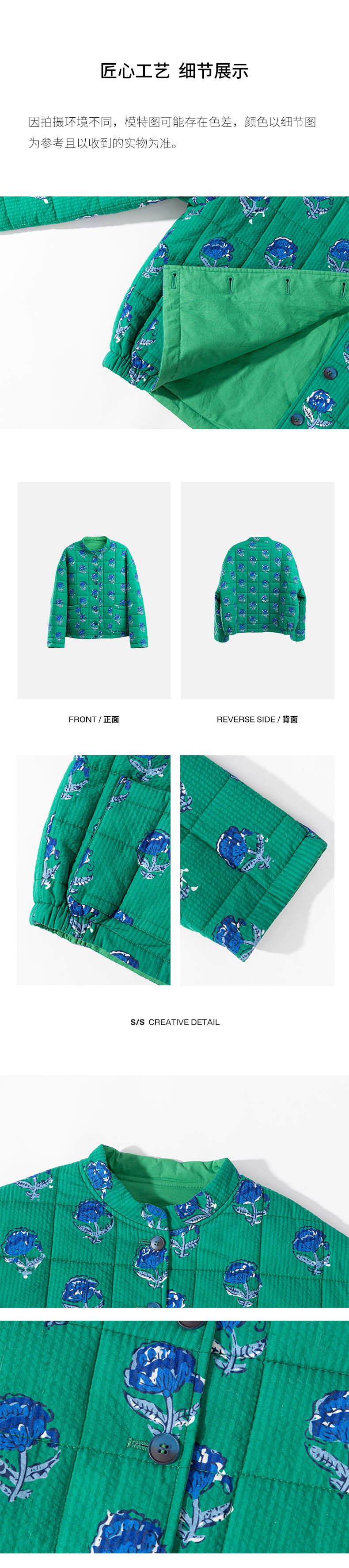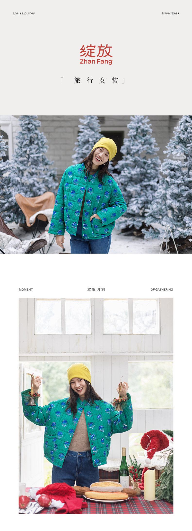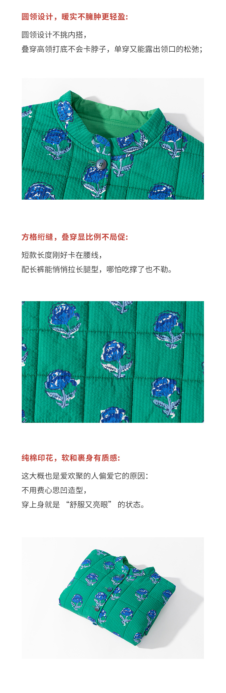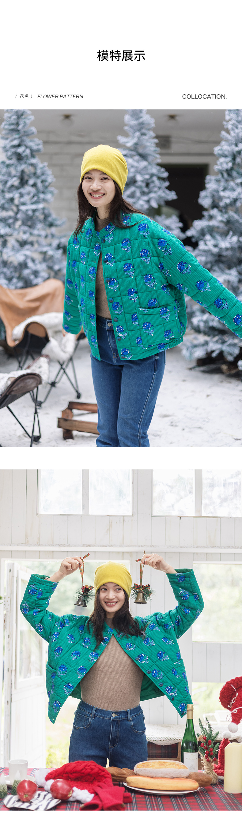 特绽放853朵/暖绿印花方格短棉服·全棉加厚保暖显高短款圆领棉衣